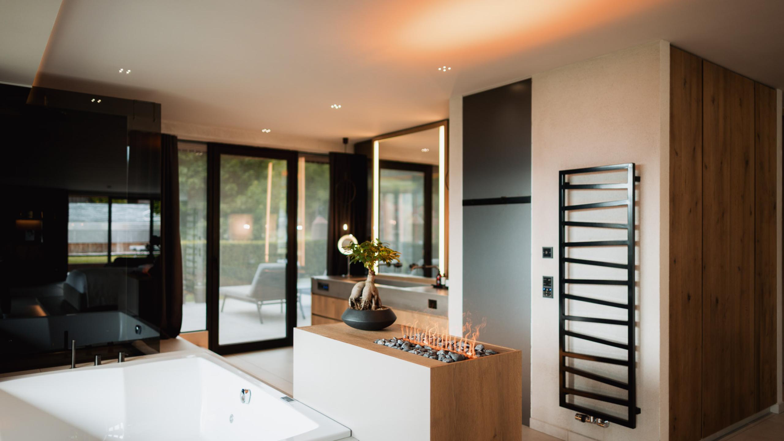 2 Schlafzimmer, jeweils mit Badezimmer, separates WC, offener Wohnraum, privater Pool, private Sauna und Whirlpool sowie 2 Terrassen und großer Garten (Außenbereich gesamt: 290 m²)