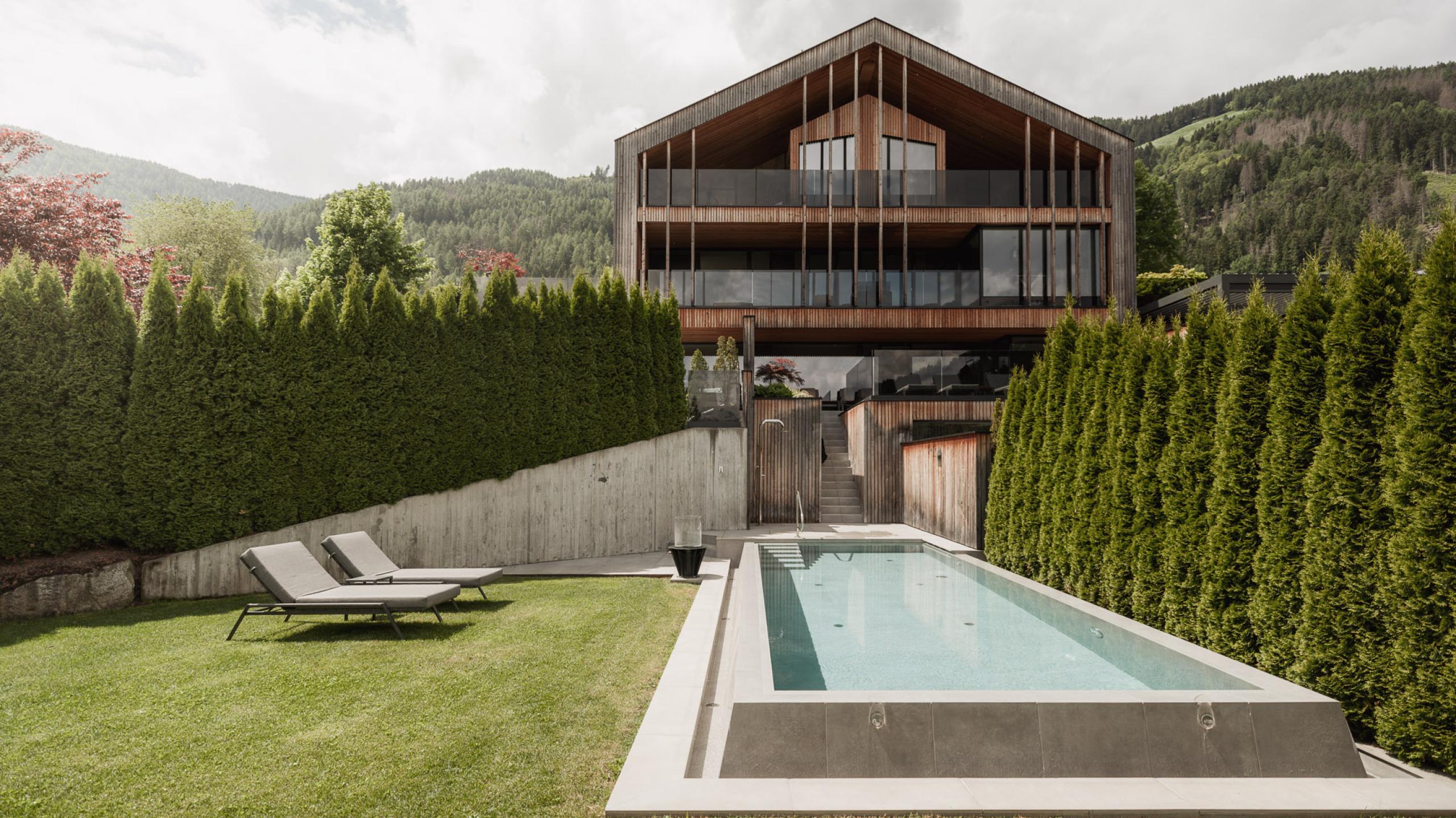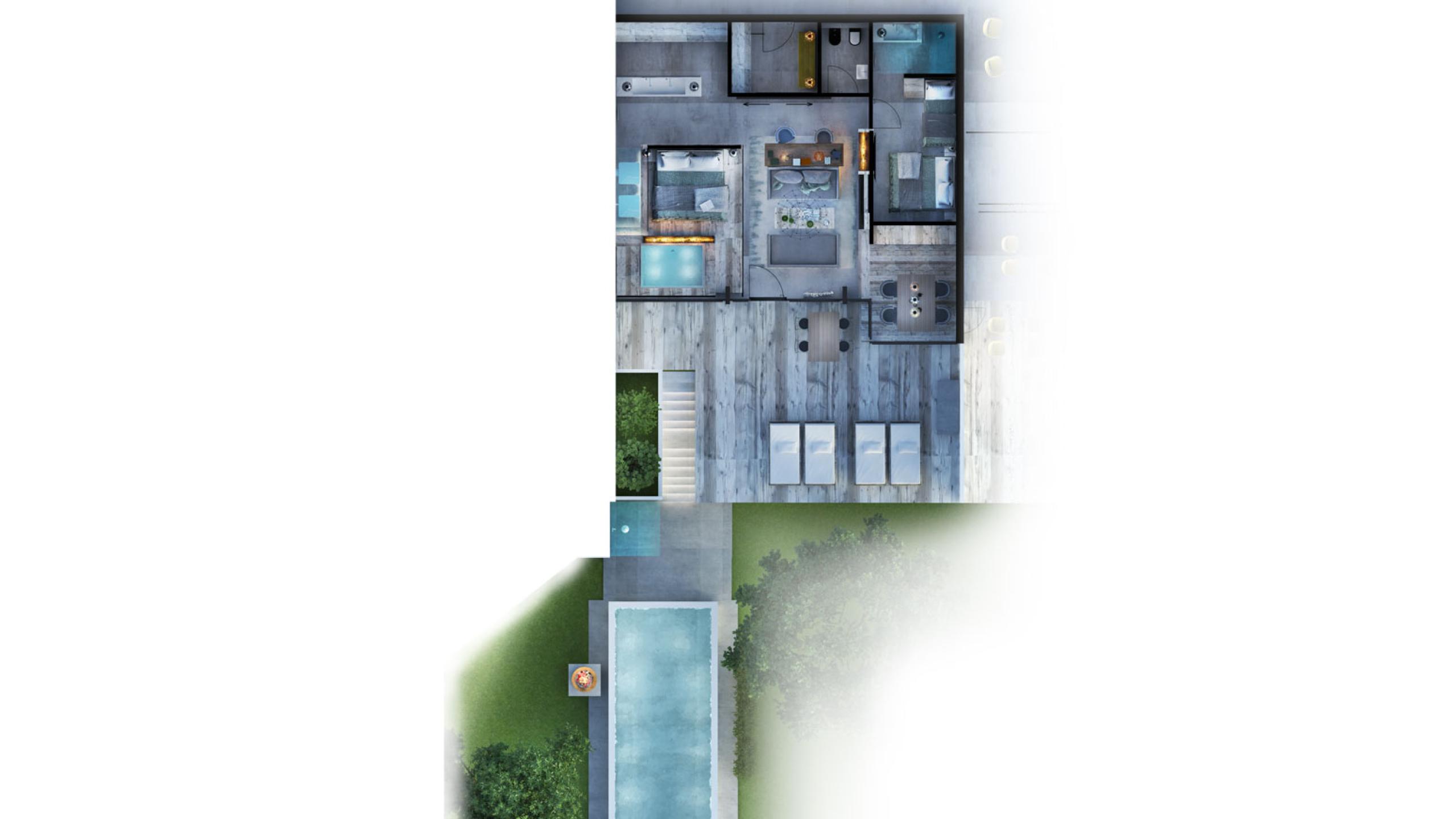 2 bedrooms, each with bathroom, separate toilet, open living room, private pool (8 x 3 m), whirlpool and loggia (total outdoor area: 110 m²)