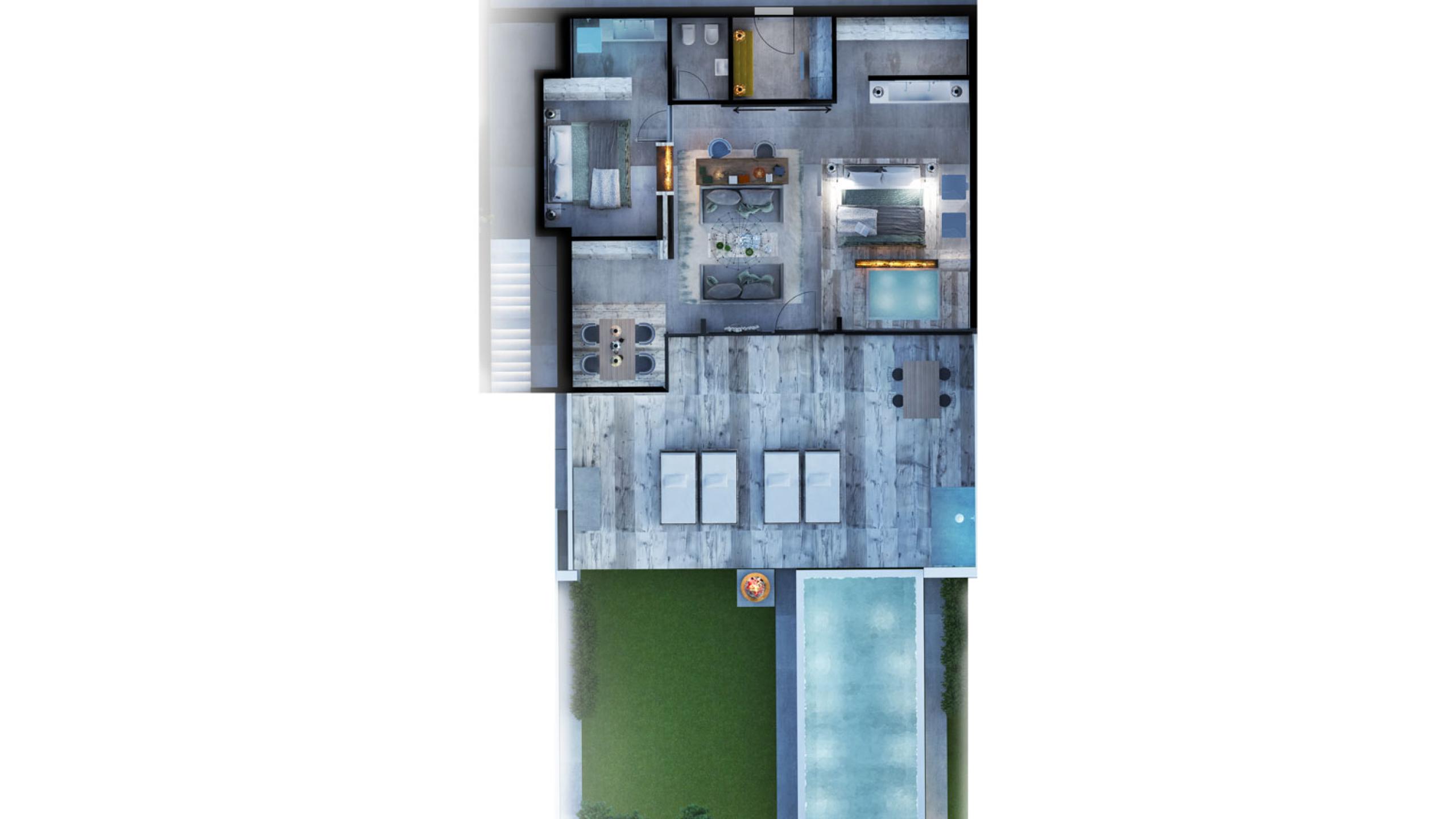 2 bedrooms each with bath room, separate toilet, open living room, private pool (8 x 3 m), whirlpool and loggia (total outdoor area: 130 m²)