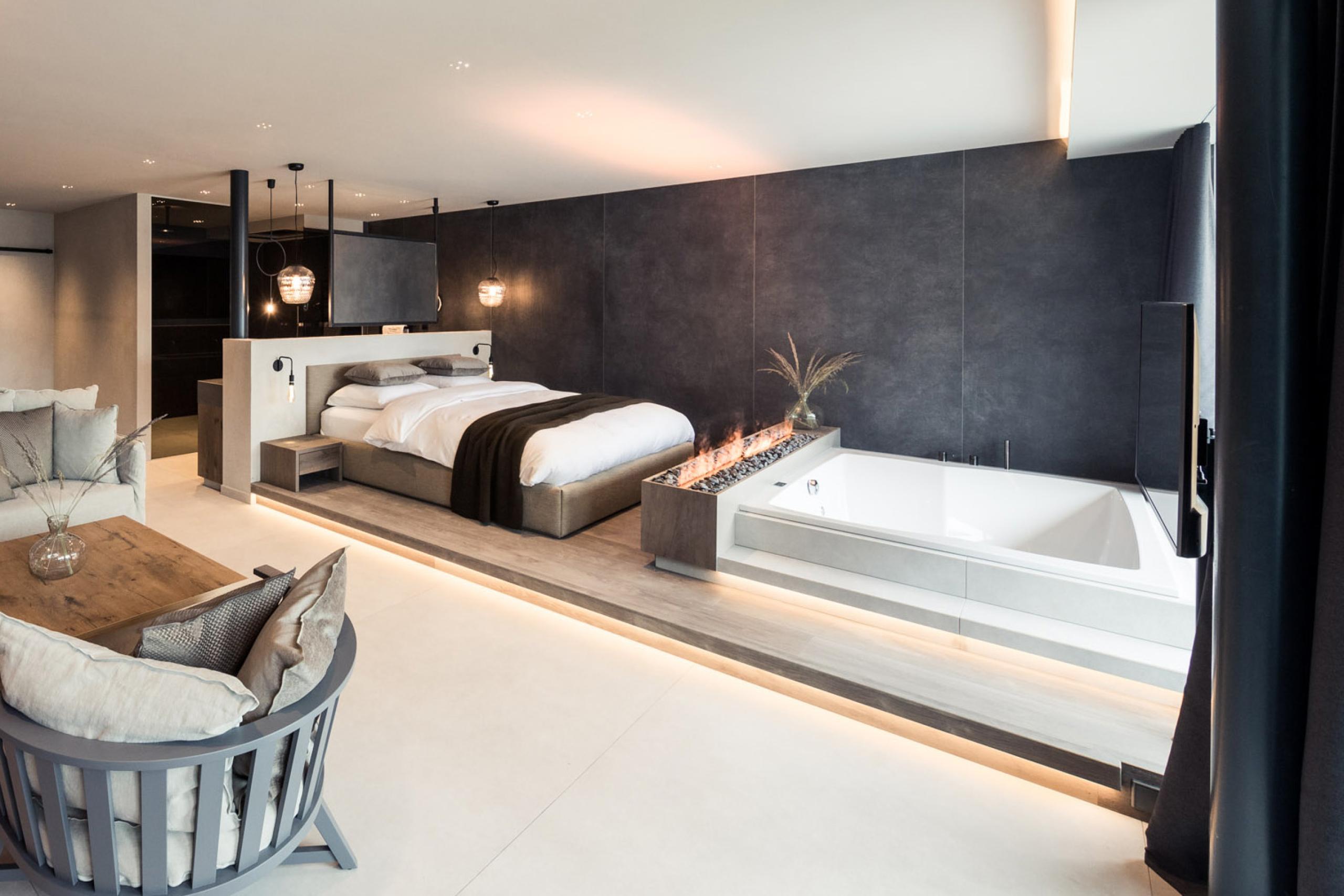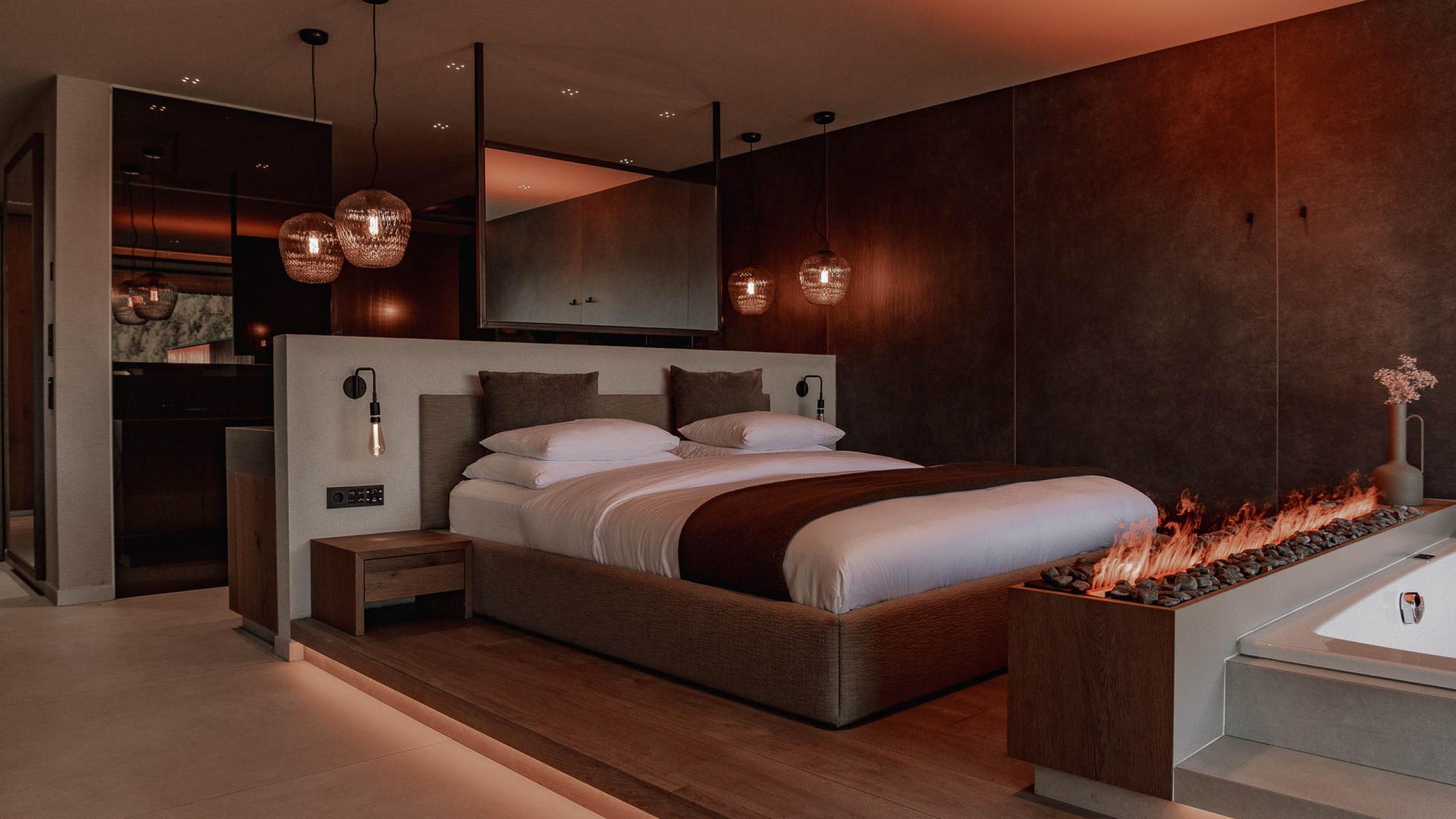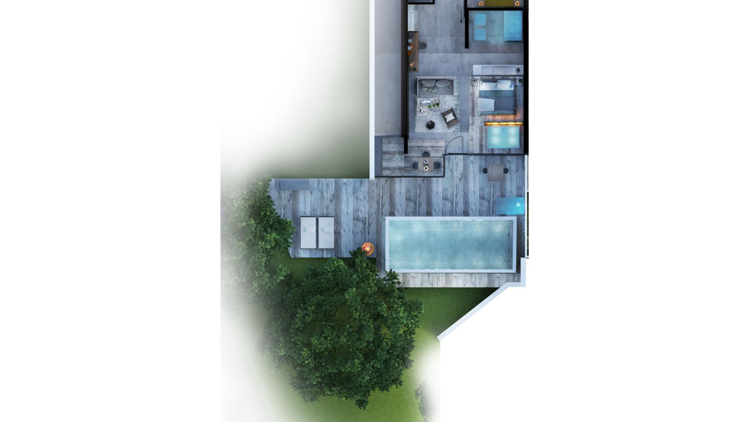 1 bedroom, bath with sensory sky shower as highlight, separate toilet, open living room, private pool (8 x 3 m), whirlpool and loggia (total outdoor area: 100 m²)