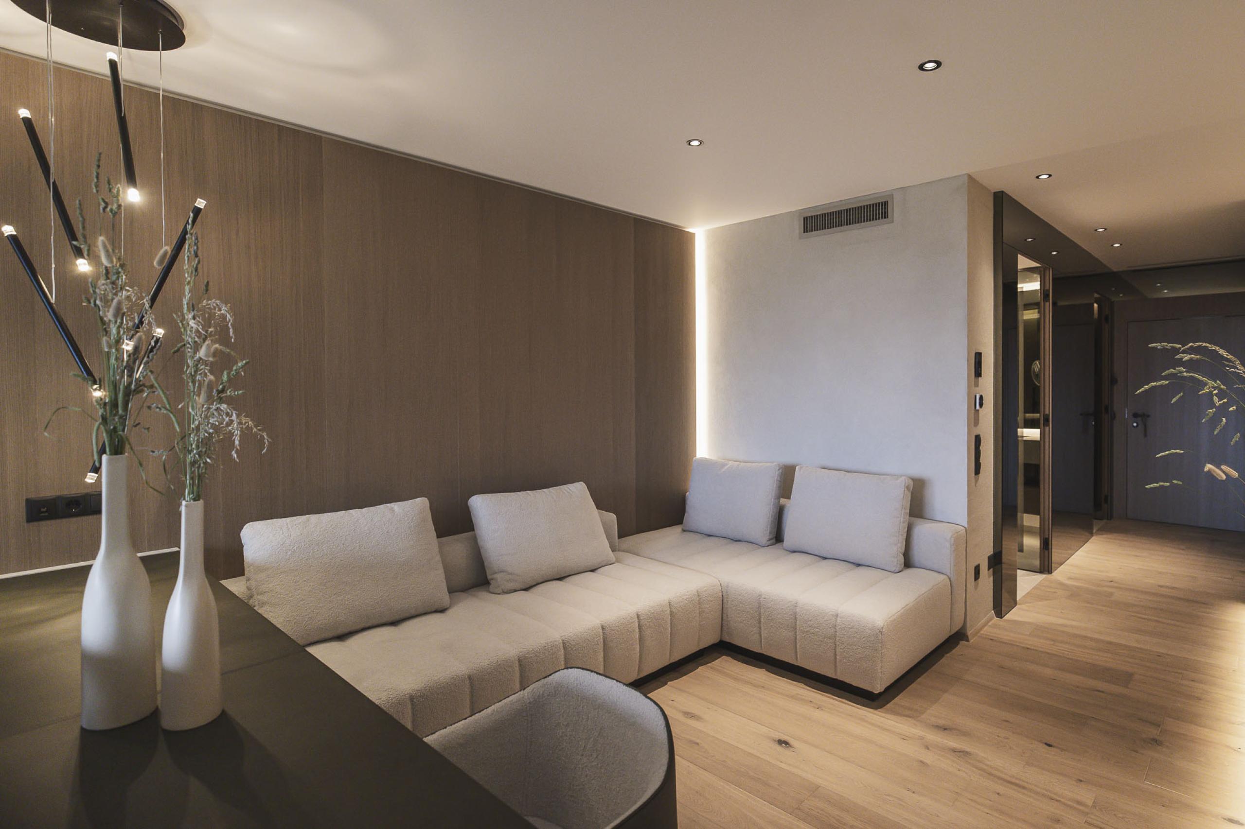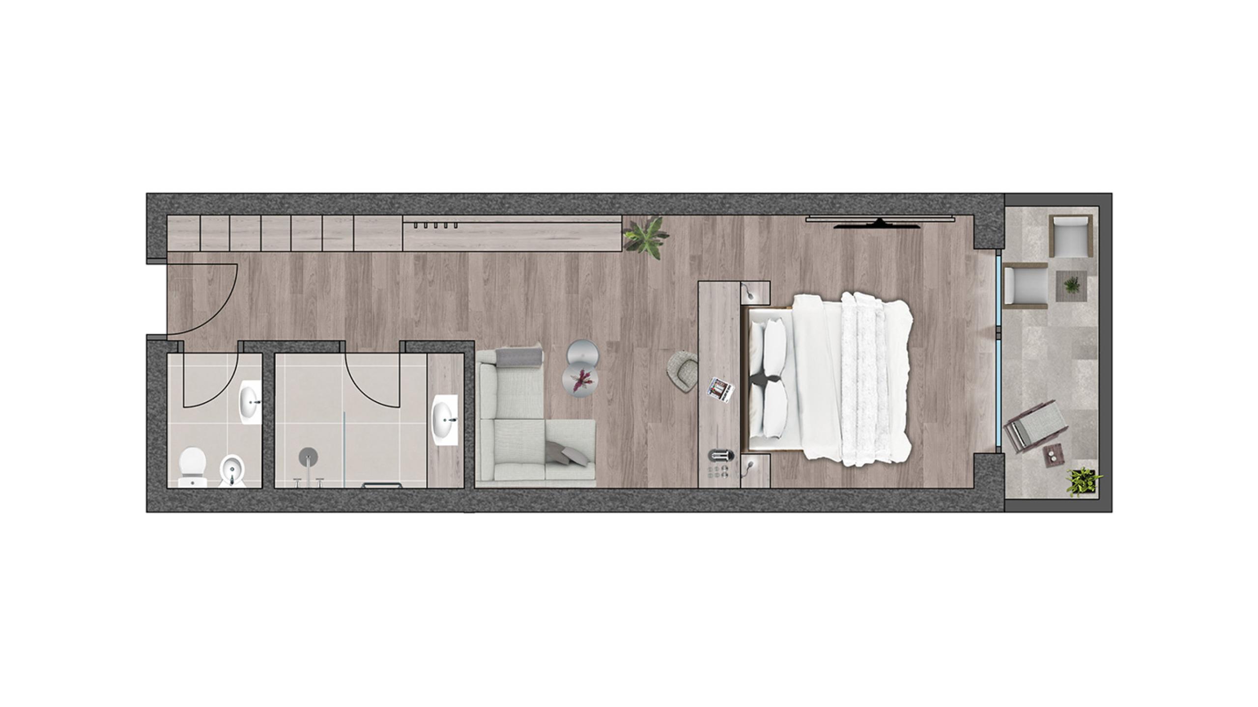 New modern design suite with air conditioning, coffee machine, bathroom with separate WC and balcony with pool view.