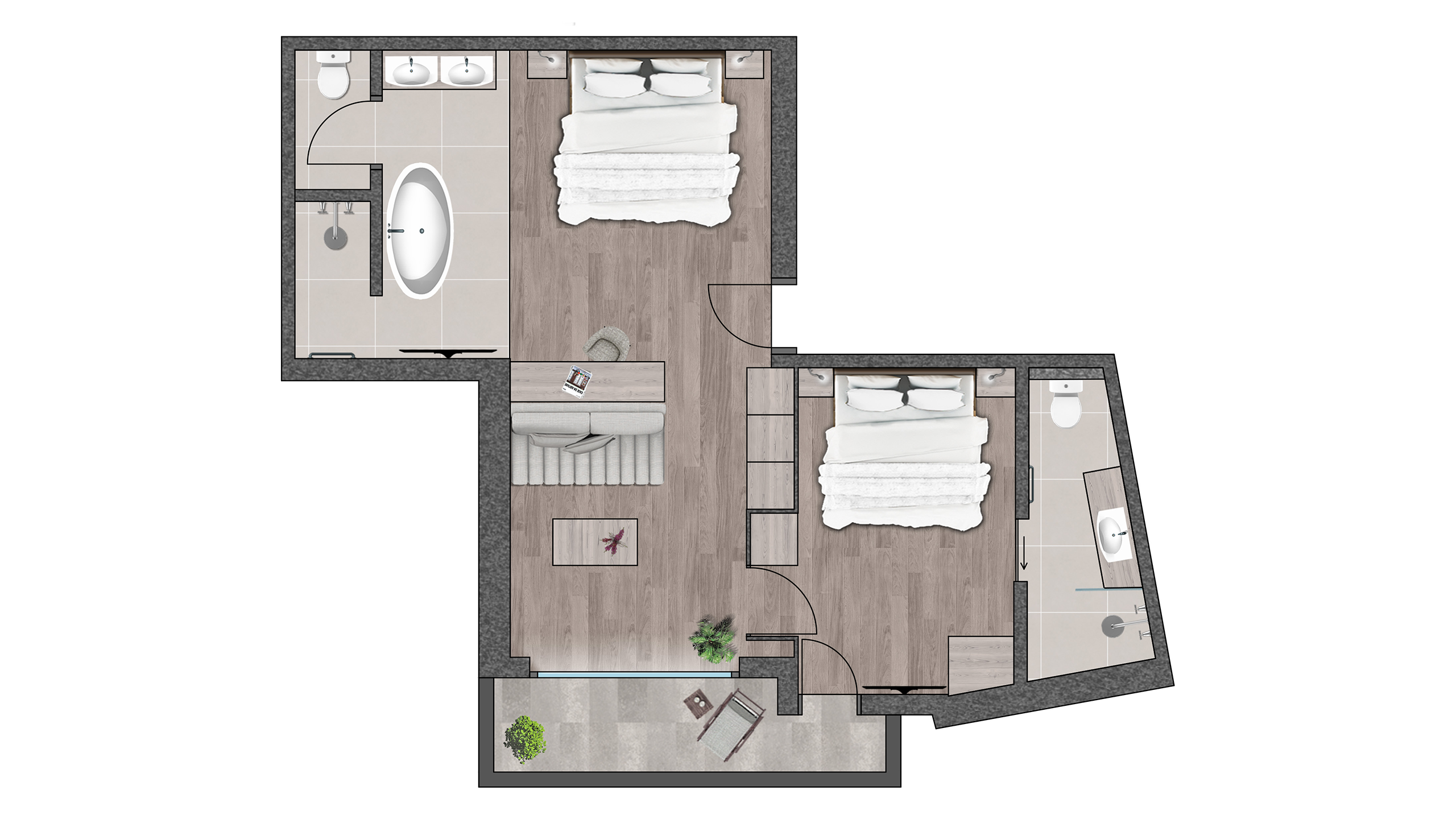 Spacious suite with two separate bedrooms and two bathrooms.