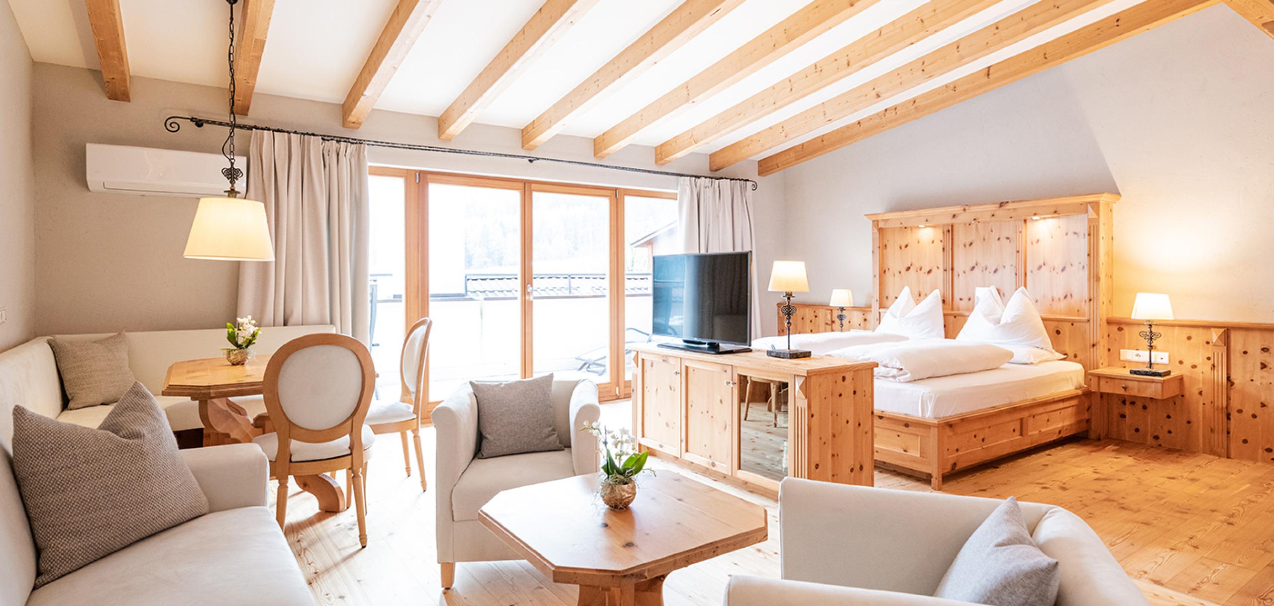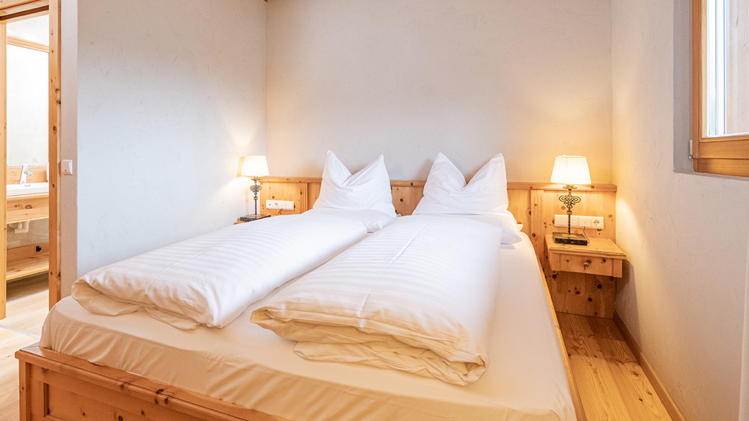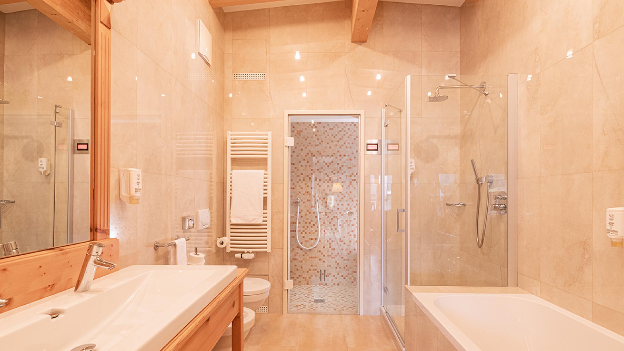 Spacious suite with fragrant Swiss stone-pine furnishings, consisting of a bedroom with bathroom including a steam bath cabin, and a separated bedroom with bathroom for the children and air conditioning.