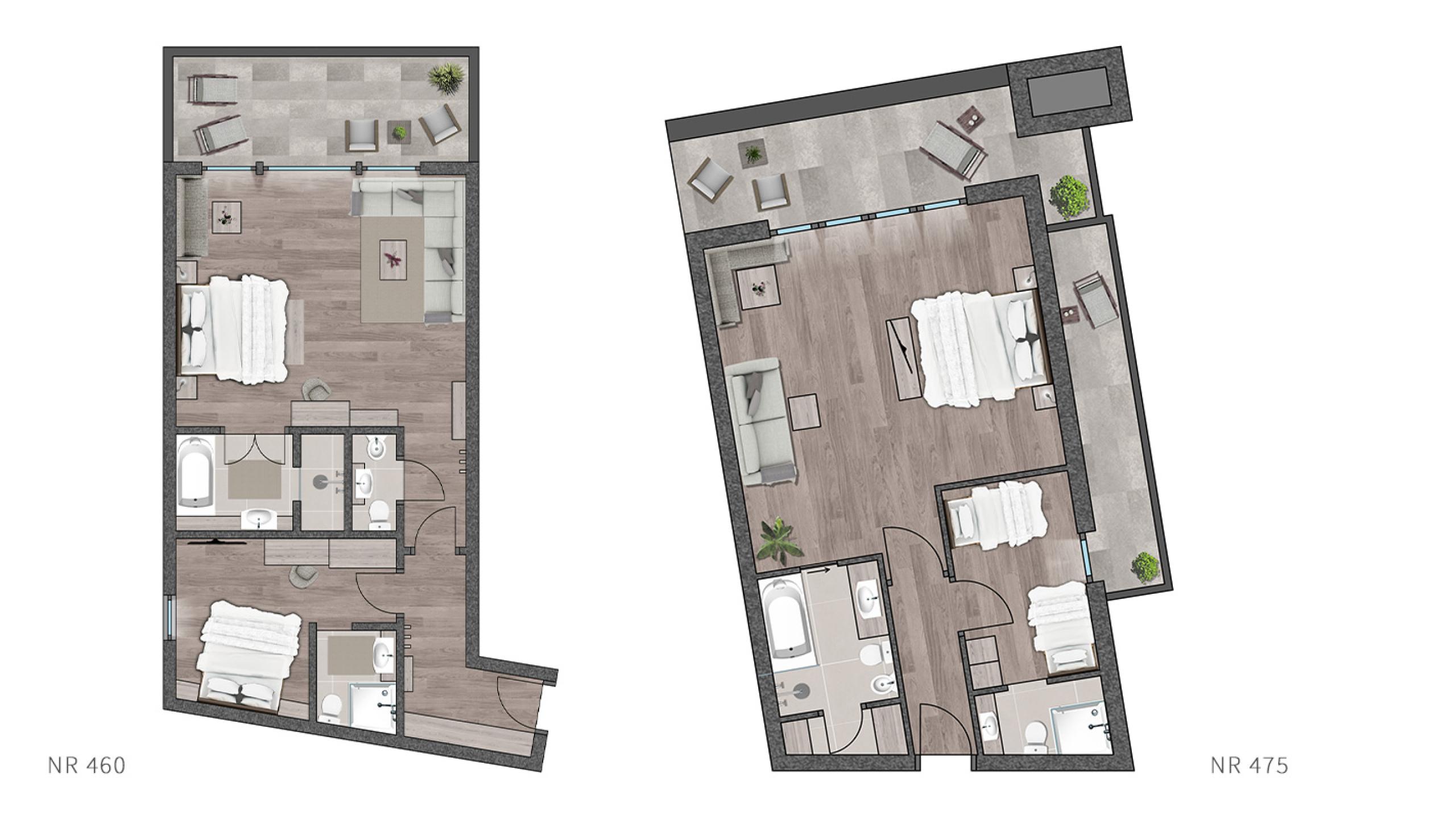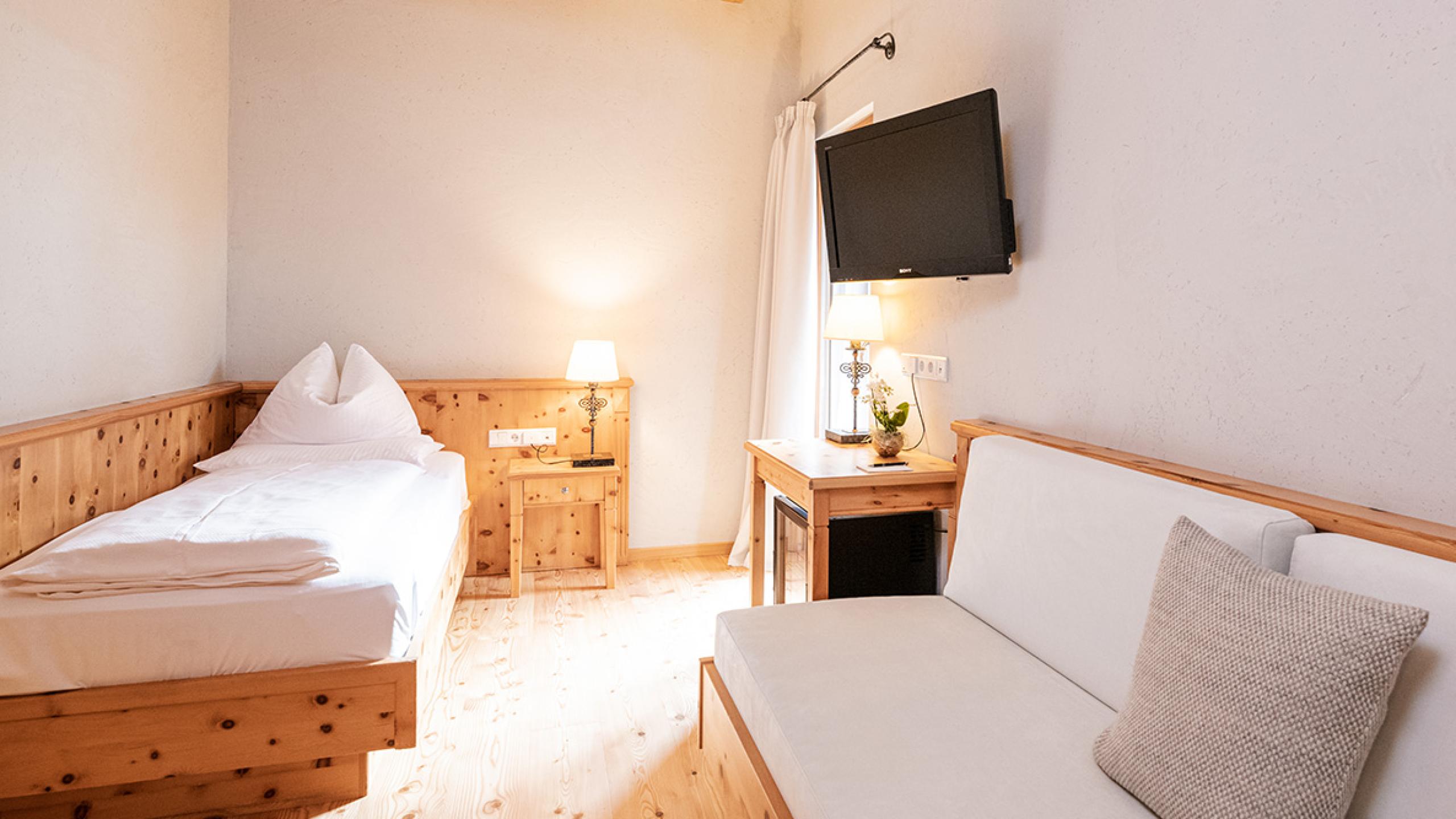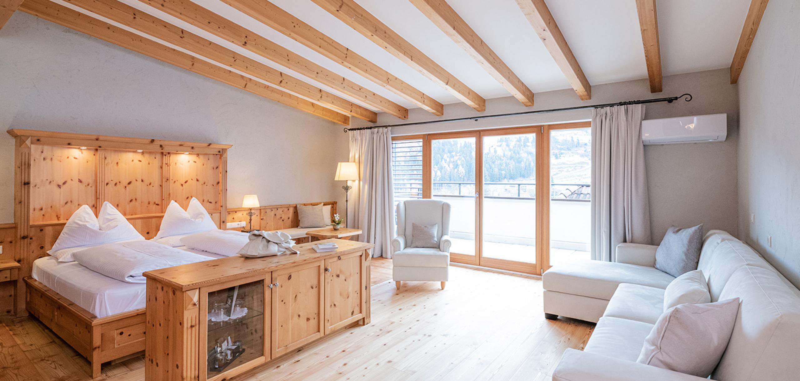 Spacious suite with fragrant Swiss stone-pine furnishings, consisting of a bedroom with bathroom including a steam bath cabin, and a separated bedroom with bathroom for the children and air conditioning.