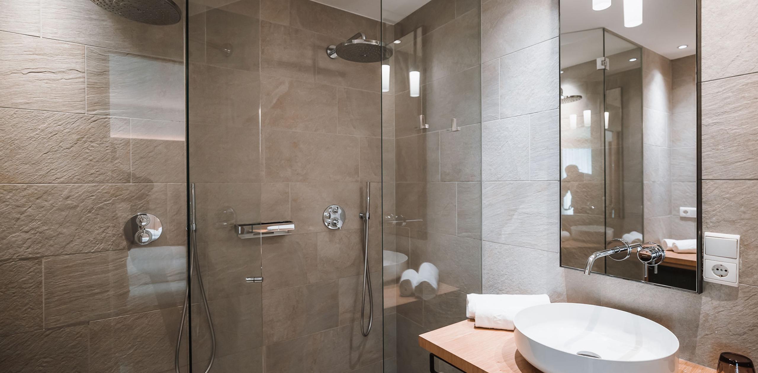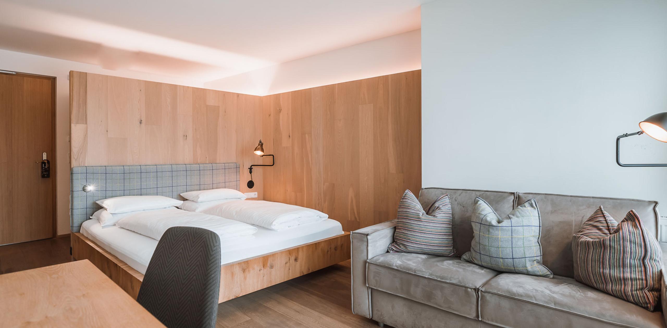 The Family Suite Kronplatz in the pre-existing building welcomes you with its south-facing orientation and views of the Kronplatz, located in a sunny spot. The suite features wooden flooring, air conditioning and includes a separate children’s room with a bunk bed (1.8 m) and a single bed (1.8 m). The spacious bathroom is equipped with a large shower, separate toilet, and bidet. A balcony, perfect for enjoying the sunshine, completes the offering.