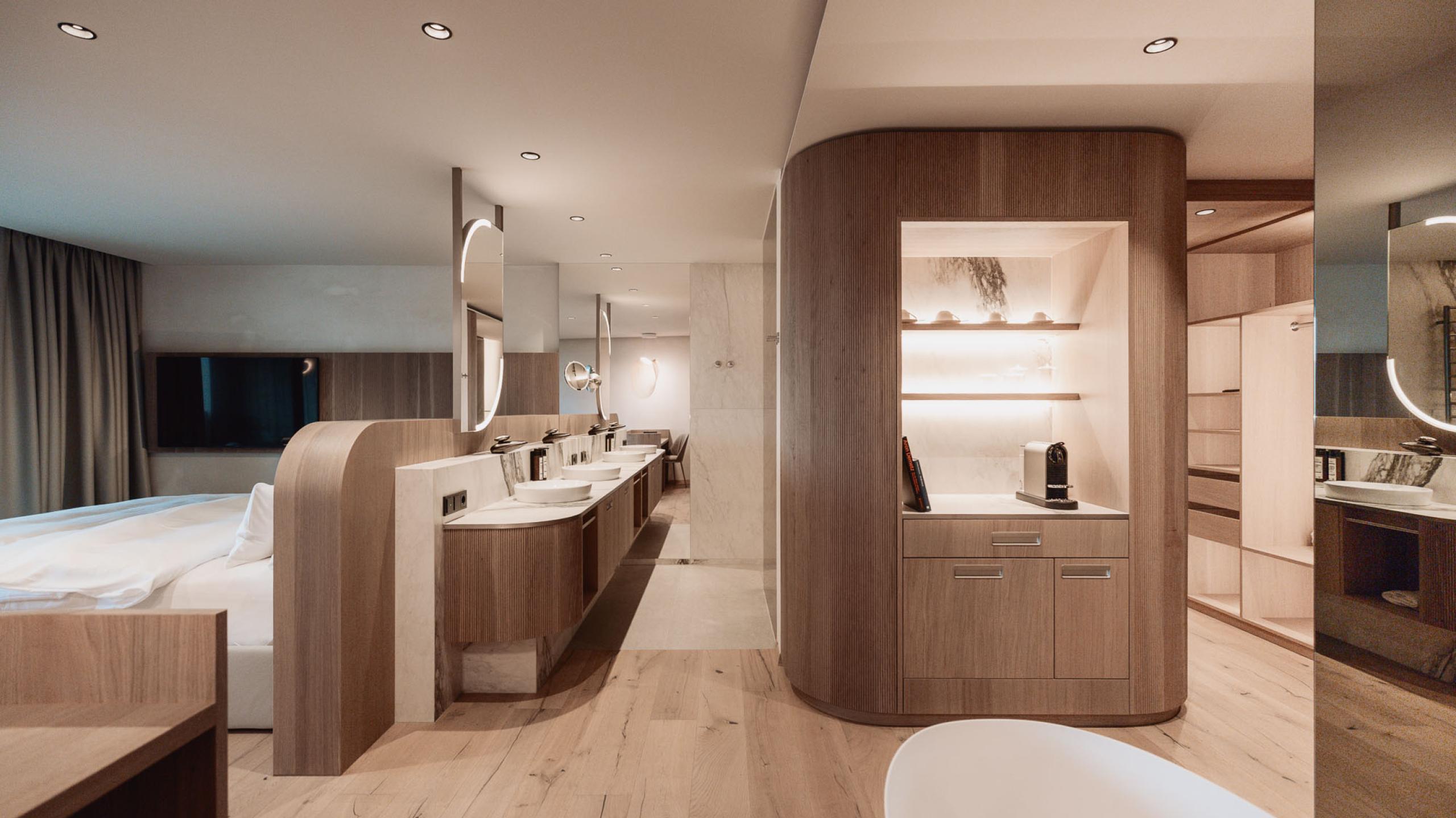 The Suite Sol welcomes you with premium wooden flooring, air conditioning, a stylish double bed, a sofa bed, a freestanding bathtub, and a loggia. The south-facing terrace (15m²) offers a picturesque view of the mountains toward the Kronplatz. A walk-in closet completes the exclusive offering.