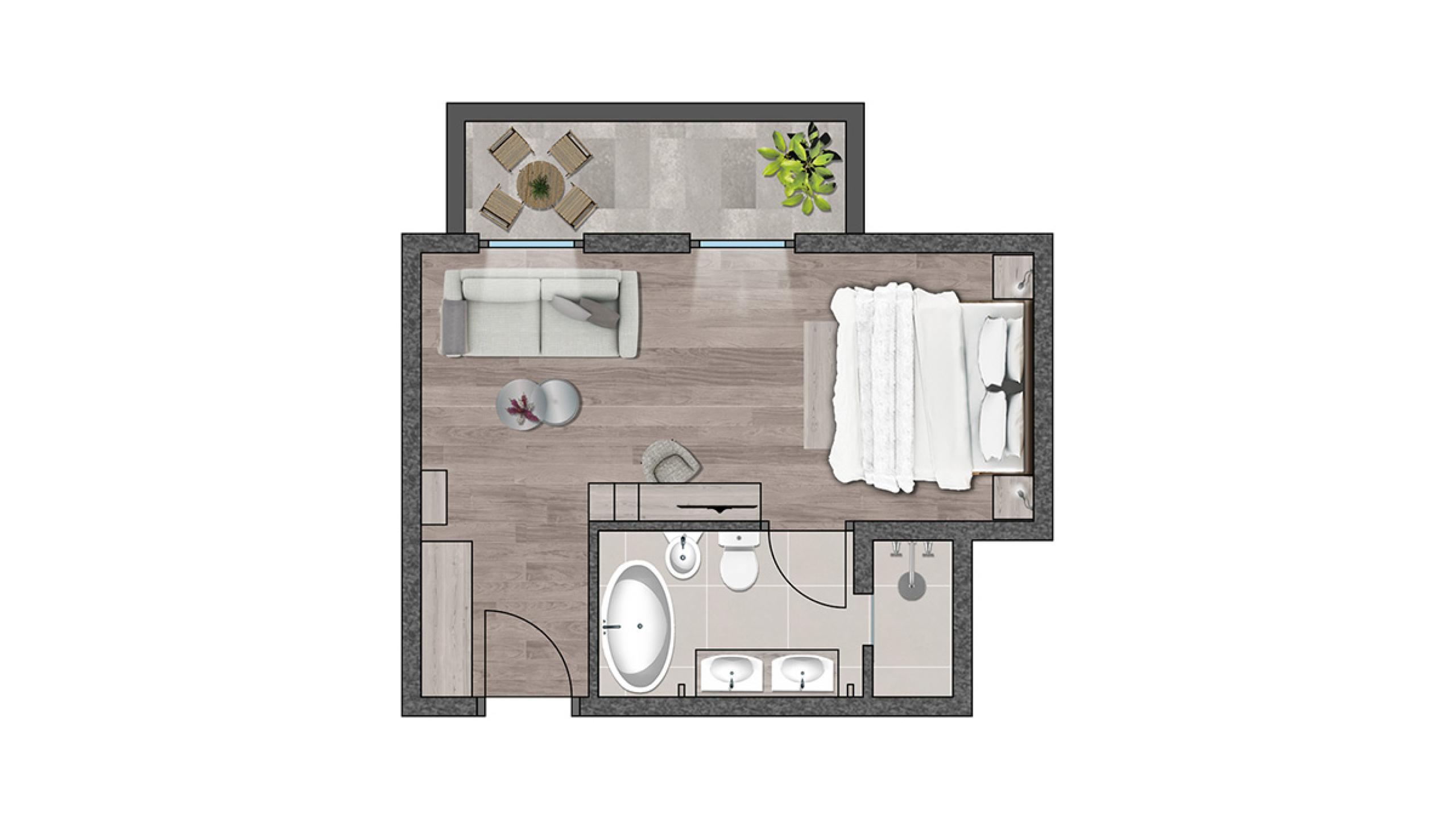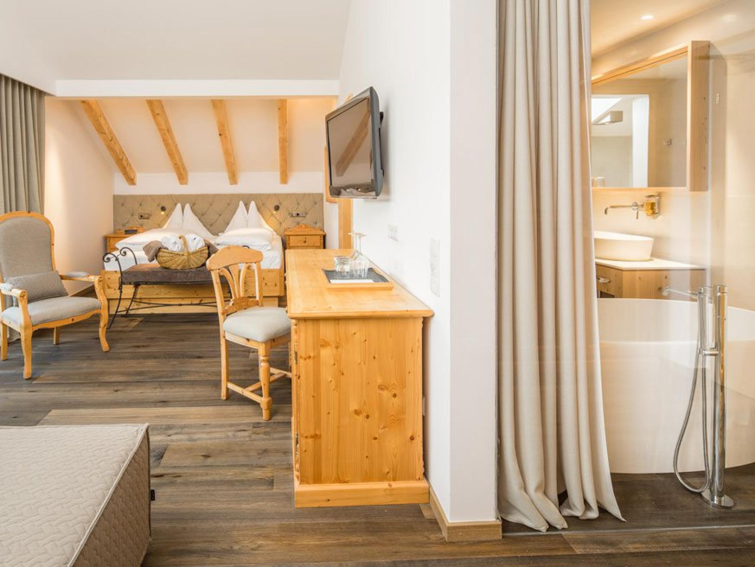 Junior suite in Alpine style with Tyrolean spruce furniture and smoked-oak flooring. Highlight: luxury bathroom with freestanding designer bath and rain shower.