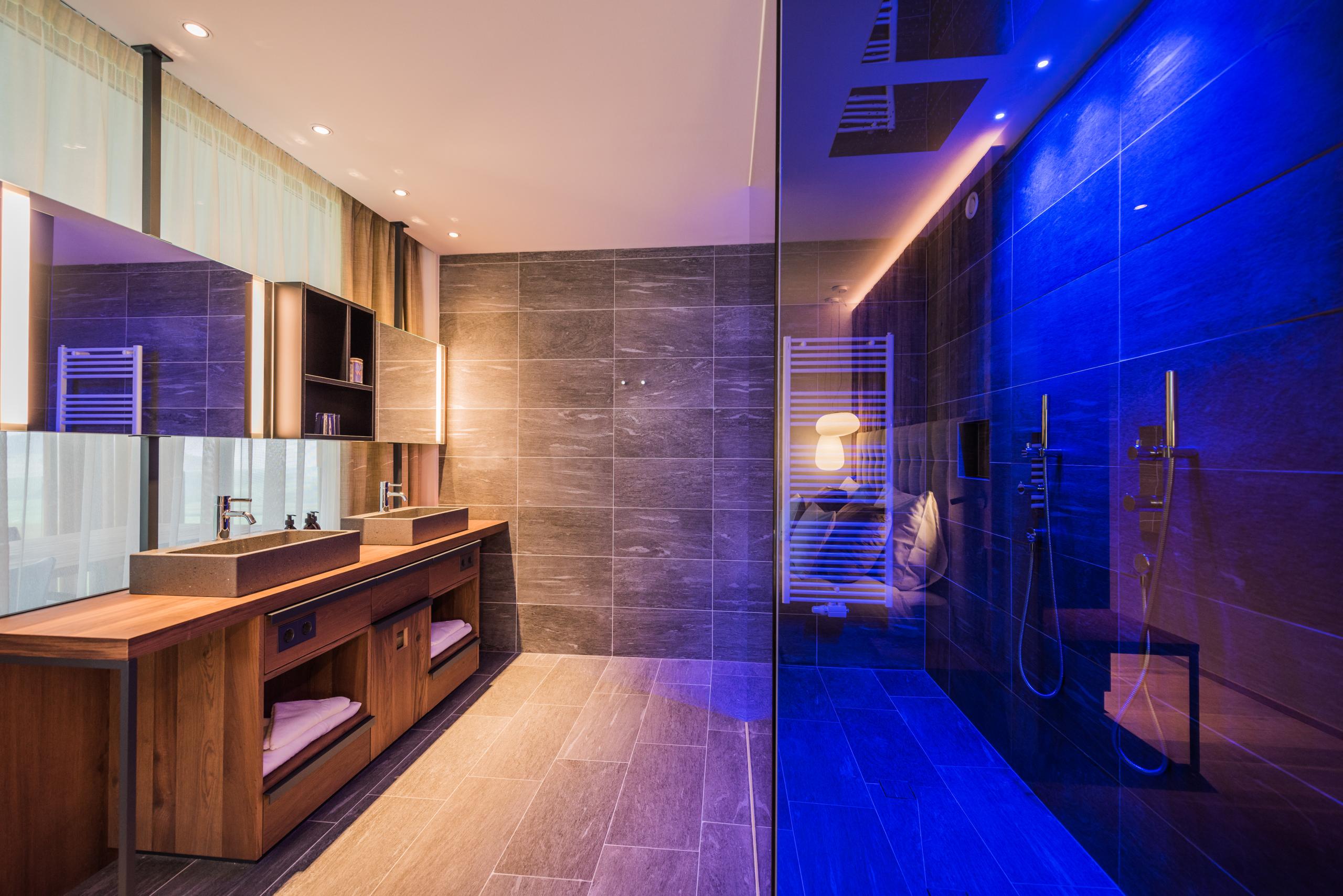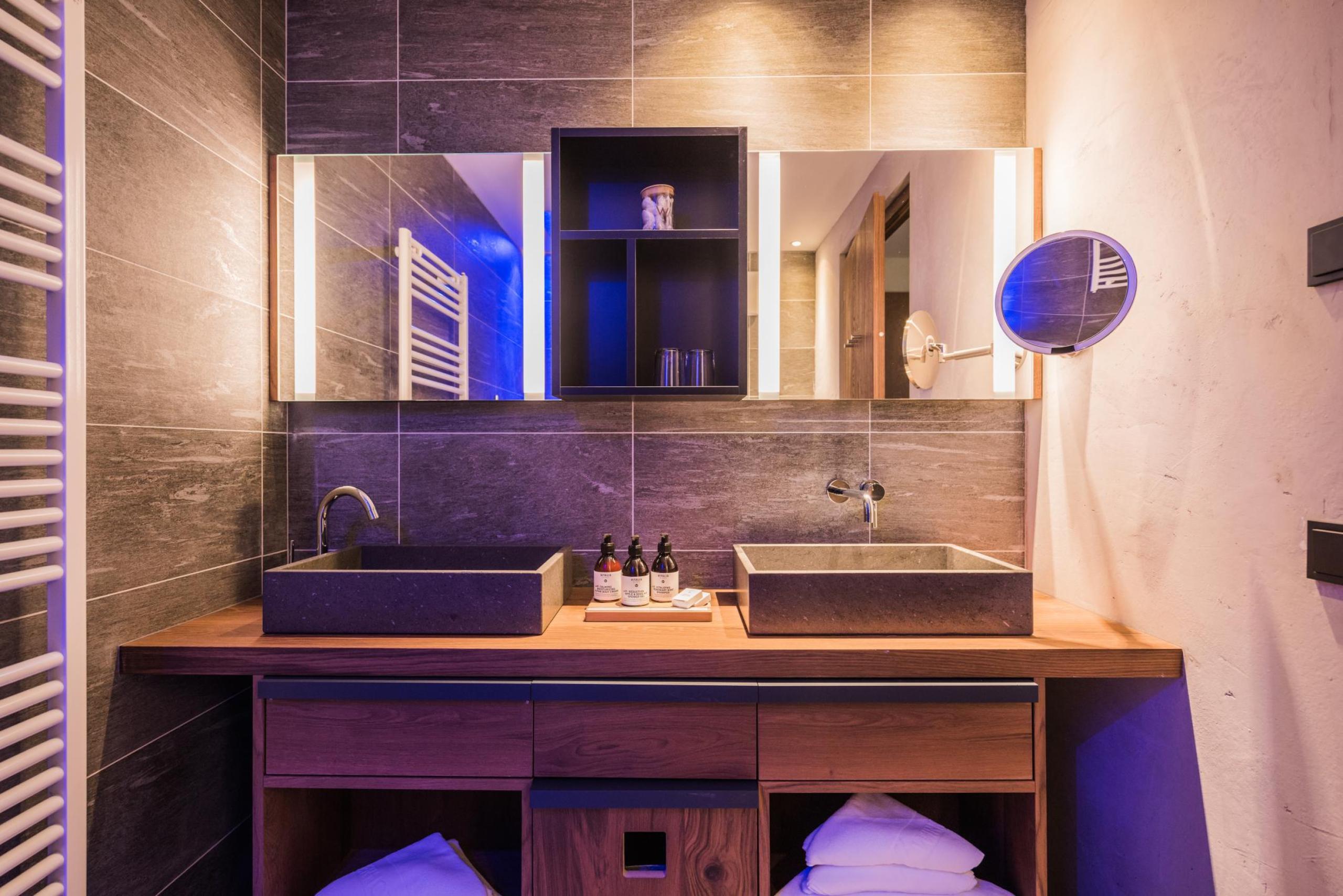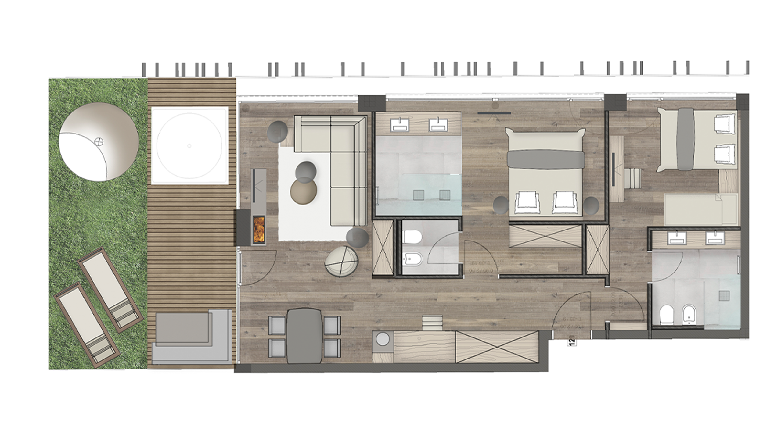 Luxury suite in heavenly location furnished with local materials with large private sun terrace of 50 m² and outdoor whirlpool, two bedrooms with genuine wooden floor, and separate living room with couch and dining table. The second bedroom has a double bed and a single bed. Two bathrooms with double washbasin and dual XL shower, and separate WC with bidet. Free parking in underground car park.