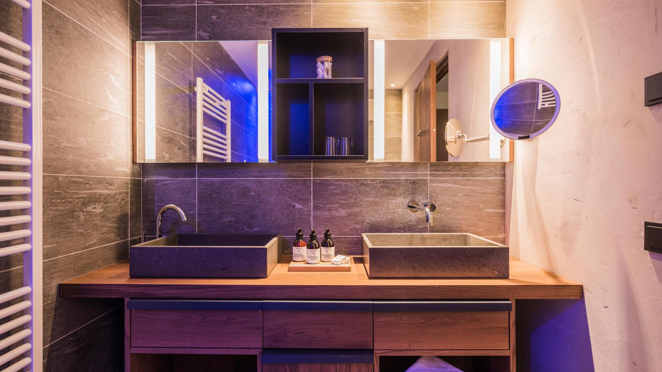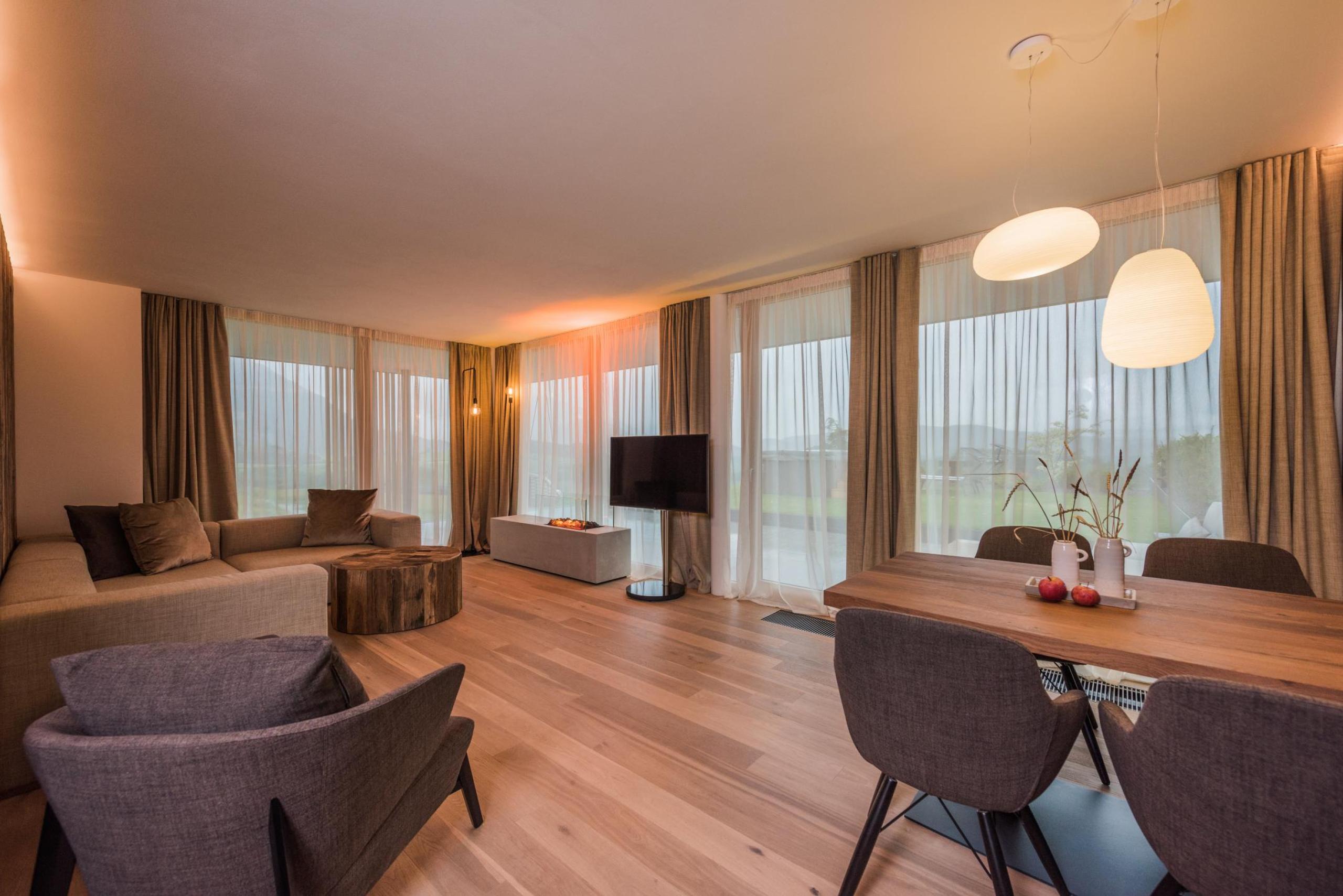 Luxury suite in heavenly location furnished with local materials with large private sun terrace of 50 m² and outdoor whirlpool, two bedrooms with genuine wooden floor, and separate living room with couch and dining table. The second bedroom has a double bed and a single bed. Two bathrooms with double washbasin and dual XL shower, and separate WC with bidet. Free parking in underground car park.