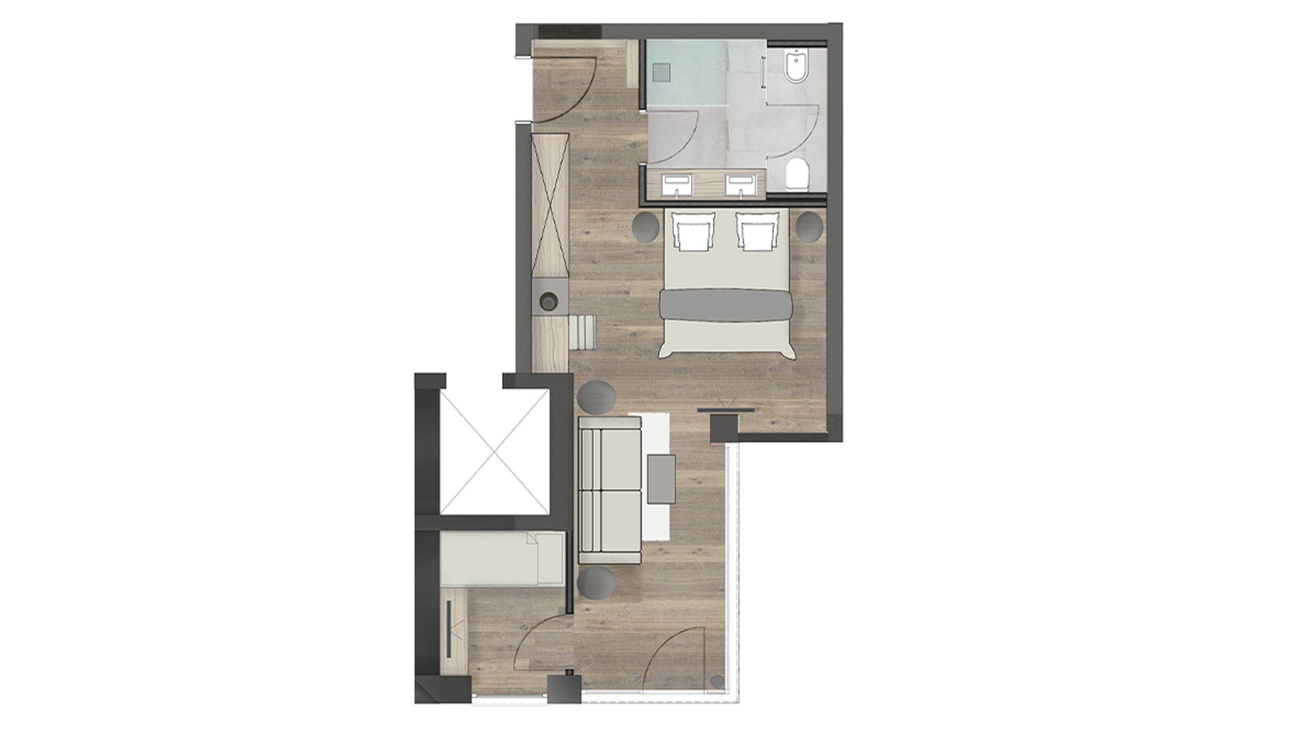 Suite with mountain view and morning sun - wooden floor - living room - 2 Flat TVs - Wlan - Minibar - bathroom with double washbasin - XL shower - separate children's room with bunkbed - separate toilet with bidet - balcony - free underground parking.