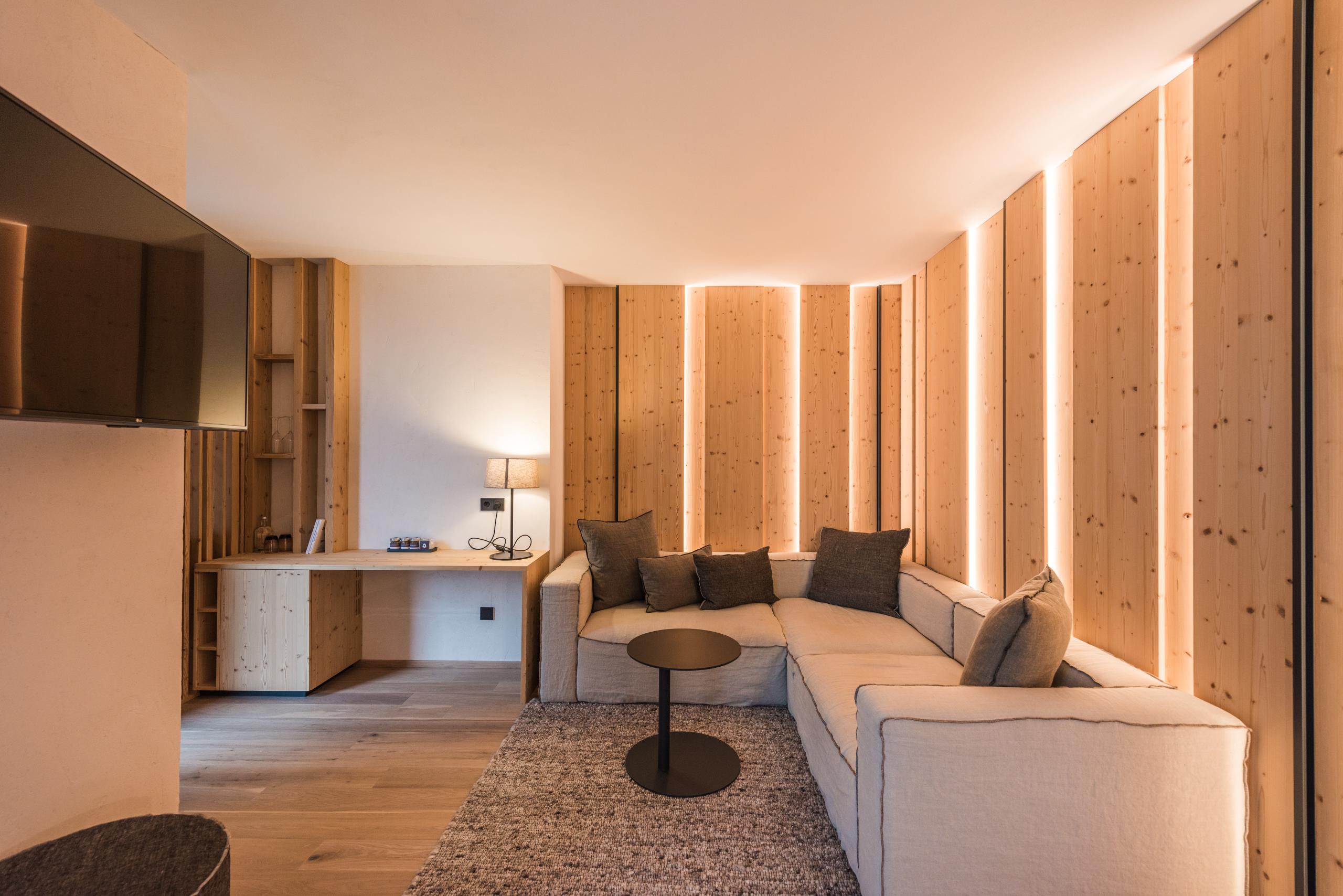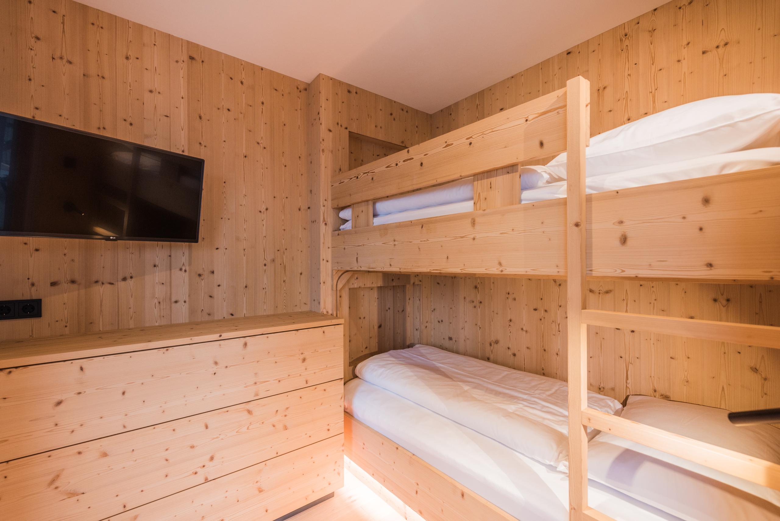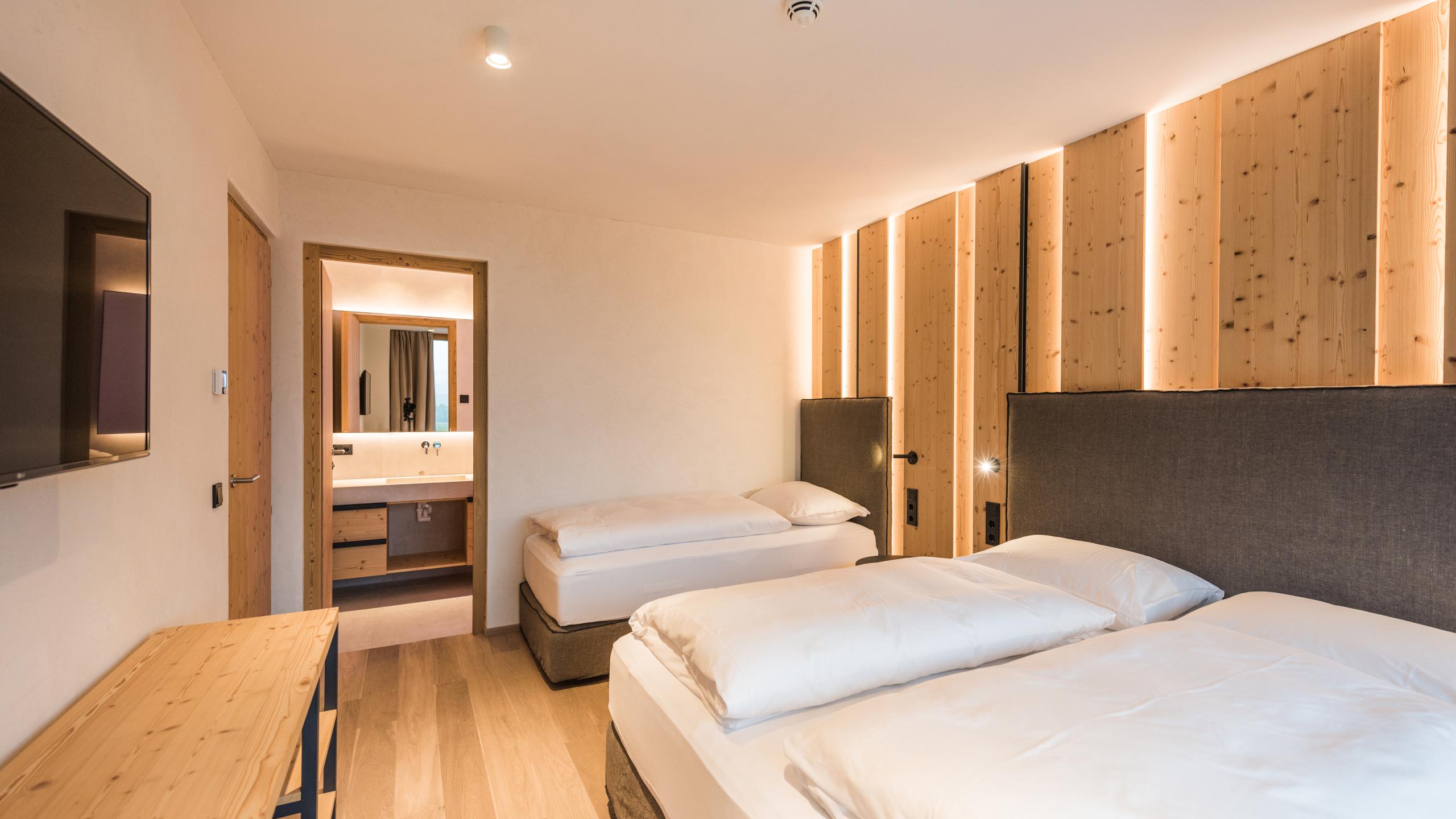 Suite Berg Plus with mountain view and morning sun - wooden floor - living room - 2 flat TVs - wlan - minibar - bathroom with double washbasin - XL shower - 3 bedrooms plus additional bathroom - separate toilet with bidet - balcony - free underground parking. Minimum occupancy: 3 people (full-paying guests). Double occupancy is only possible outside the main holiday season and by arrangement. Please note that in this case, we will charge you a surcharge of the daily rate.
