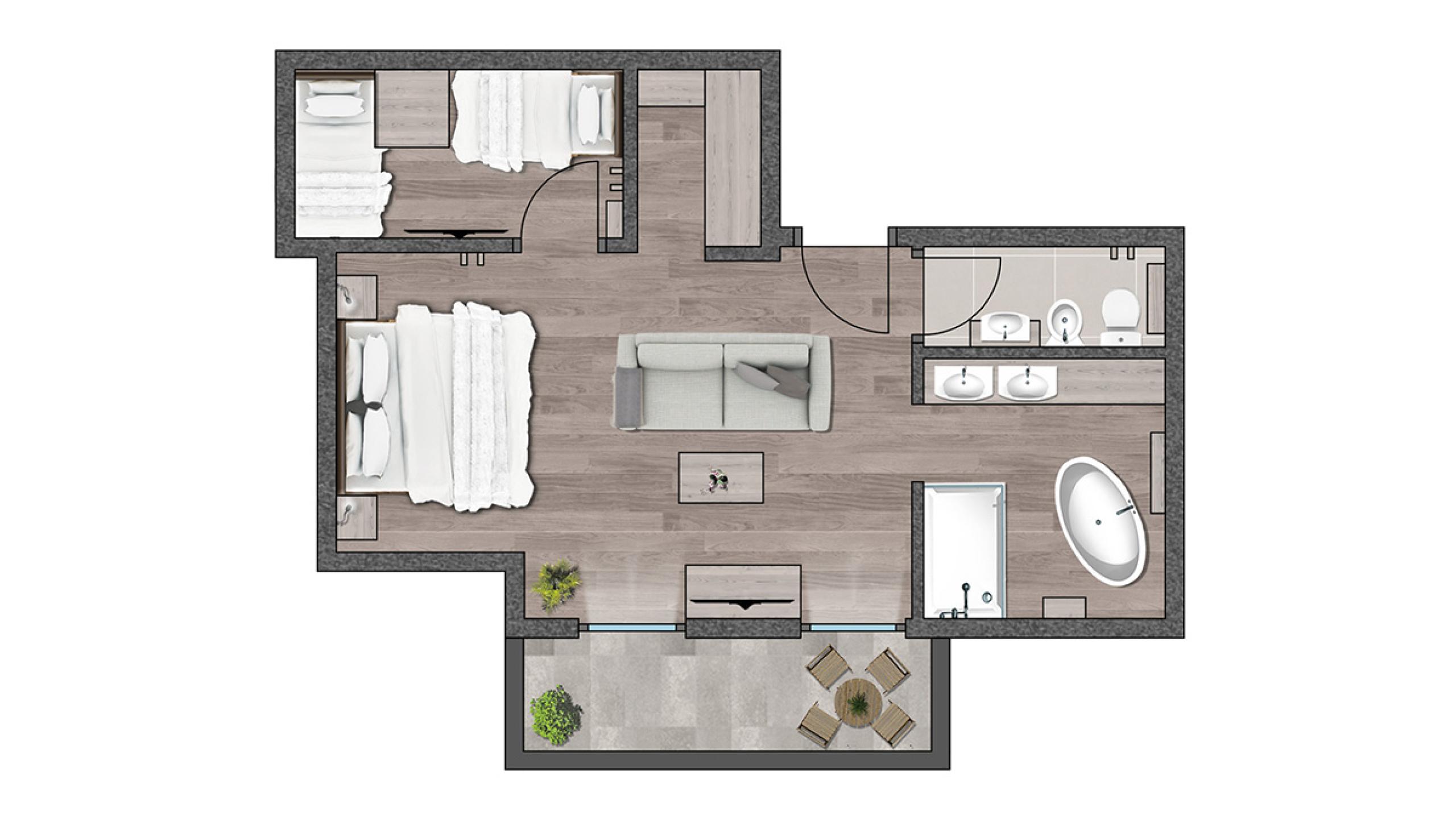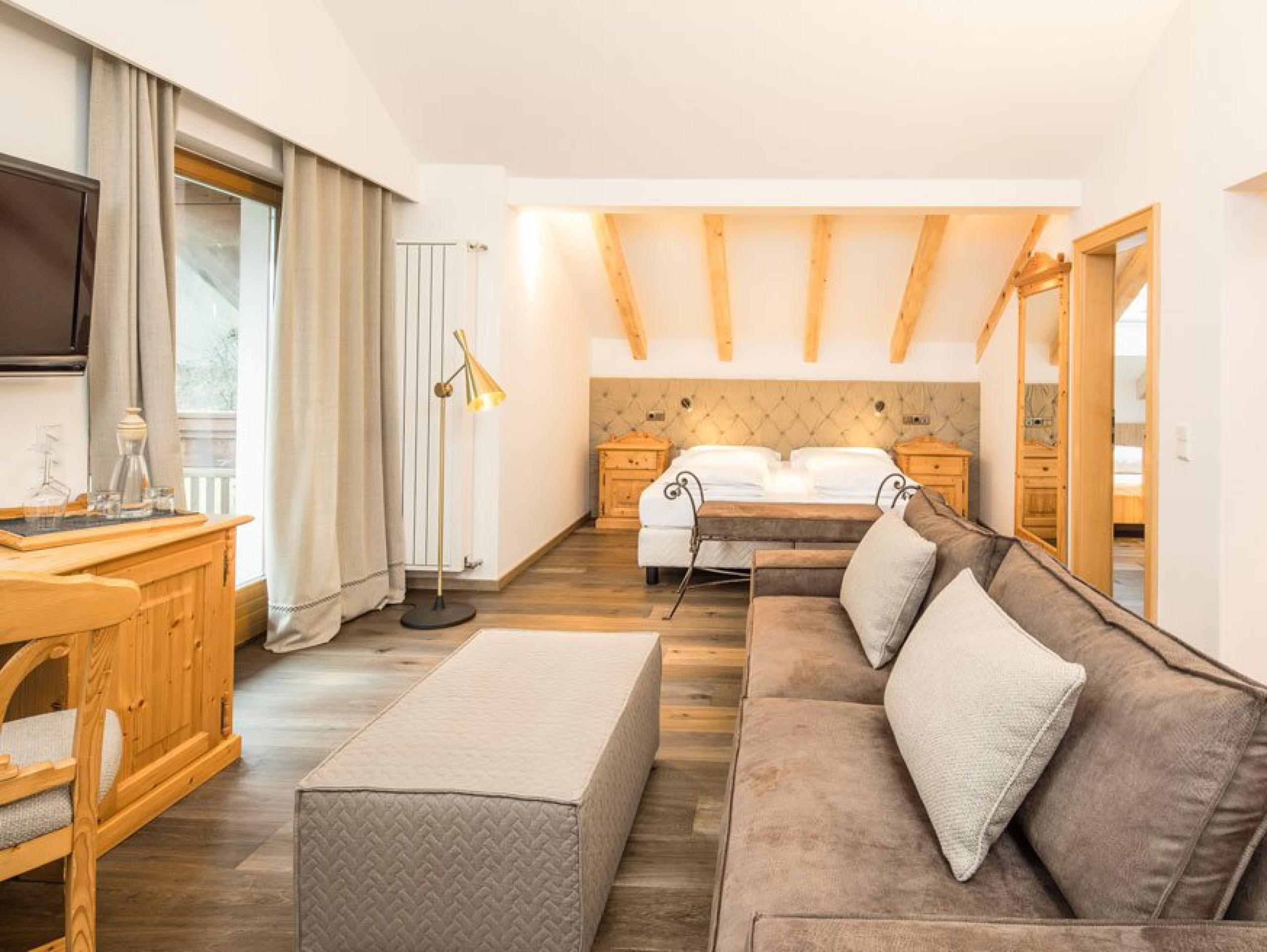 Junior suite in Alpine style with Tyrolean furniture made from local pine and smoked-oak flooring, featuring separate kids’ room with two beds as well as sitting area, balcony, luxury bathroom with freestanding designer bath and rain shower.