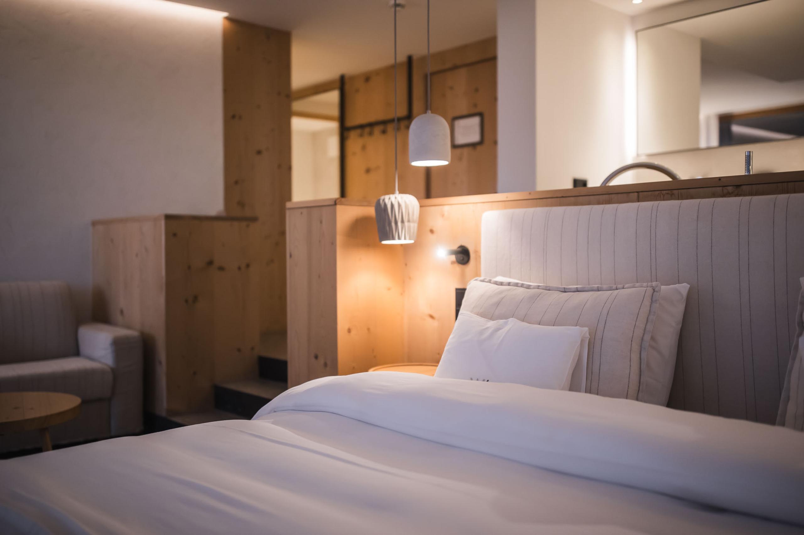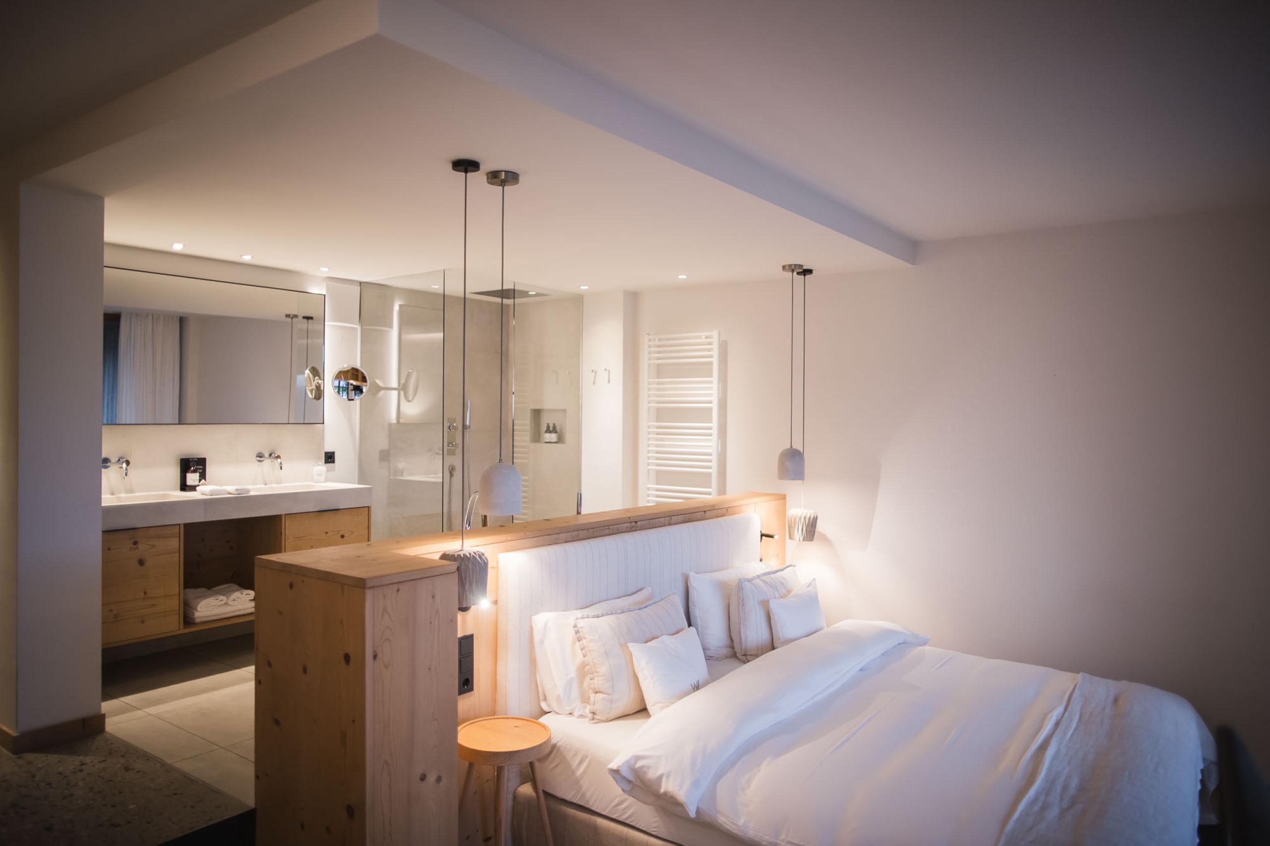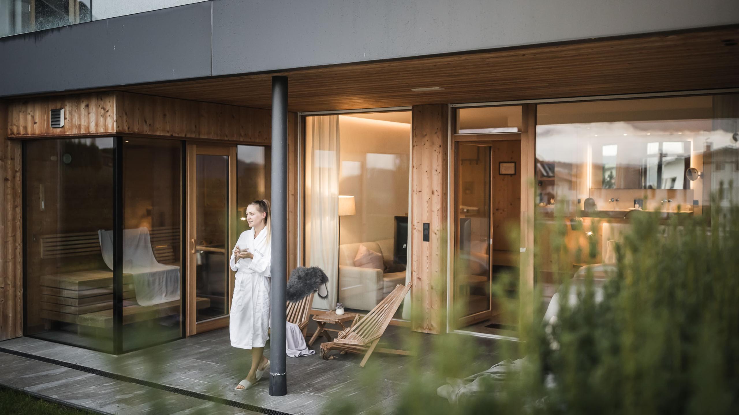Suite in local materials located in the new garden wing featuring a 20 m² large private garden loggia with mountain view and direct access to the garden, a private sauna, a living area with stove, and bathroom with XL shower, and separate WC. Underground parking space included.