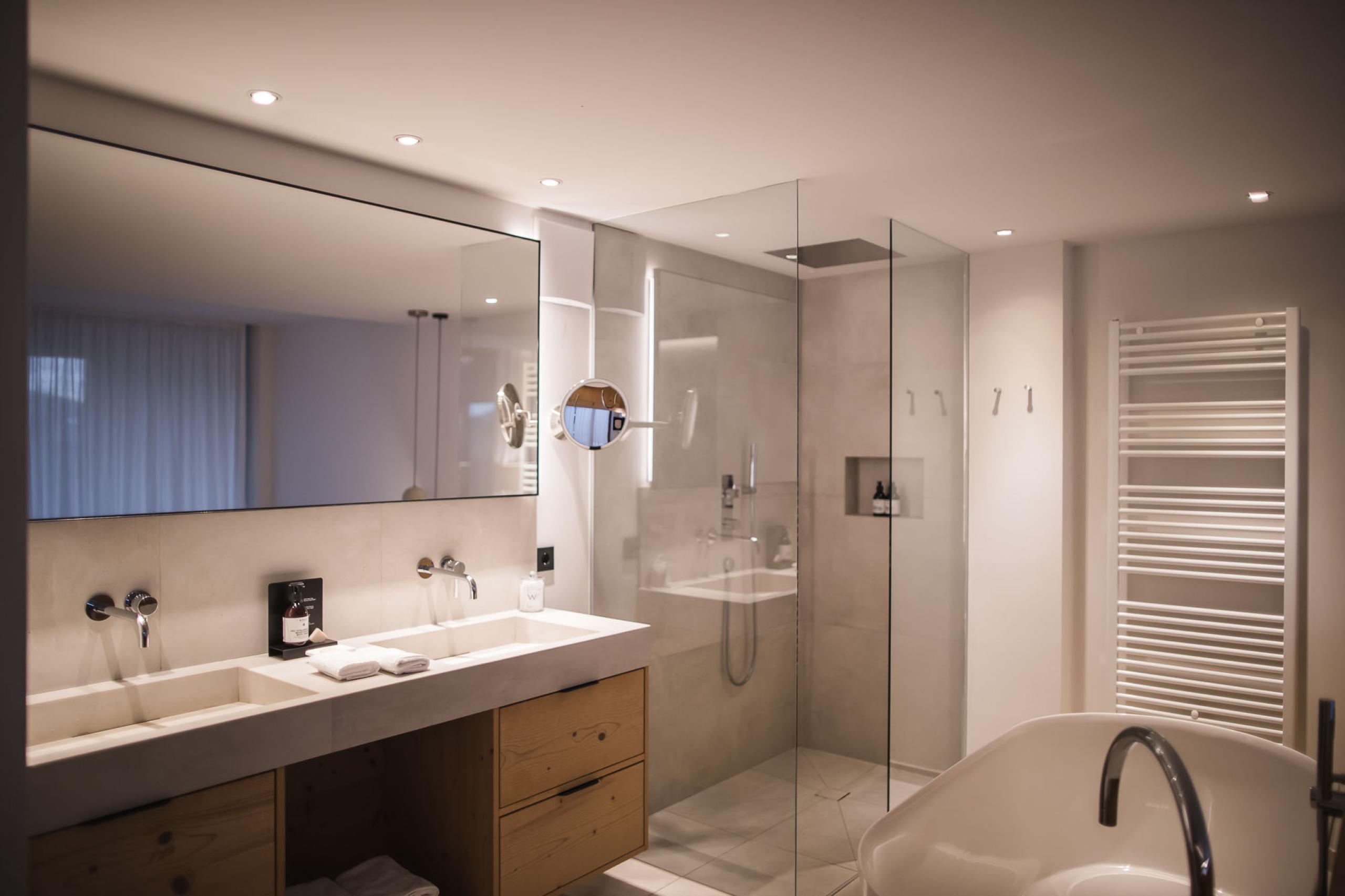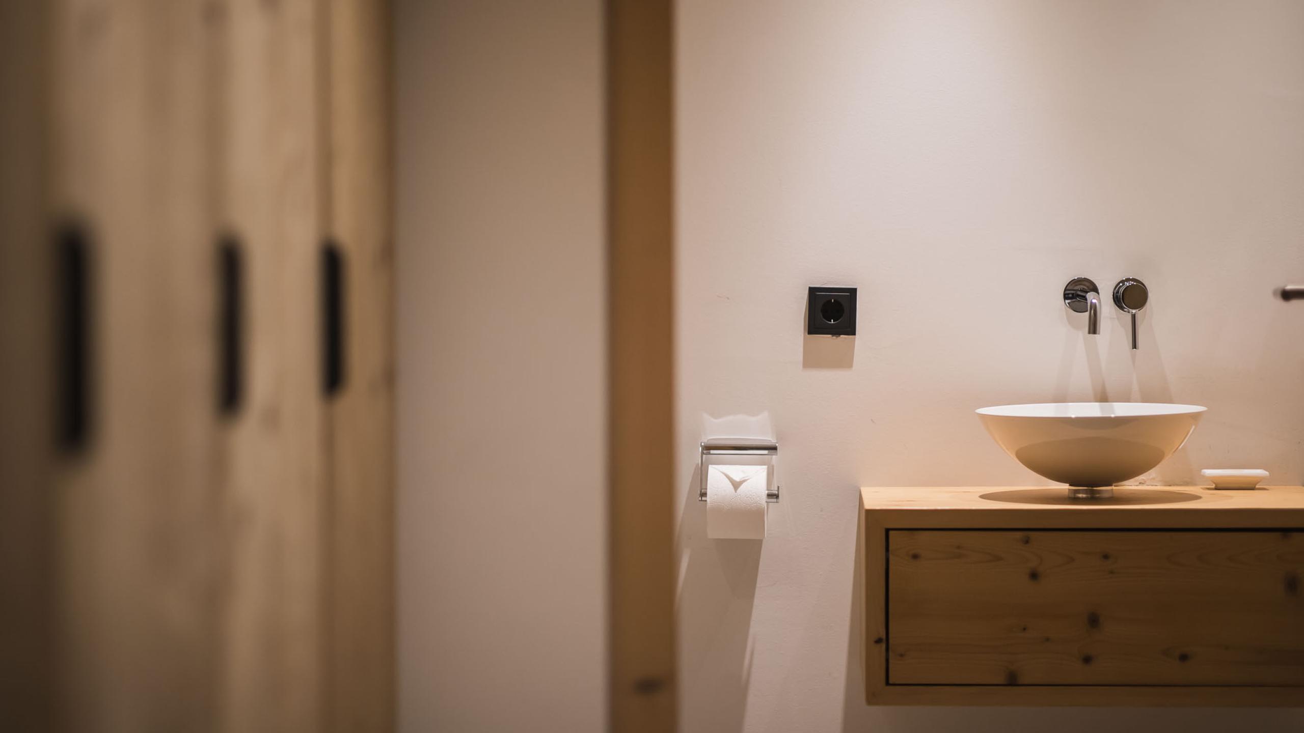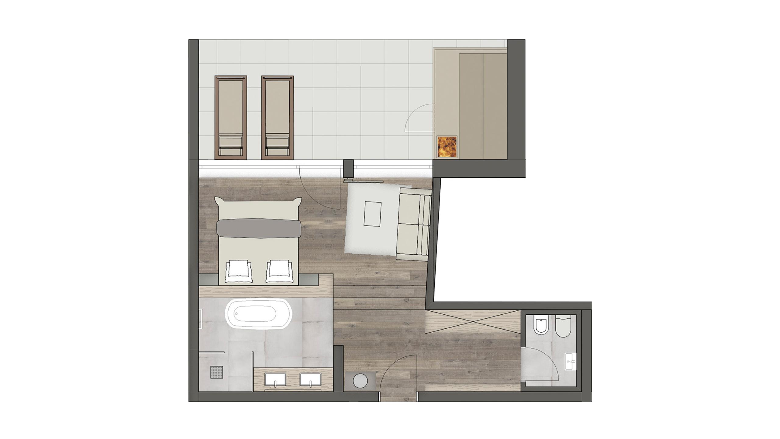 Suite in local materials located in the new garden wing featuring a 20 m² large private garden loggia with mountain view and direct access to the garden, a private sauna, a living area with stove, and bathroom with XL shower, and separate WC. Underground parking space included.