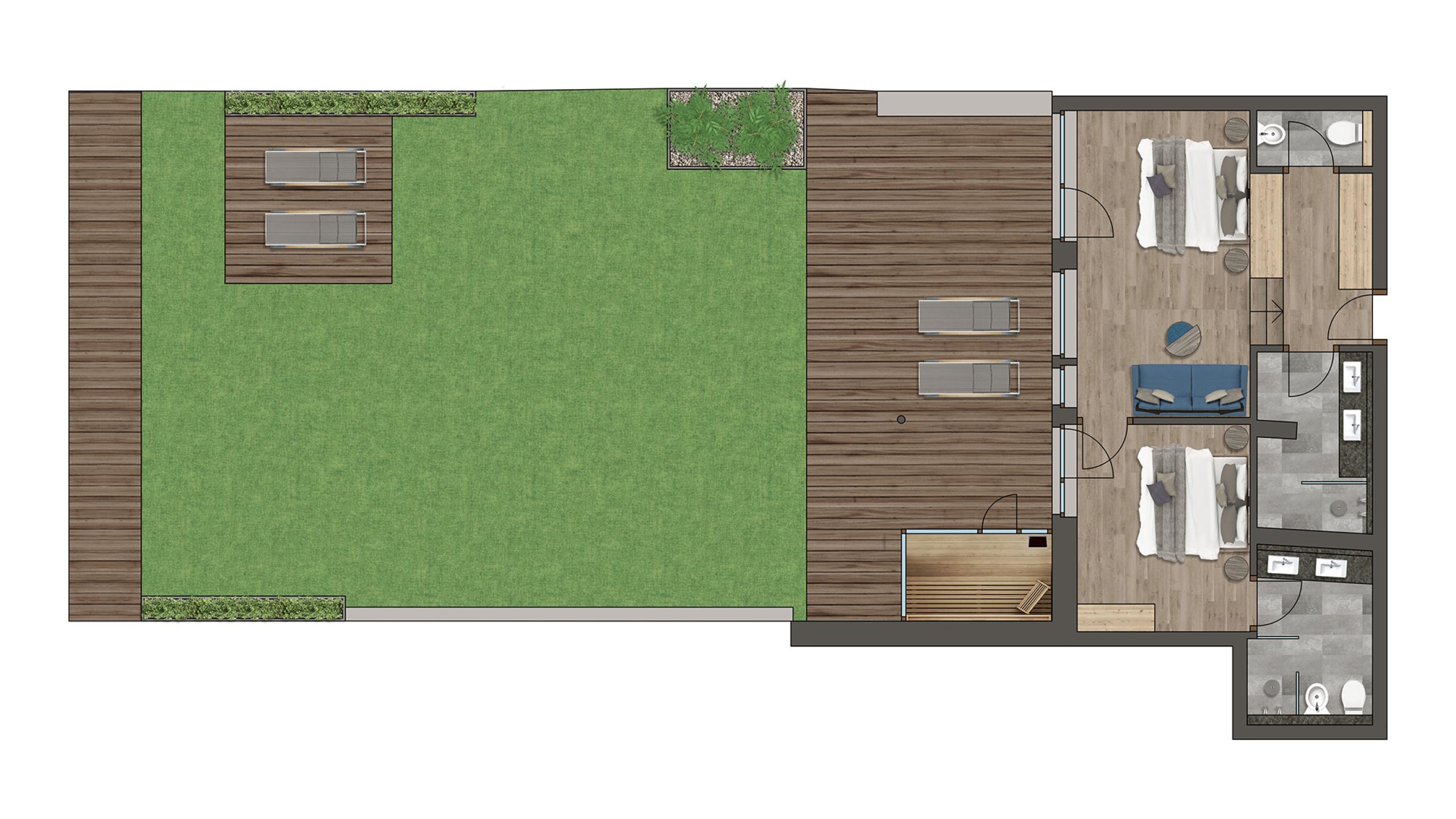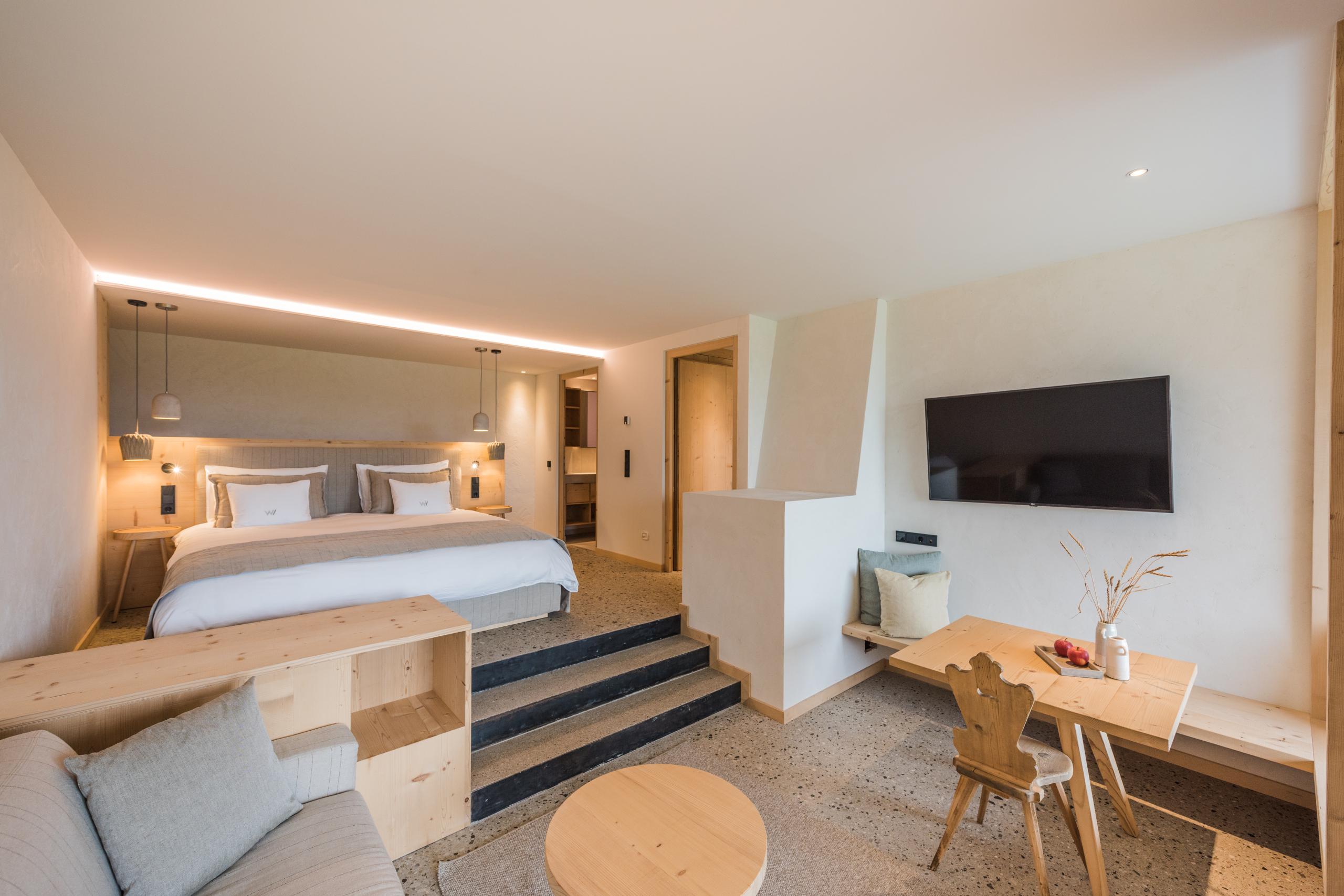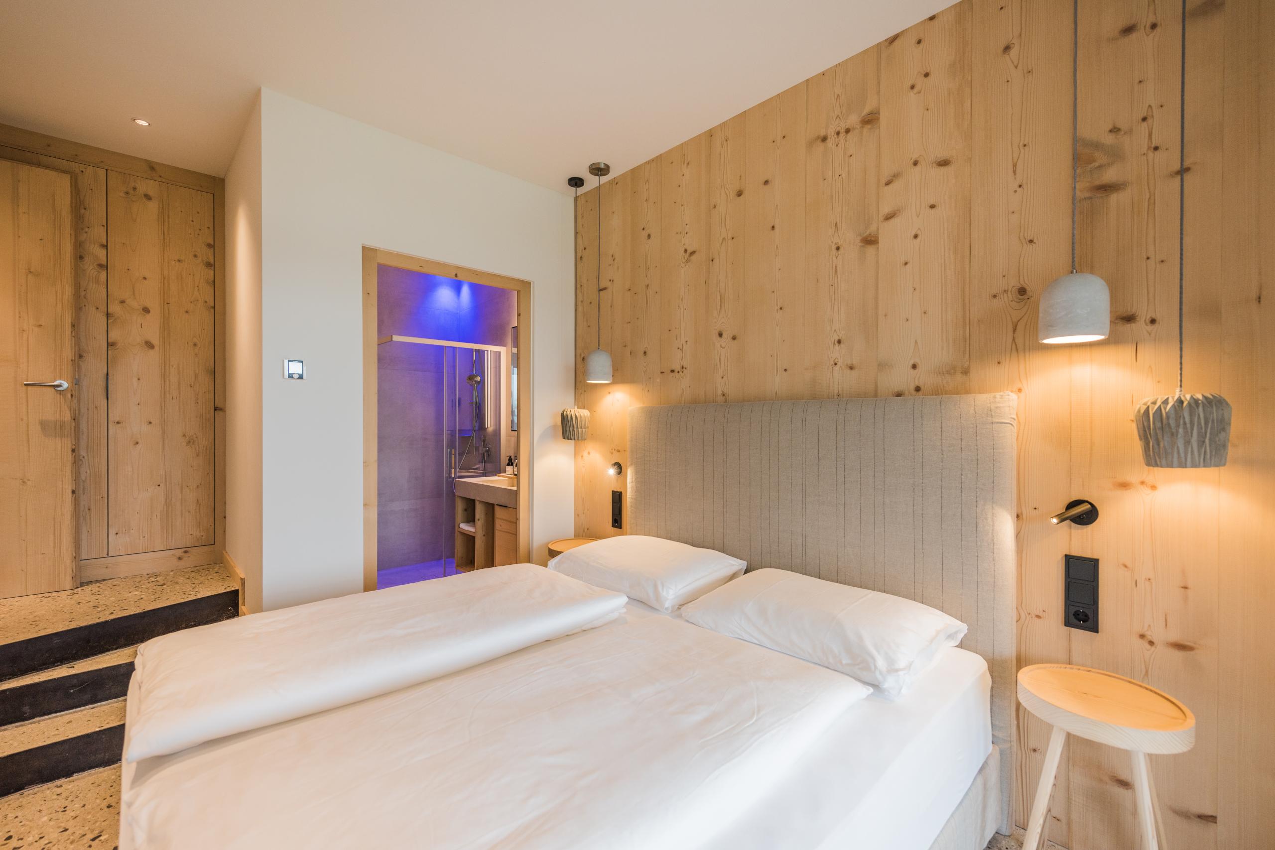 Suite located in the new garden wing with 25 m² large private garden loggia located on the ground floor, mountain view, outdoor living area and direct access to the garden as well as a private sauna, and spring-water fountain, separate second bedroom with double bed, and two bathrooms with shower. Underground parking space included. Minimum occupancy: 3 people (full-paying guests). Double occupancy is only possible outside the main holiday season and by arrangement. Please note that in this case, we will charge you a surcharge of the daily rate.