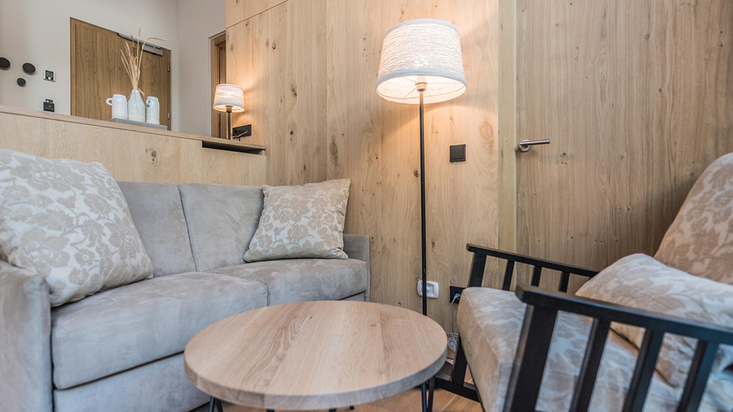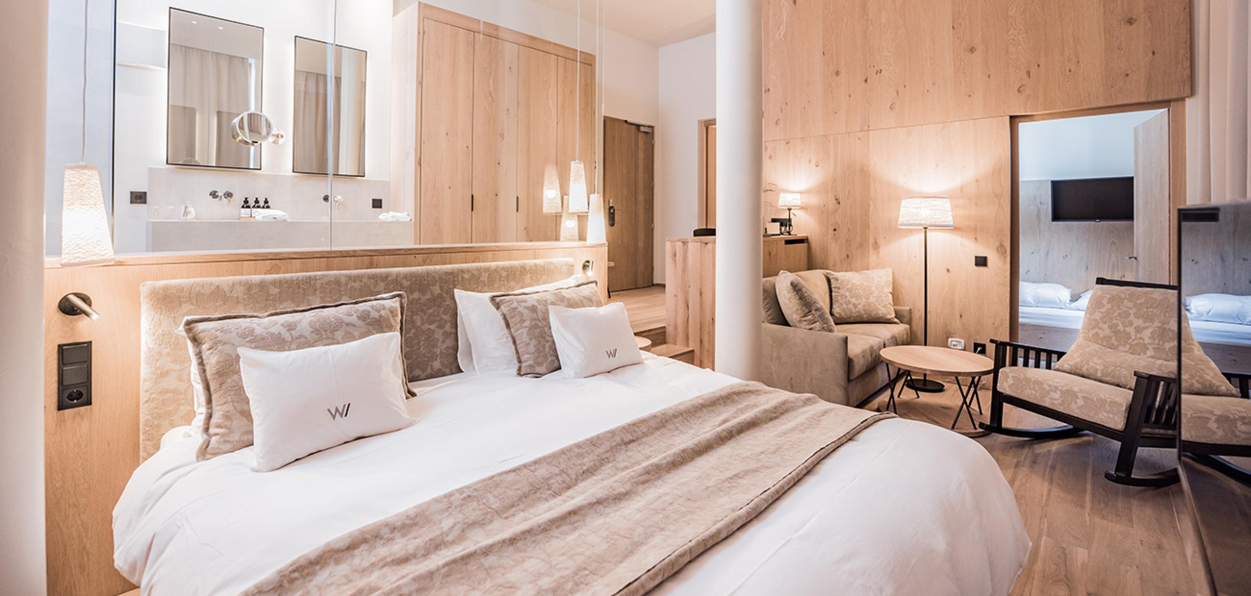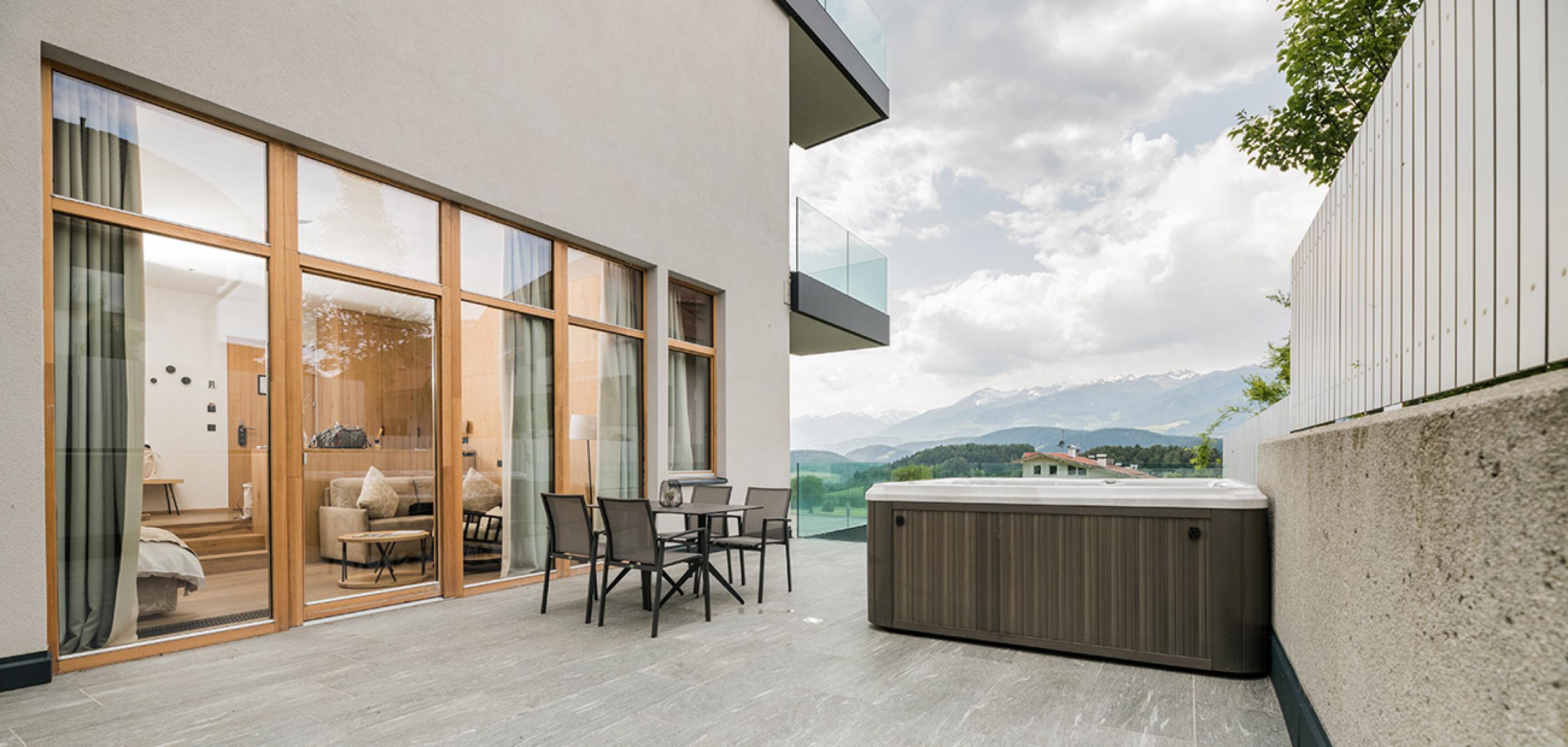 Suite located in the new garden wing featuring a 40 m² large private terrace located on the ground floor, an outdoor living area and private outdoor heated whirlpool, living room area, separate children's room with bunkbed and single bed and play area, and a bathroom with two-person XL shower, separate WC, changing table and children’s washbasin. Underground parking space included. Minimum occupancy: 3 people (full-paying guests). Double occupancy is only possible outside the main holiday season and by arrangement. Please note that in this case, we will charge you a surcharge of the daily rate. Double occupancy is only possible outside the main holiday season and by arrangement. Please note that in this case, we will charge you a surcharge of the daily rate.