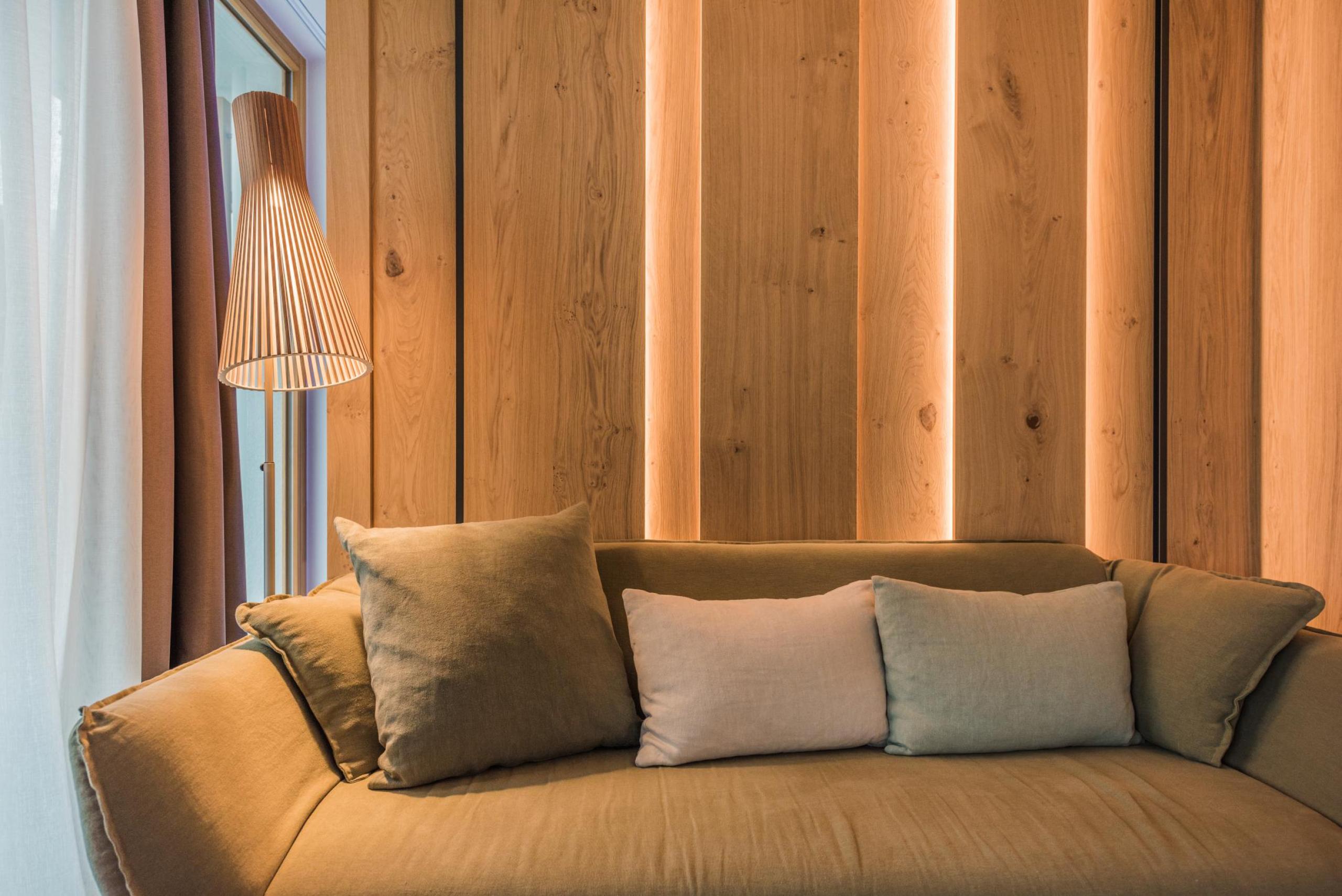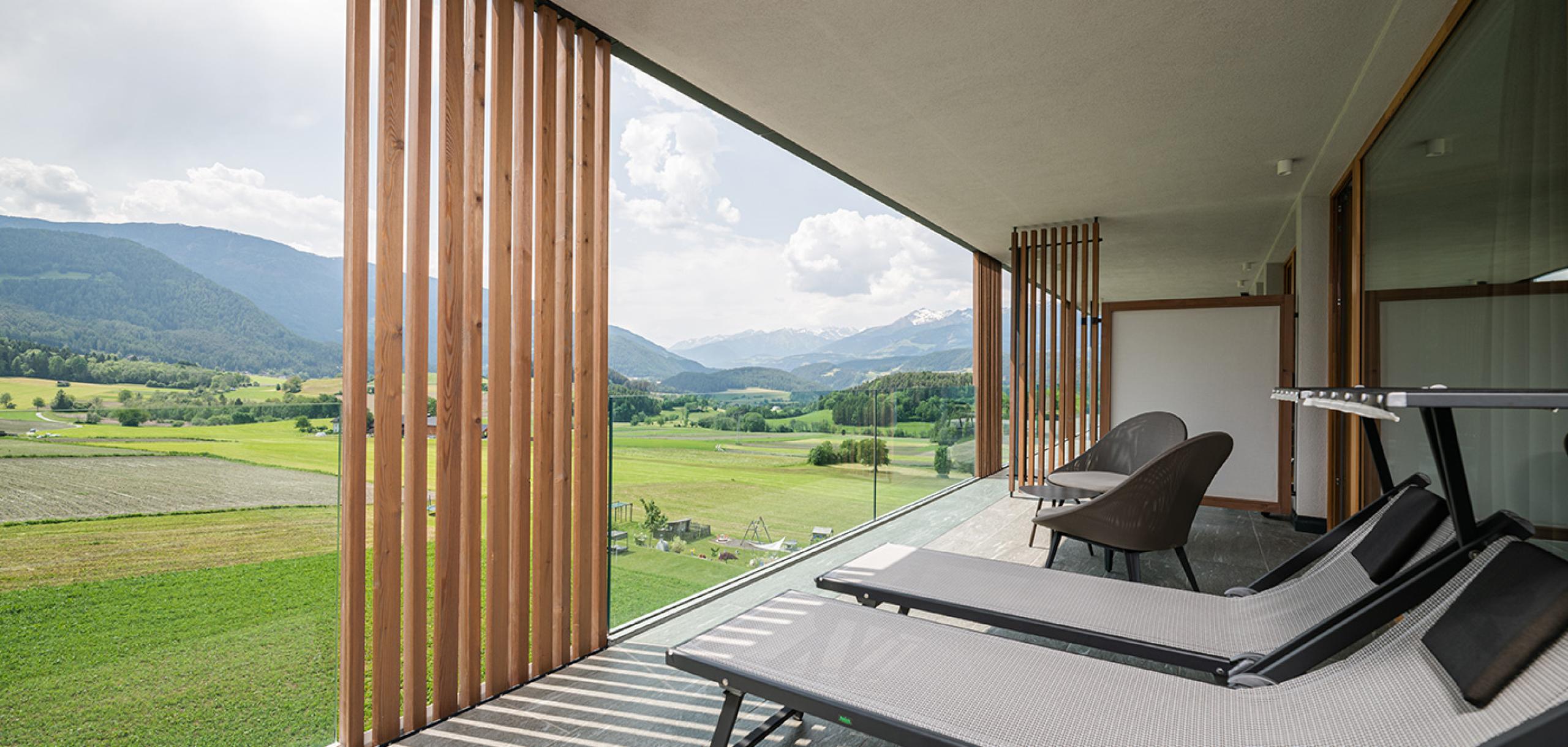 Suite furnished with local materials with mountain view in exclusive sunny location with large balcony of 15 m², wooden floor, stylish lounge corner, open bathroom with double washbasin and XL panoramic shower, and separate WC with bidet. Free parking in underground car park.