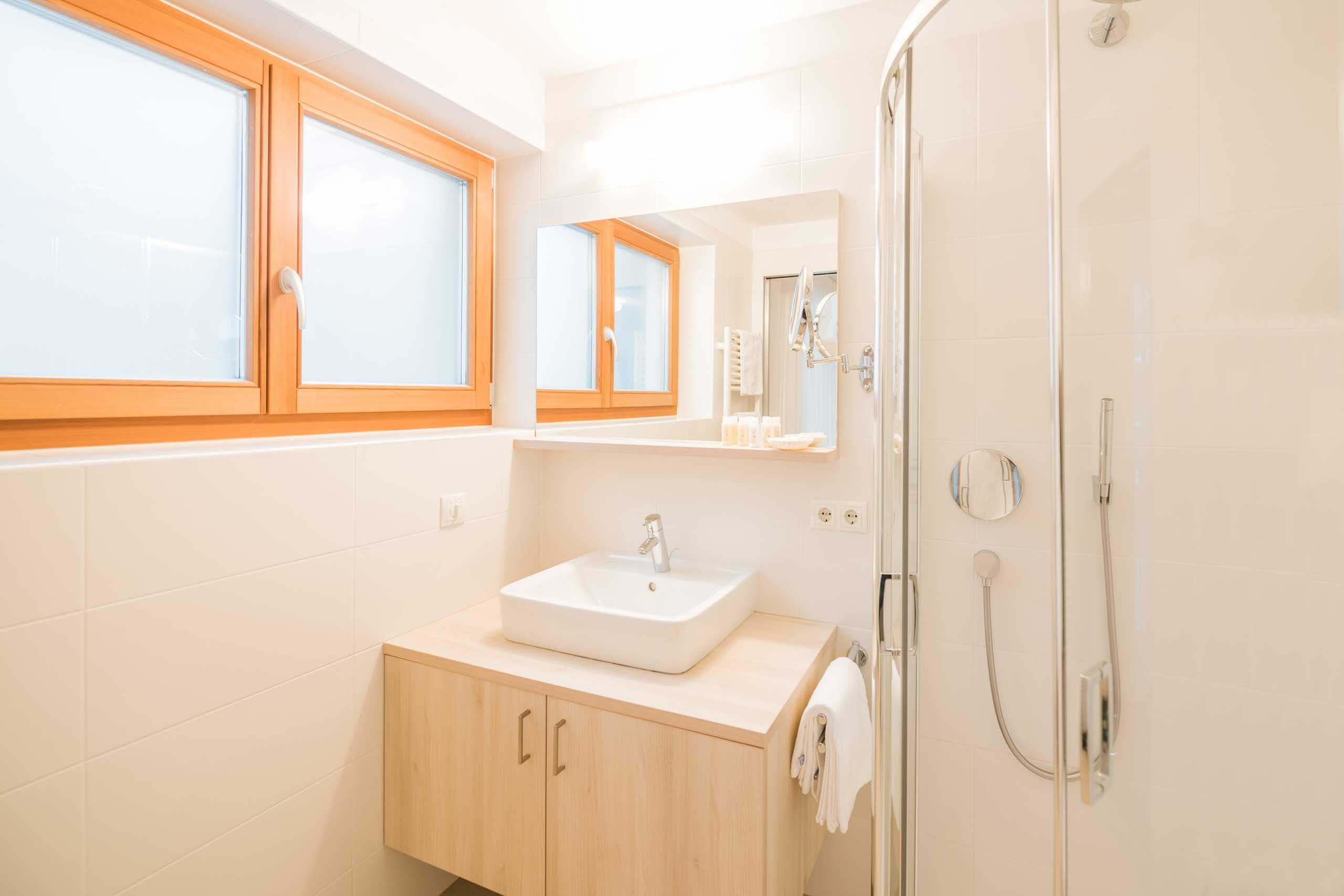 Dusche, WC, Föhn, Kosmetikspiegel, 42’’-Flachbildschirm mit Sat-TV, Safe und Balkon. Bademantel und Wellnesskorb mit Saunatüchern finden Sie für die Dauer Ihres Aufenthalts im Zimmer vor. Die Doppelzimmer Residence sind mit Halbpension oder Frühstück buchbar.