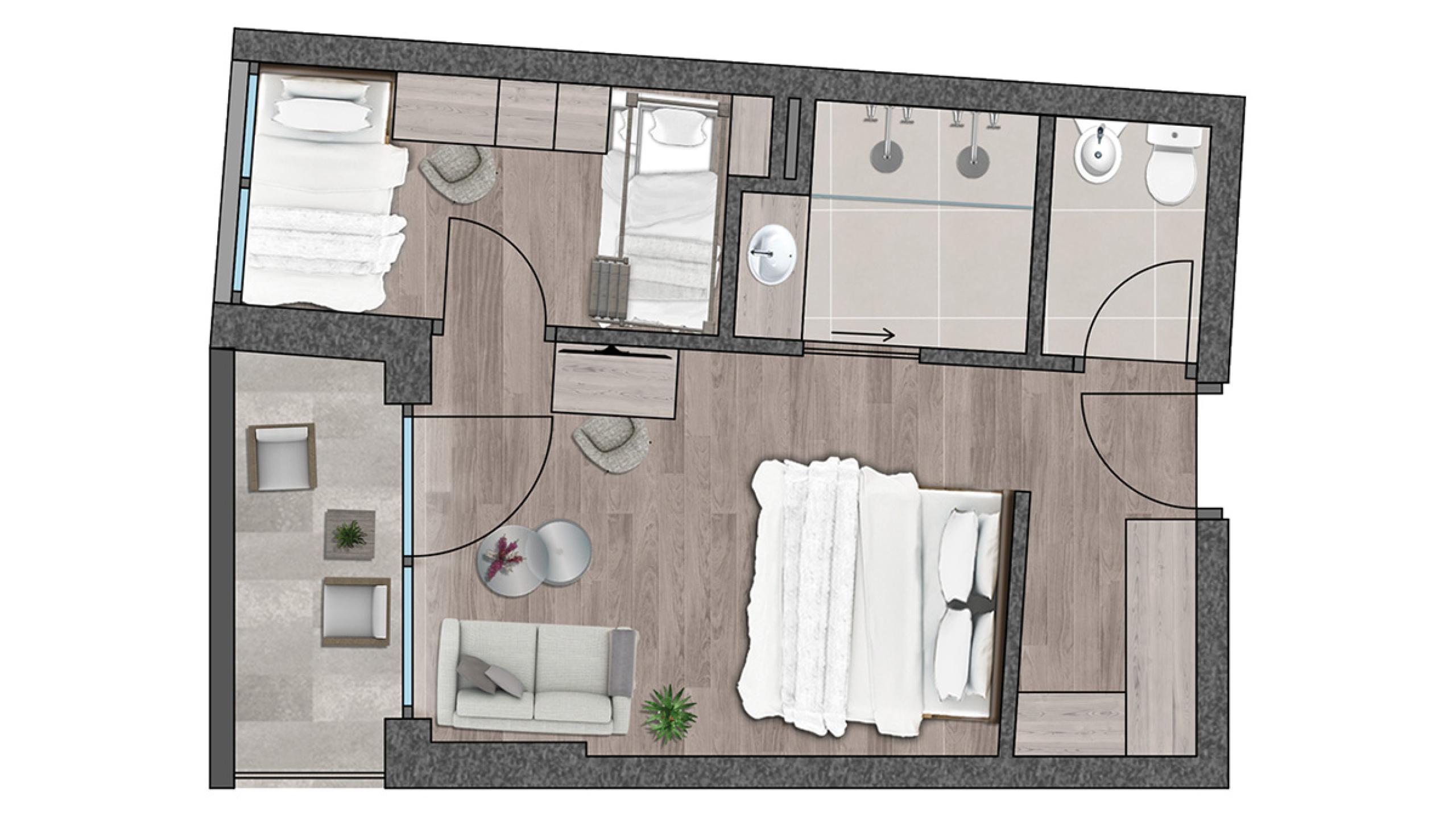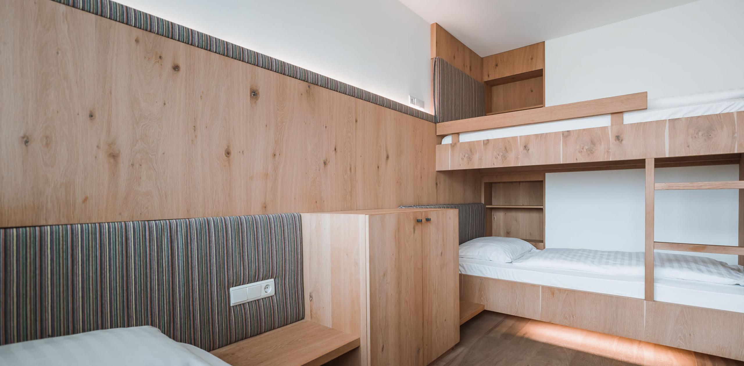 Die Familien Suite Kronplatz im Bestandshaus überzeugt durch ihre südliche Ausrichtung und den Blick auf den Kronplatz, eingebettet in eine sonnige Lage. Sie verfügt über Holzdielenboden sowie Klimaanlage und bietet ein separates Kinderzimmer mit Etagenbett (1,8 m) und Einzelbett (1,8 m). Das Badezimmer ist mit einer großzügigen Dusche sowie einem separaten WC und Bidet ausgestattet. Ein Balkon, auf dem Sie die Sonne genießen können, runden das Angebot ab.