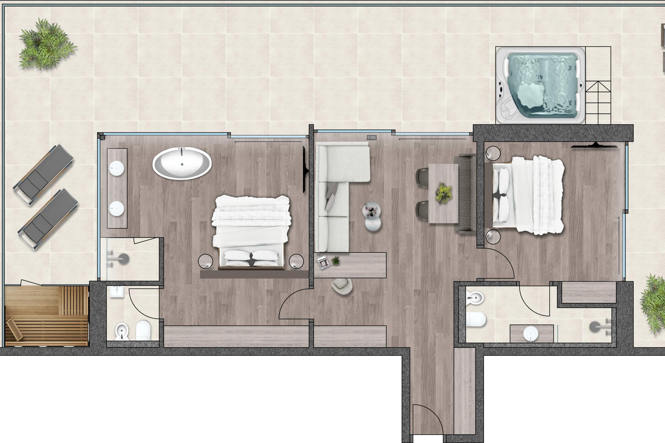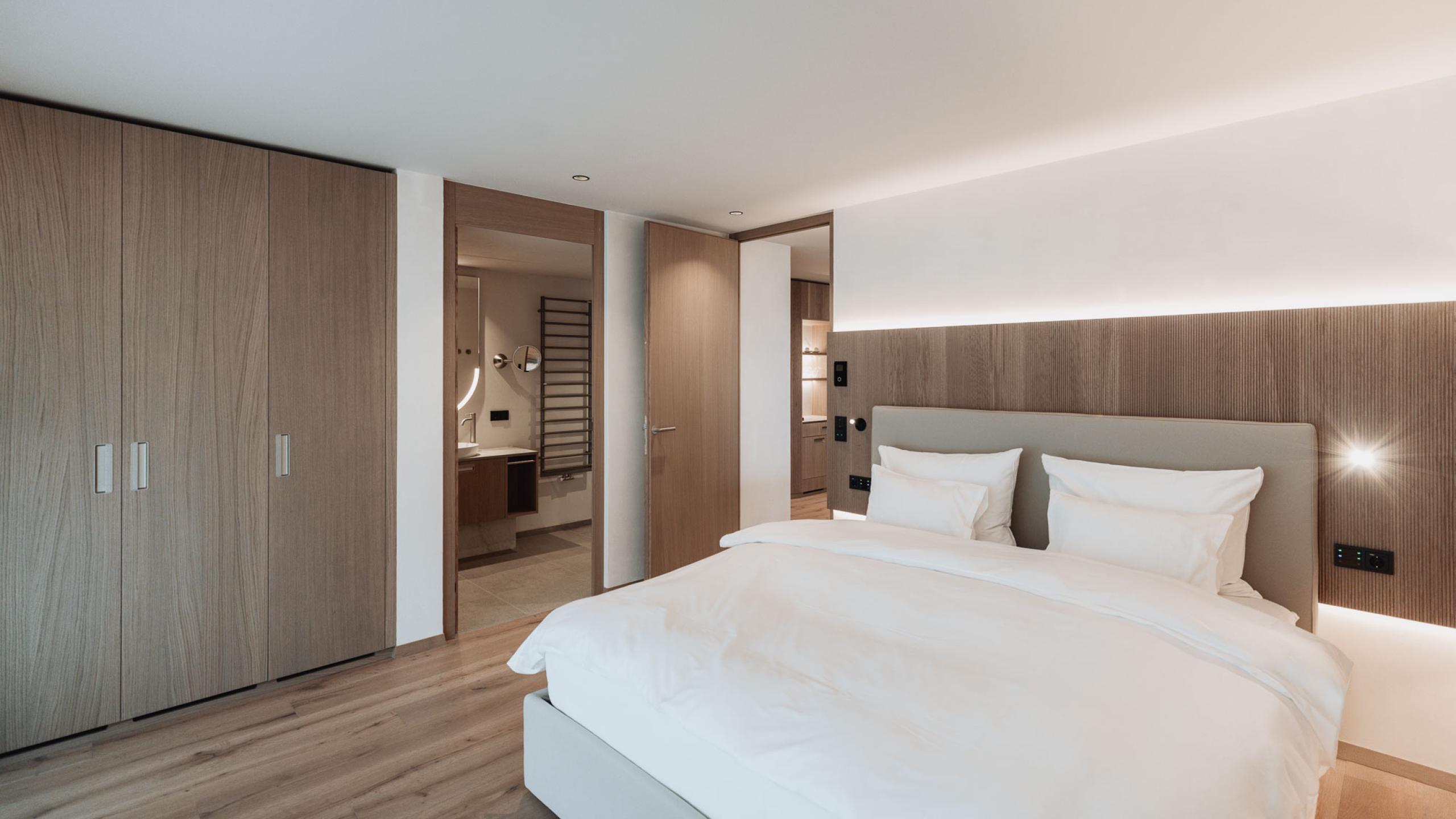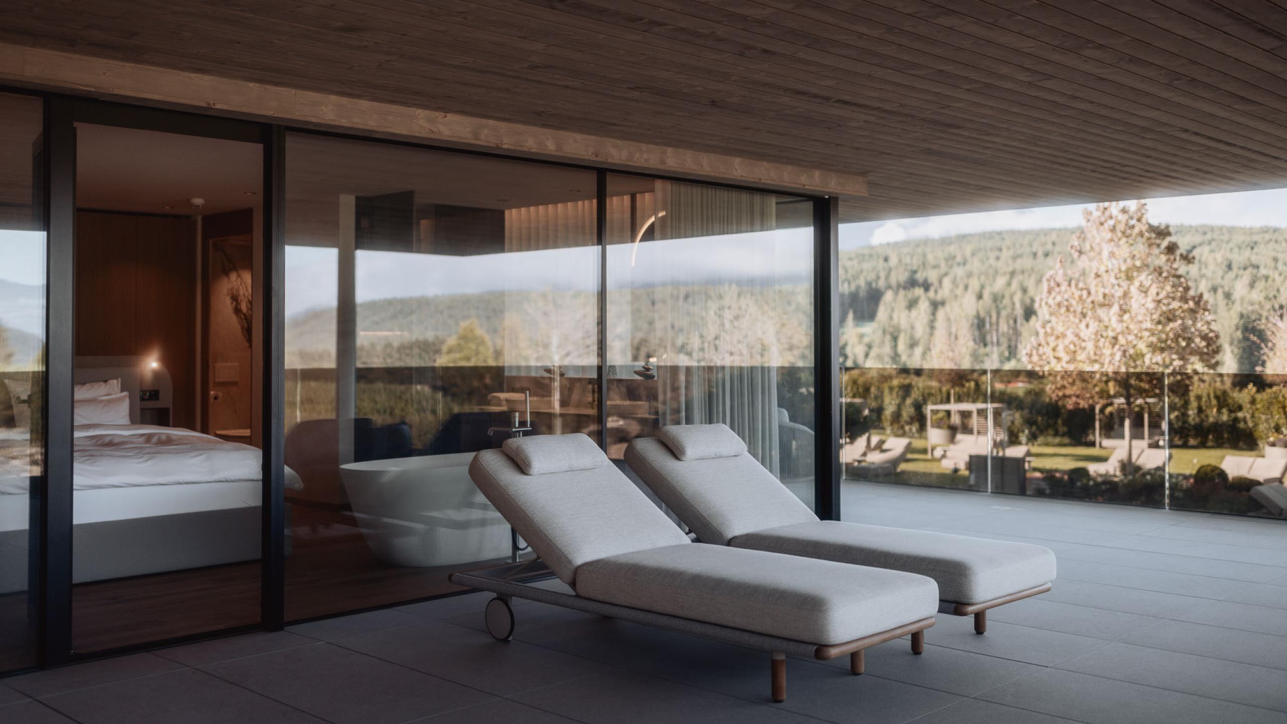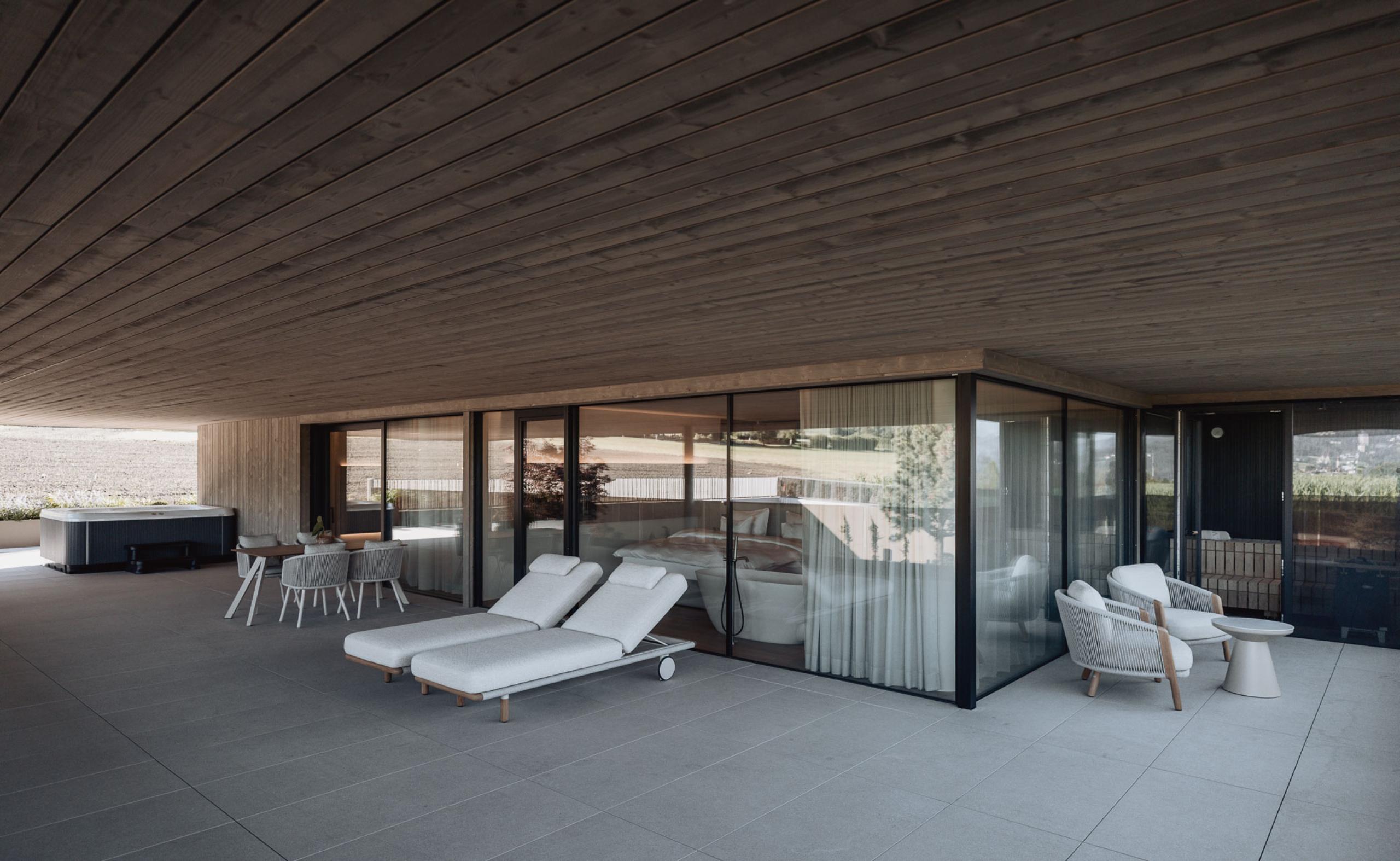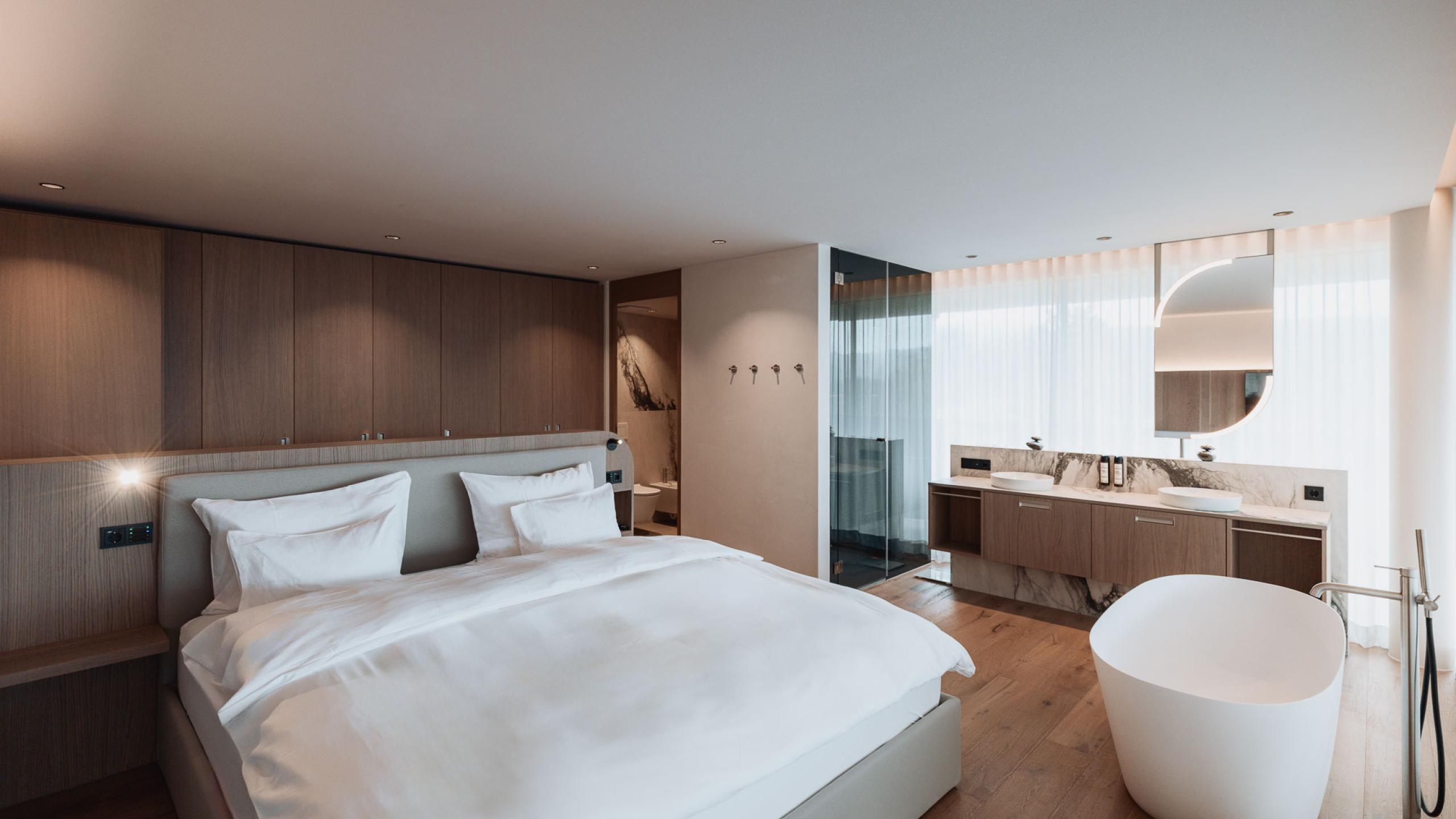 Die Suite Joy bietet Platz für vier Gäste und umfasst zwei separate Schlafzimmer, die jeweils über ein eigenes Badezimmer und eine Klimaanlage verfügen. Das Hauptschlafzimmer ist zusätzlich mit einer Designer-Badewanne ausgestattet. Ein abgetrenntes Wohnzimmer und eine Outdoor-Loggia sorgen für zusätzlichen Komfort. Der Holzboden im Zimmer verleiht der Suite eine warme und einladende Atmosphäre. Die 142m² große Terrasse bietet einen privaten Whirlpool, eine private Sauna und eine spektakuläre Panoramaaussicht nach Westen Richtung Issing. Die Suite ist im ersten Stock mit vollständig überdachter Terrasse oder im zweiten Stock mit teilweise überdachter Terrasse verfügbar.