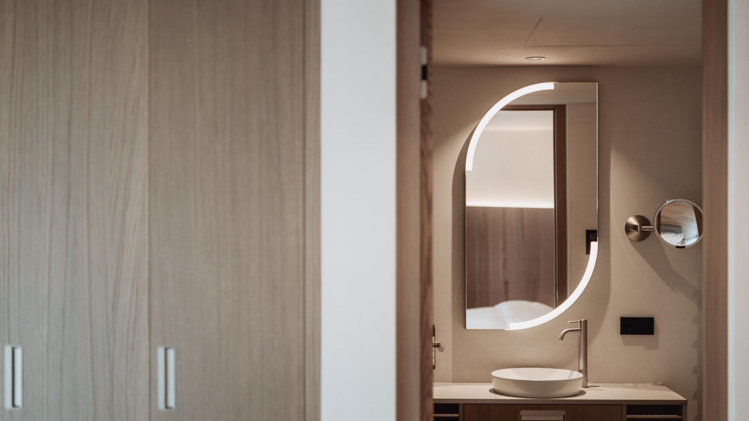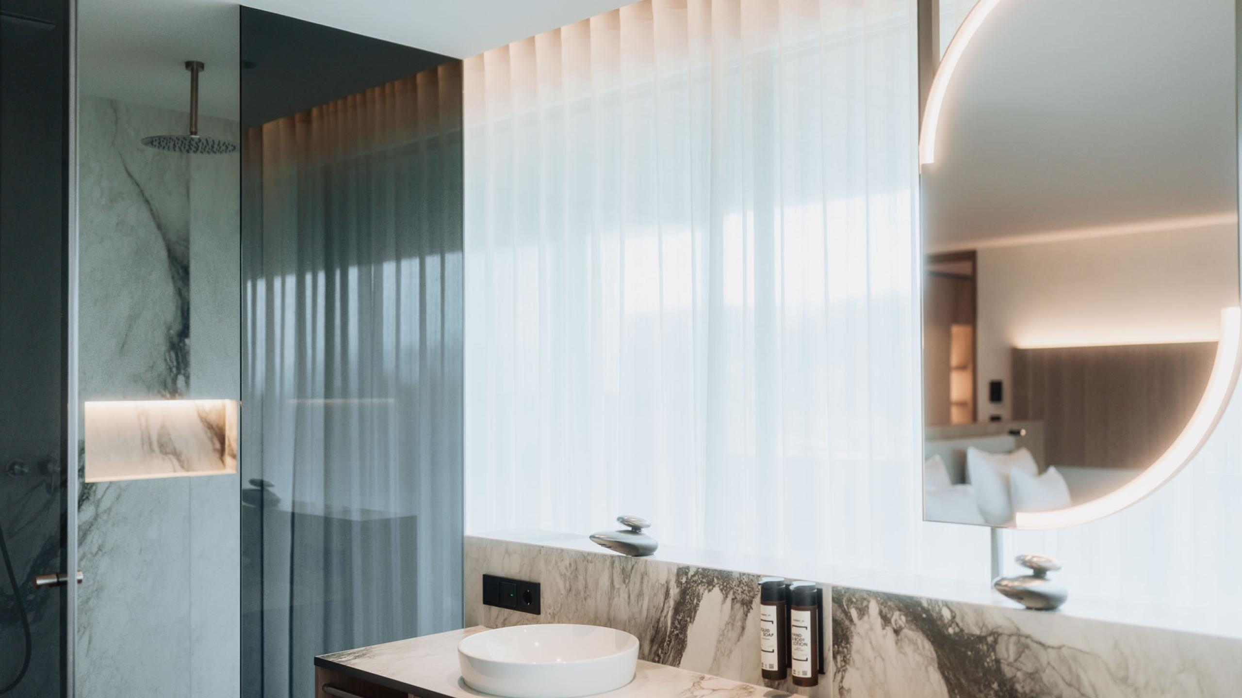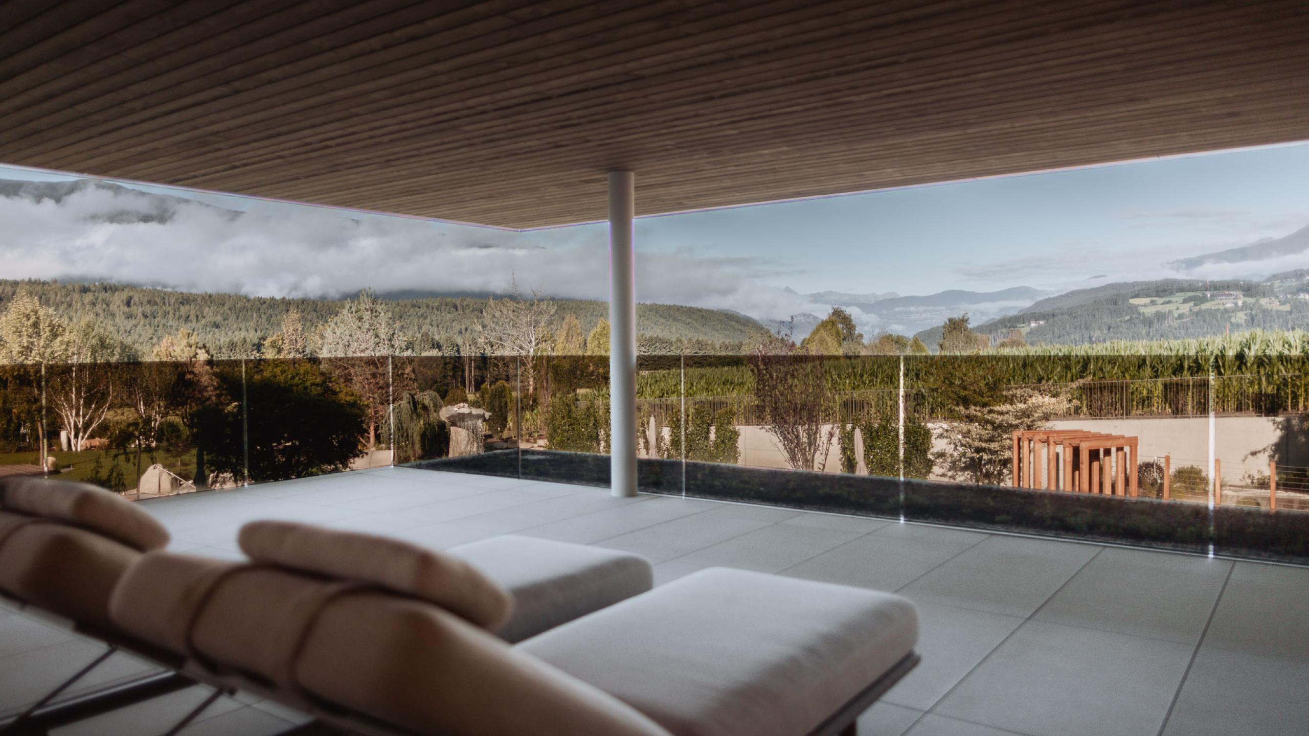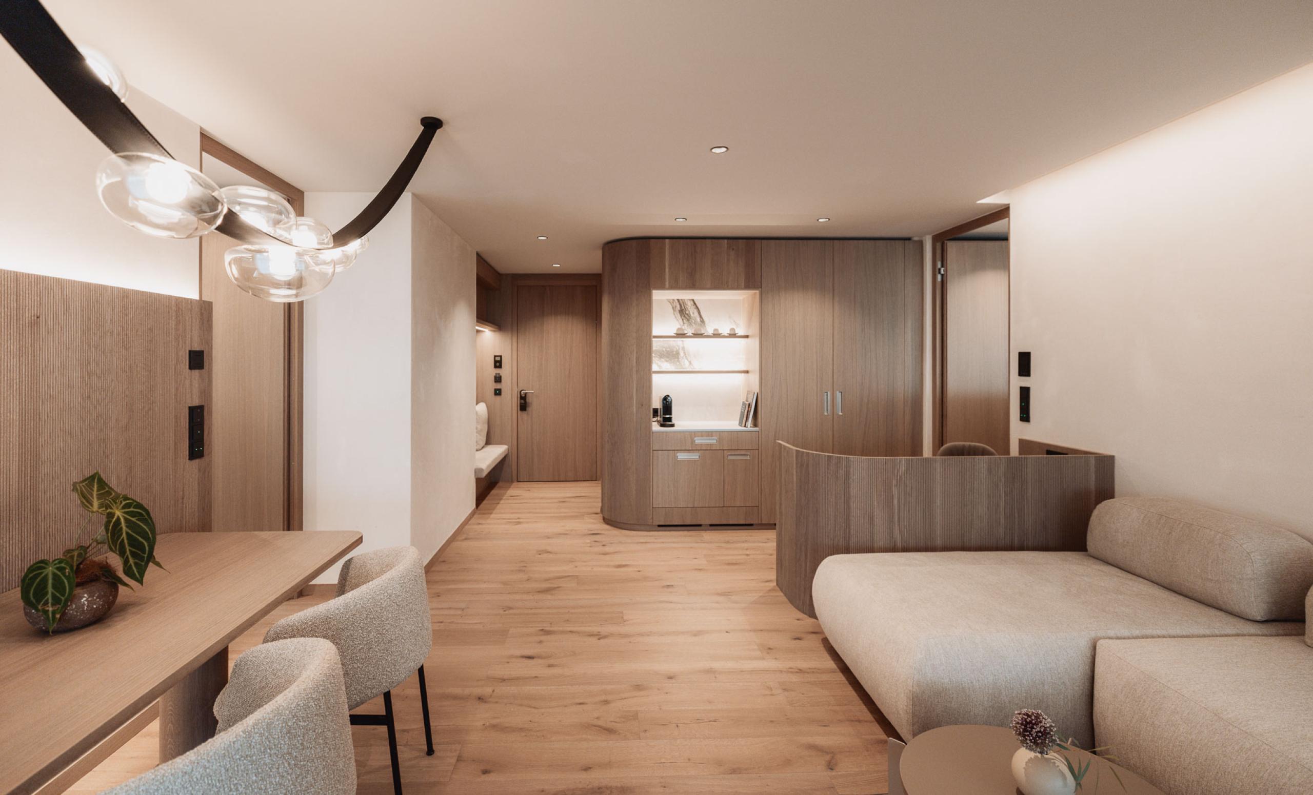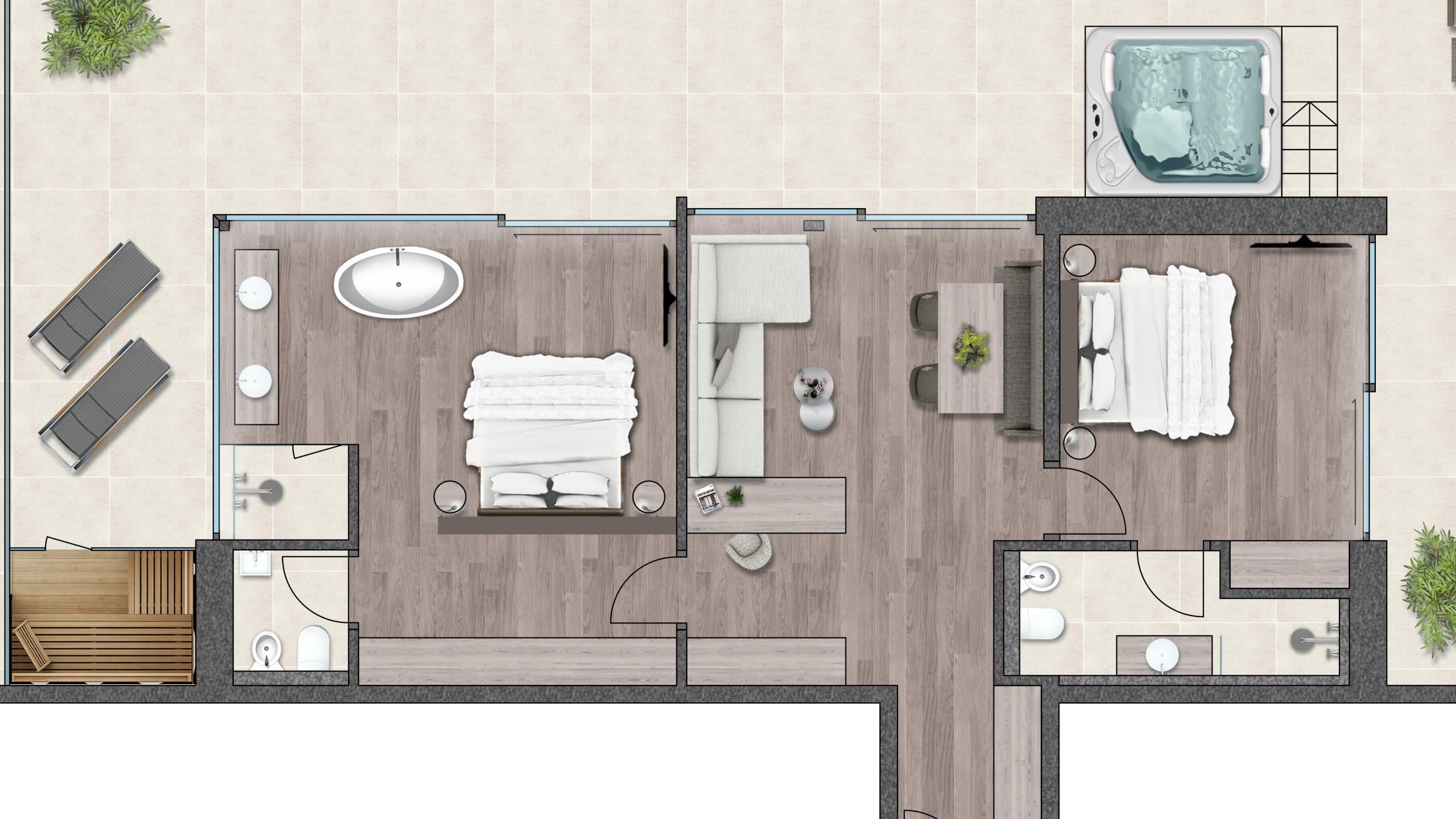 Die Suite Joy bietet Platz für vier Gäste und umfasst zwei separate Schlafzimmer, die jeweils über ein eigenes Badezimmer und eine Klimaanlage verfügen. Das Hauptschlafzimmer ist zusätzlich mit einer Designer-Badewanne ausgestattet. Ein abgetrenntes Wohnzimmer und eine Outdoor-Loggia sorgen für zusätzlichen Komfort. Der Holzboden im Zimmer verleiht der Suite eine warme und einladende Atmosphäre. Die 142m² große Terrasse bietet einen privaten Whirlpool, eine private Sauna und eine spektakuläre Panoramaaussicht nach Westen Richtung Issing. Die Suite ist im ersten Stock mit vollständig überdachter Terrasse oder im zweiten Stock mit teilweise überdachter Terrasse verfügbar.