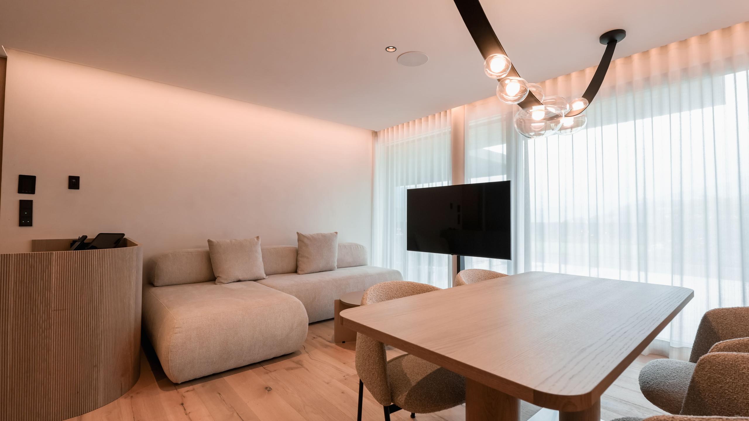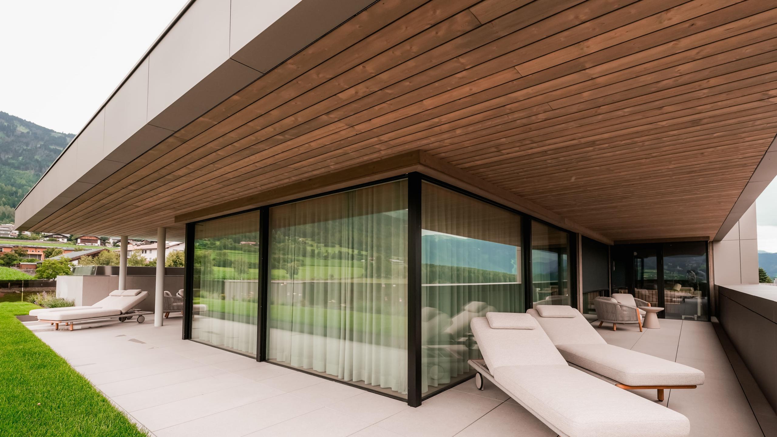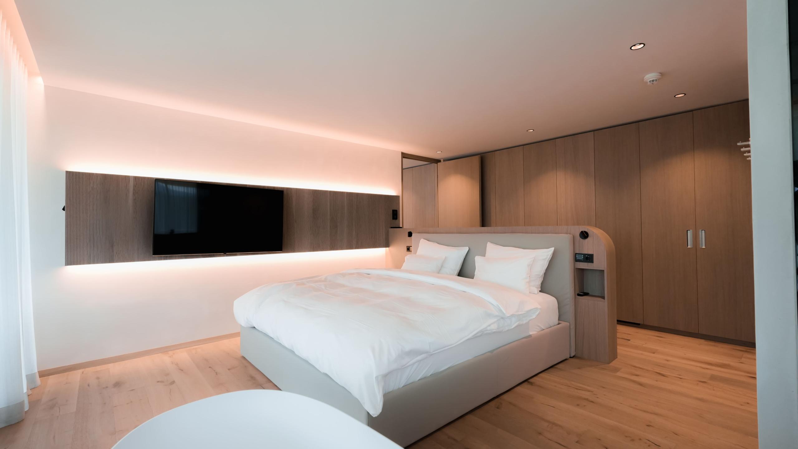 Die luxuriöse Suite Luss bietet Platz für vier Erwachsene und verfügt über zwei separate Schlafzimmer mit edlem Holzboden, Klimaanlage, jeweils einem eigenen Badezimmer sowie einer Designer-Badewanne im Hauptschlafzimmer. Ein stilvolles Wohnzimmer mit Sofa, Schreibtisch und gemütlicher Sitzecke rundet das Angebot ab. Die großzügige 214m² große Terrasse ist mit einem privaten Infinitypool, Whirlpool, privater Sauna und einer Outdoor-Loggia ausgestattet. Genießen Sie ein unvergleichliches Panorama (Richtung Issing).