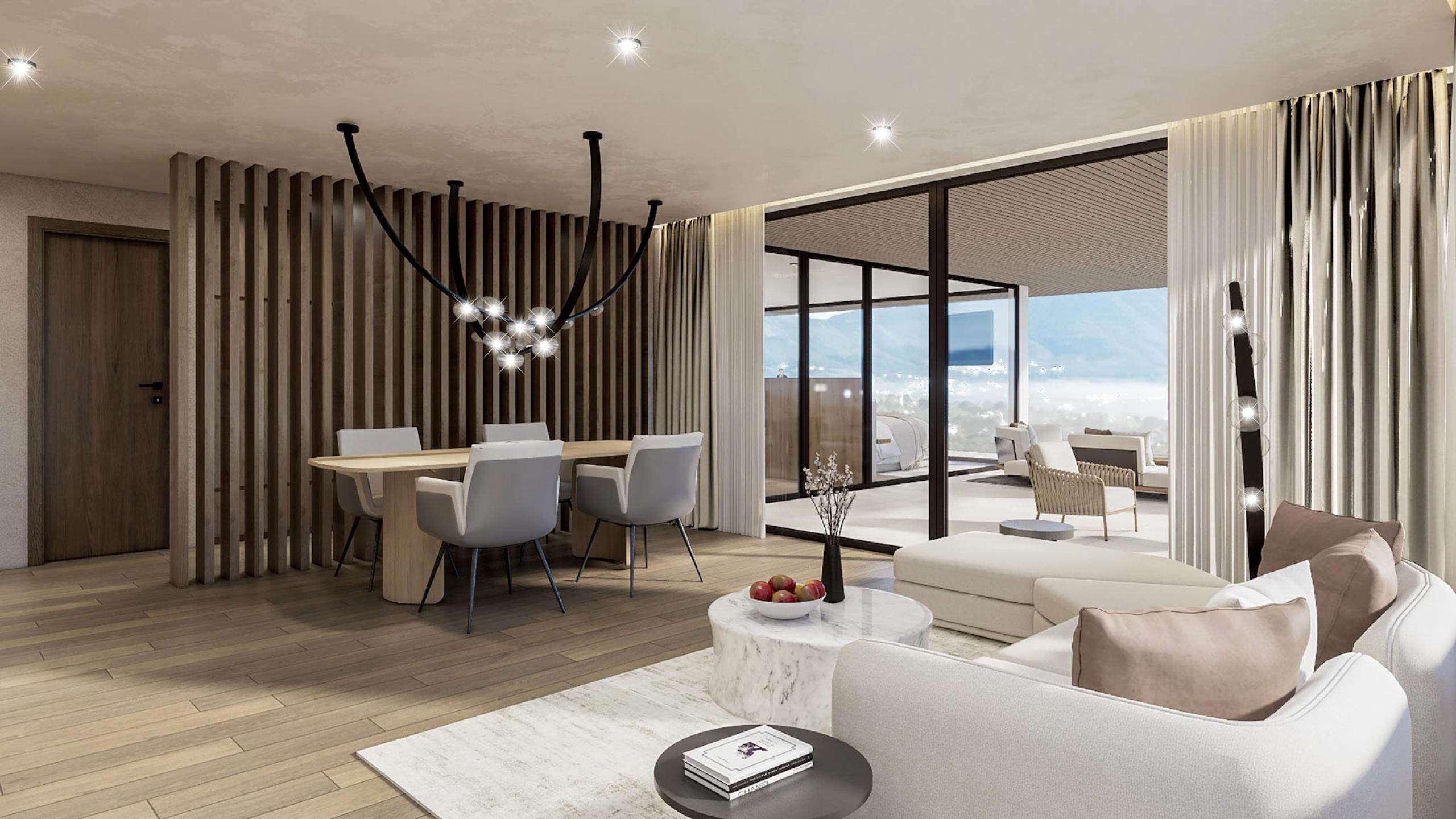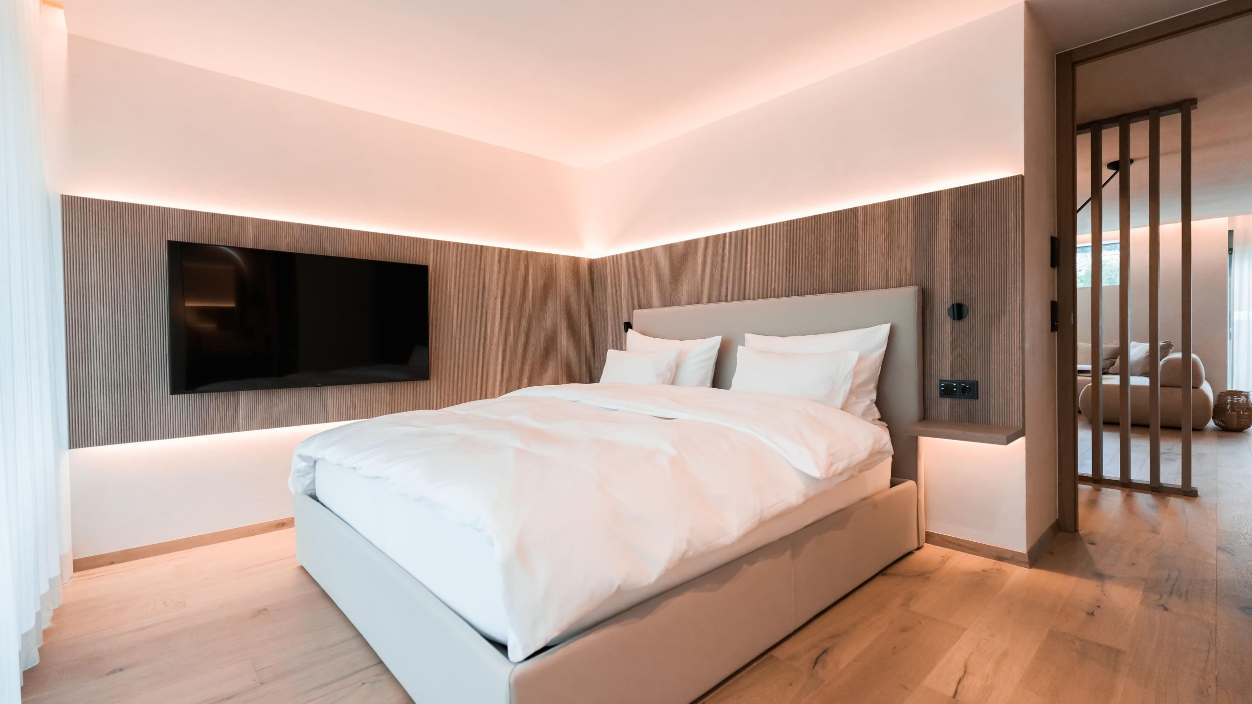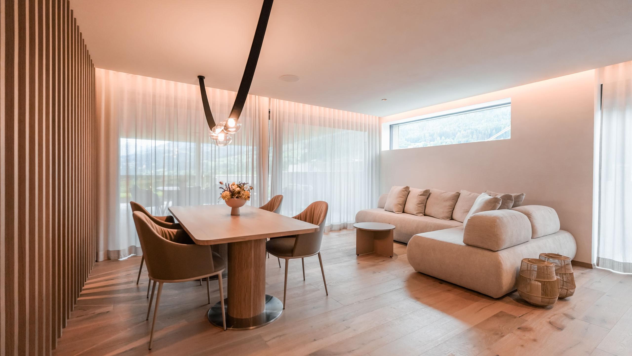Die Suite Luss Plus bietet Platz für bis zu sechs Personen und verfügt über einen Holzboden, eine Klimaanlage, eine Outdoor-Loggia sowie eine Designer-Badewanne im Hauptschlafzimmer. Die beeindruckende 196m² große Terrasse bietet einen privaten Infinitypool (3,5 x 8 m), einen Whirlpool, eine Sauna, eine Sitzecke und Liegen. Genießen Sie den herrlichen Blick nach Westen und ein unvergleichliches Panorama Richtung Issing.