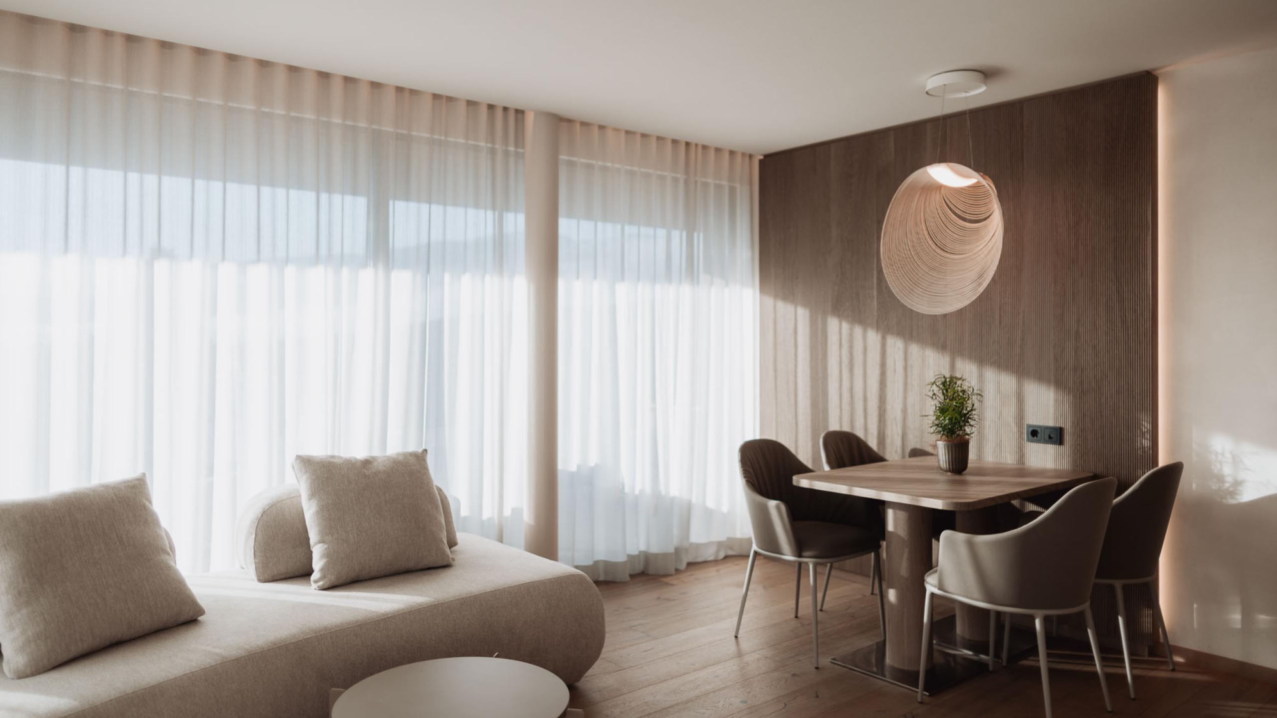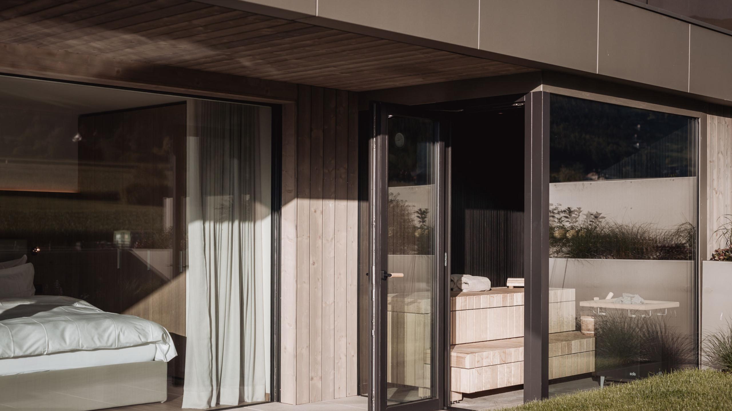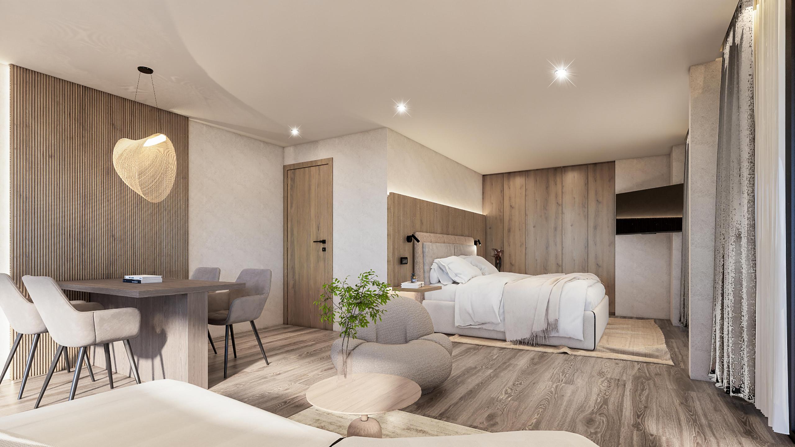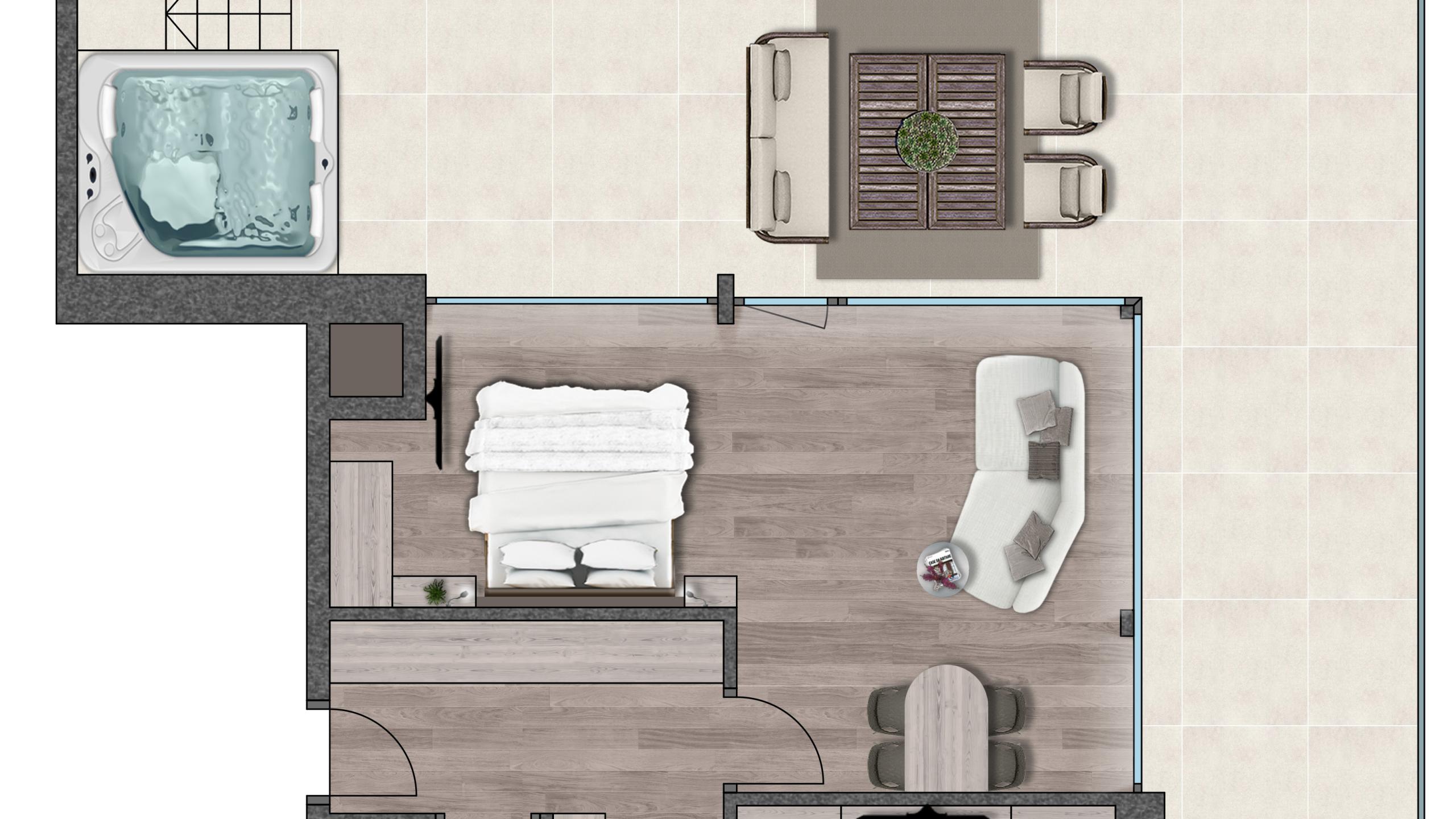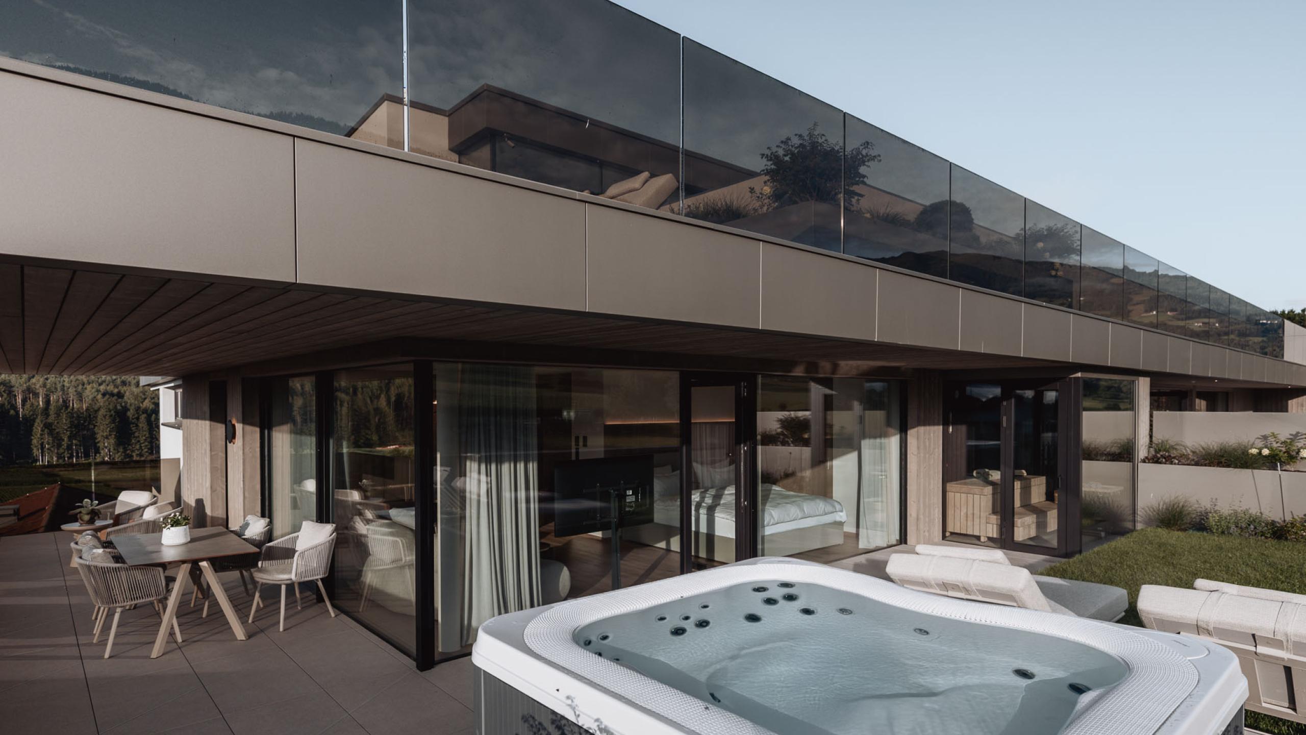 Die Suite Ray überzeugt mit einem atemberaubenden Blick auf die Berge in Richtung Platten und mit dem Licht der Morgensonne. Sie verfügt über elegante Holzböden, Klimaanlage, zwei separate Schlafzimmer, ein Badezimmer und ein Sofa im Hauptschlafzimmer. Die großzügige Terrasse von 101m² bietet einen Whirlpool, eine Sauna und bequeme Liegen – perfekt für Momente purer Entspannung.