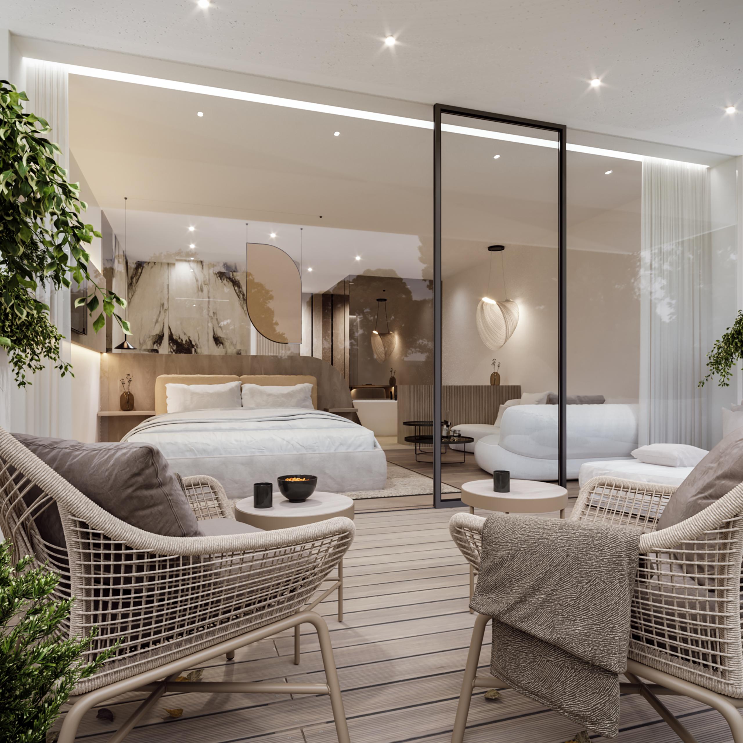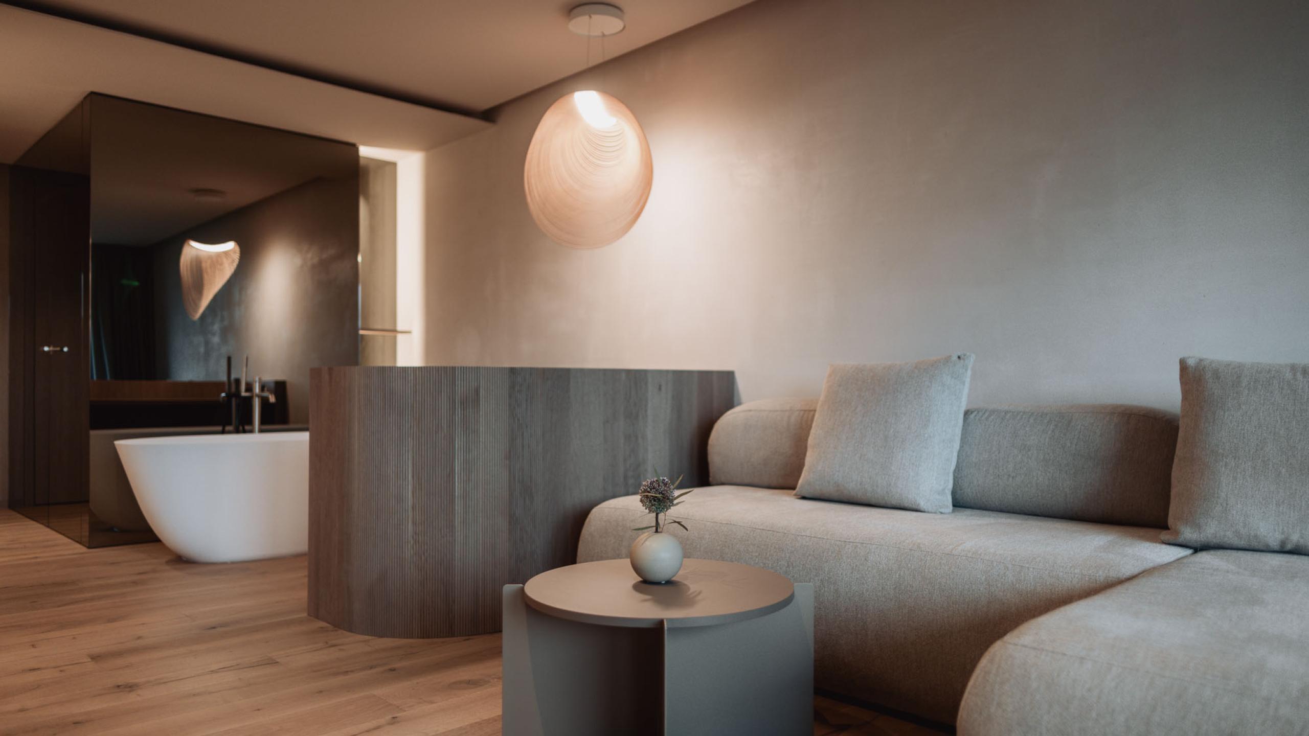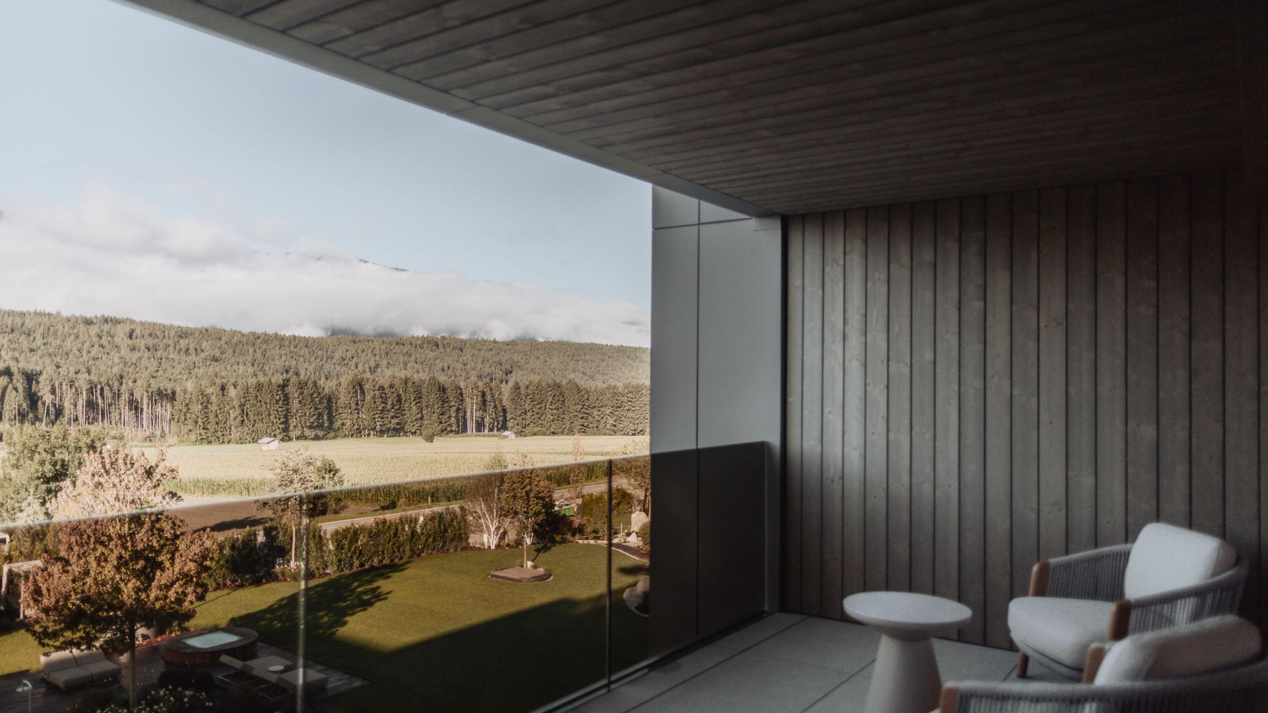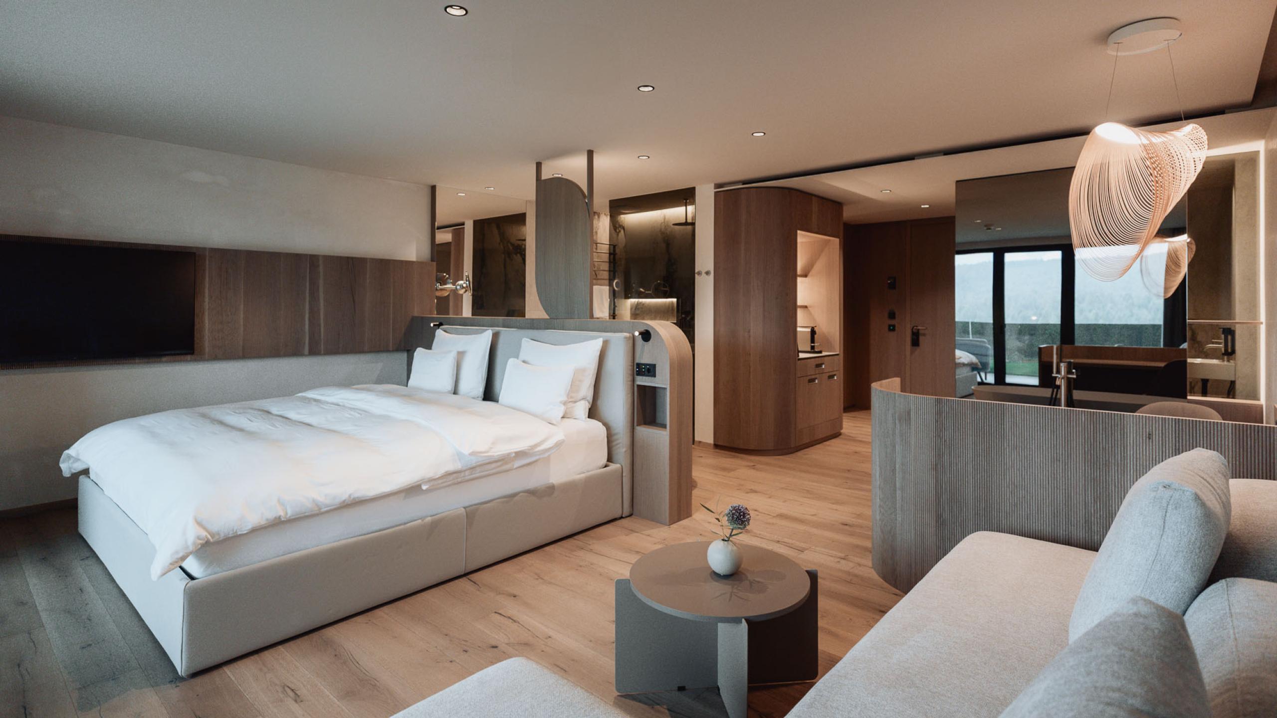 Die Suite Sol überzeugt mit edlem Holzboden, Klimaanlage, einem stilvollen Doppelbett, einer Schlafcouch, einer freistehenden Badewanne und einer Loggia. Die nach Süden ausgerichtete Terrasse (15m²) bietet einen malerischen Blick auf die Berge Richtung Kronplatz. Ein begehbarer Kleiderschrank rundet das exklusive Angebot ab.