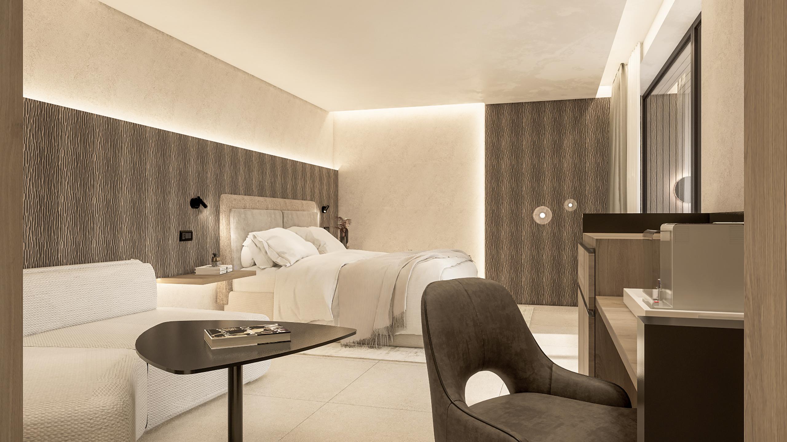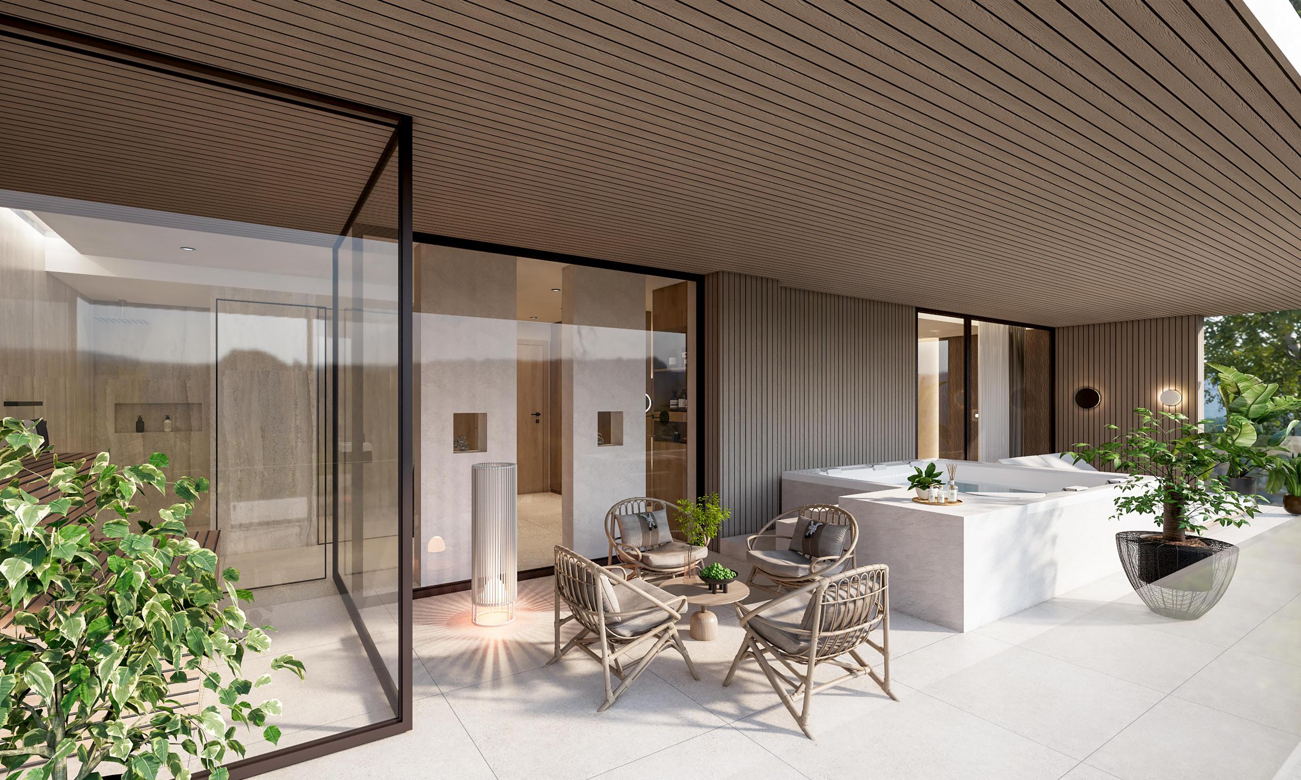 Die Suite Vie bietet Platz für zwei Personen und begeistert mit einem gemütlichen Schlafzimmer, ausgestattet mit einem Sofa, modernem Fliesenboden und Klimaanlage. Die großzügige Terrasse (26m²) lädt mit einem privaten Whirlpool, einer Sauna, bequemen Liegen und einer einladenden Sitzecke zum Entspannen ein. Genießen Sie die nordseitige Aussicht auf den Berg Kofl.
