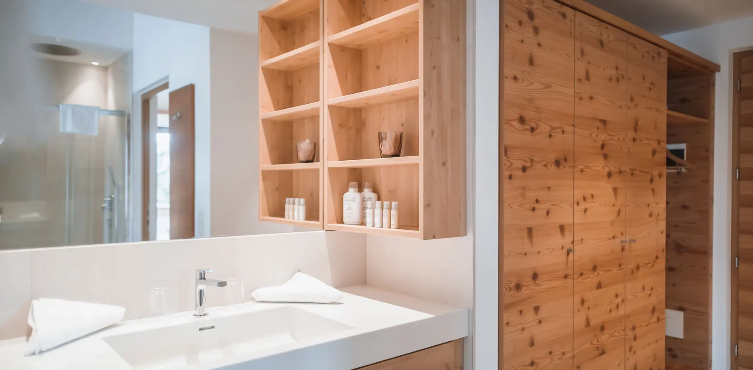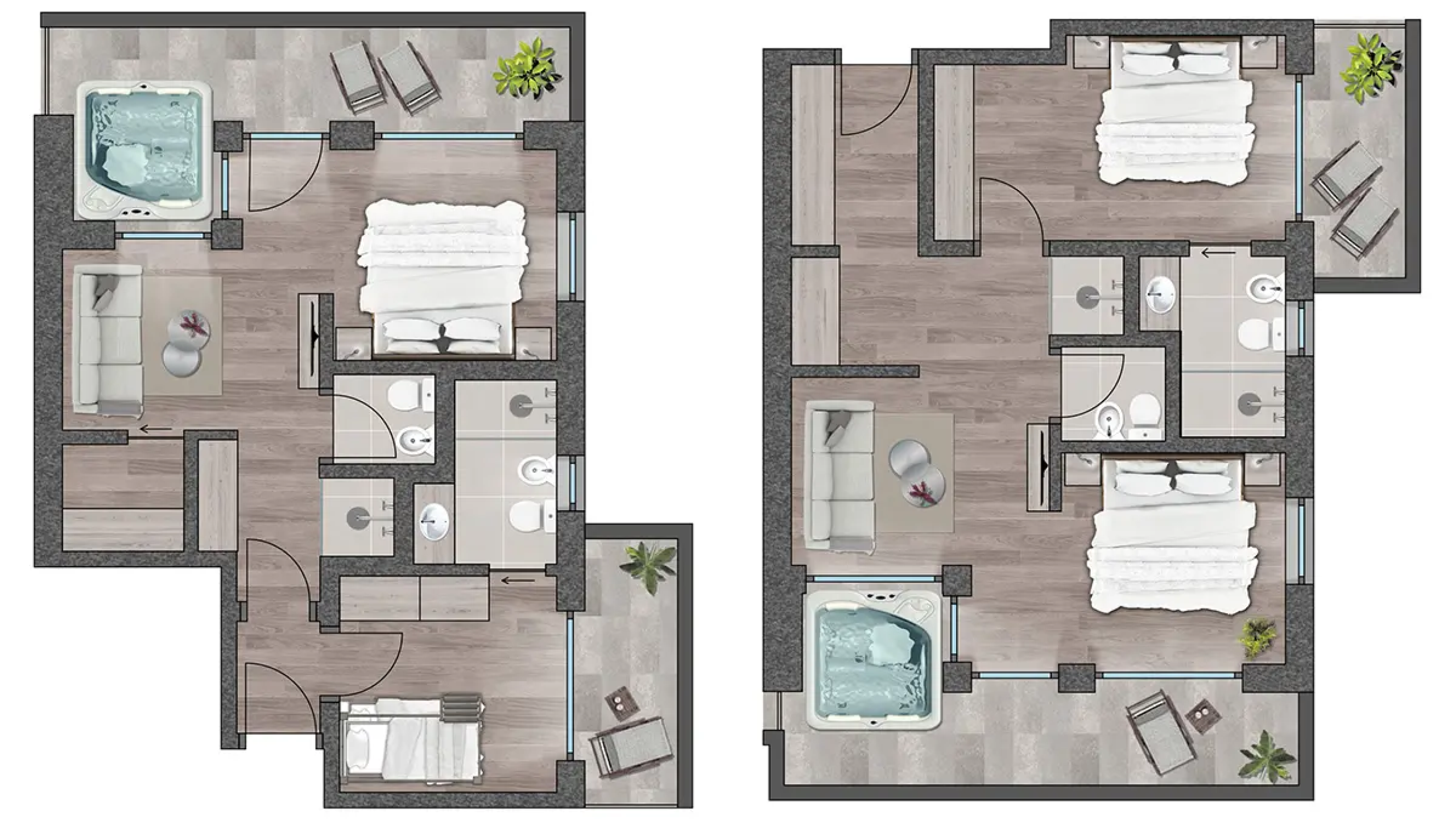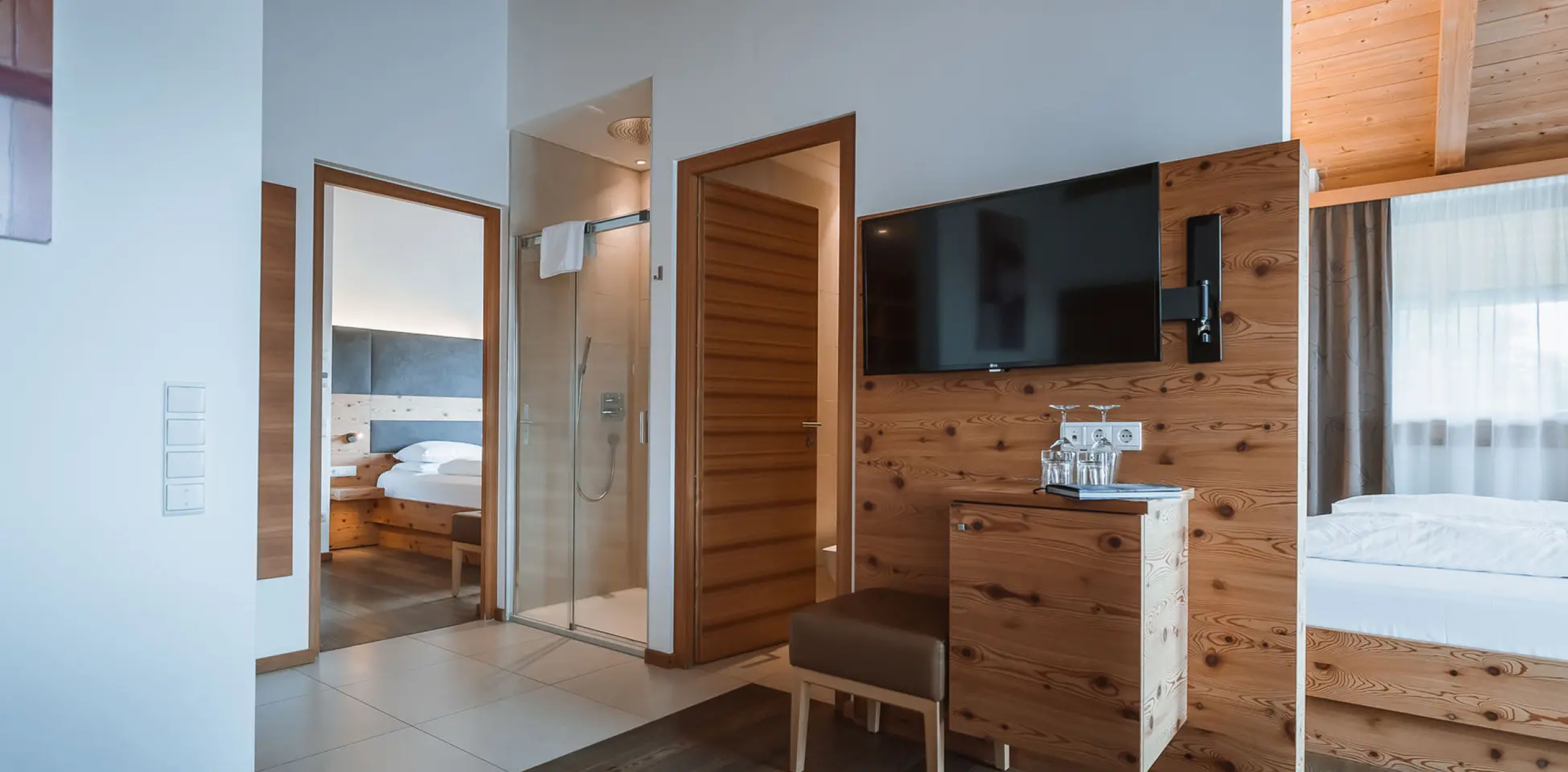 Die gemütliche Wellness-Suite befindet sich im Bestandshaus und bietet zwei separate Schlafzimmer, zwei Badezimmer und einen großzügigen Wohnbereich. Sie ist mit Parkettboden ausgestattet und verfügt über Klimaanlage, eine Terrasse mit Whirlpool – je nach Lage mit Blick auf den Kronplatz oder ins Dorf.