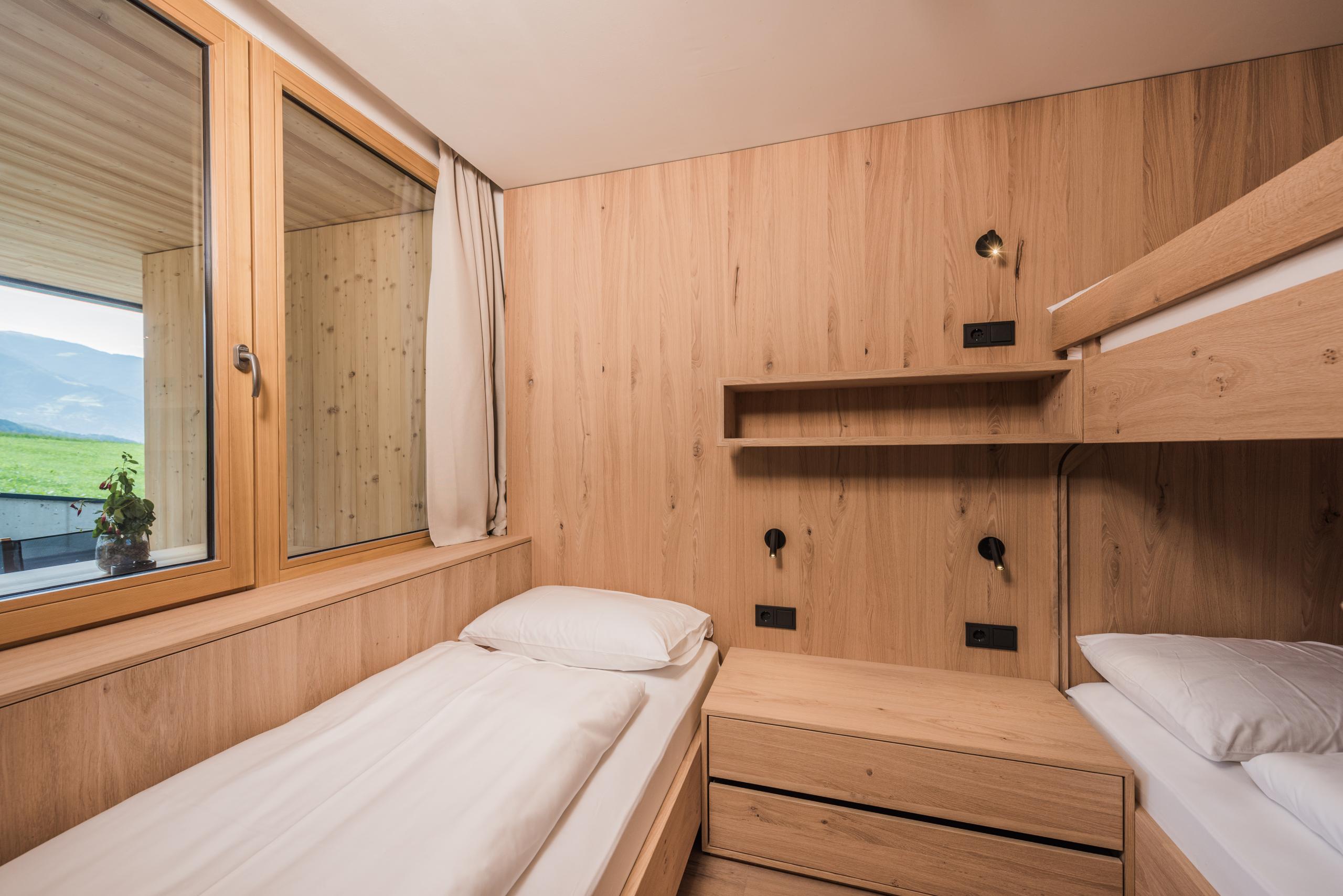 Suite aus heimischen Materialien im neuen Gartenflügel in exklusiver Sonnenlage, mit Wohnecke mit Quellbrunnen, 30 m² großer, privater Gartenloggia, Outdoor-Wohnbereich und direktem Zugang zum Garten sowie separatem Kinderzimmer mit einem Stockbett, sowie ein Einzelbett, Badezimmer mit Duo-XL-Dusche und separatem WC. Kostenloser Tiefgaragenstellplatz. Mindestbelegung: 3 Personen (Vollzahler). Eine Zweierbelegung ist nur außerhalb der Hauptferienzeit und nach Absprache möglich. Bitte berücksichtigen Sie, dass wir Ihnen in diesem Fall einen Aufschlag auf den Tagespreis berechnen.