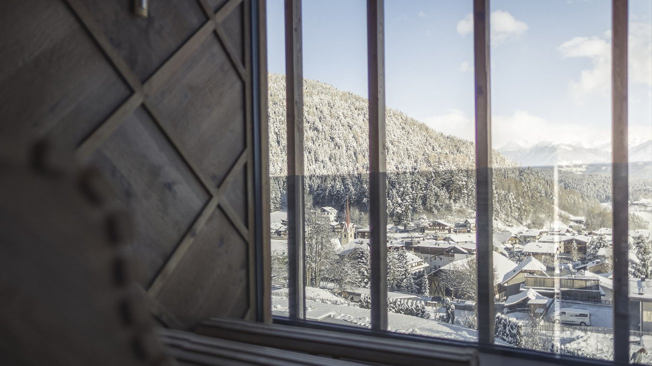 Villaggio di montagna innevato visto attraverso una grande finestra
