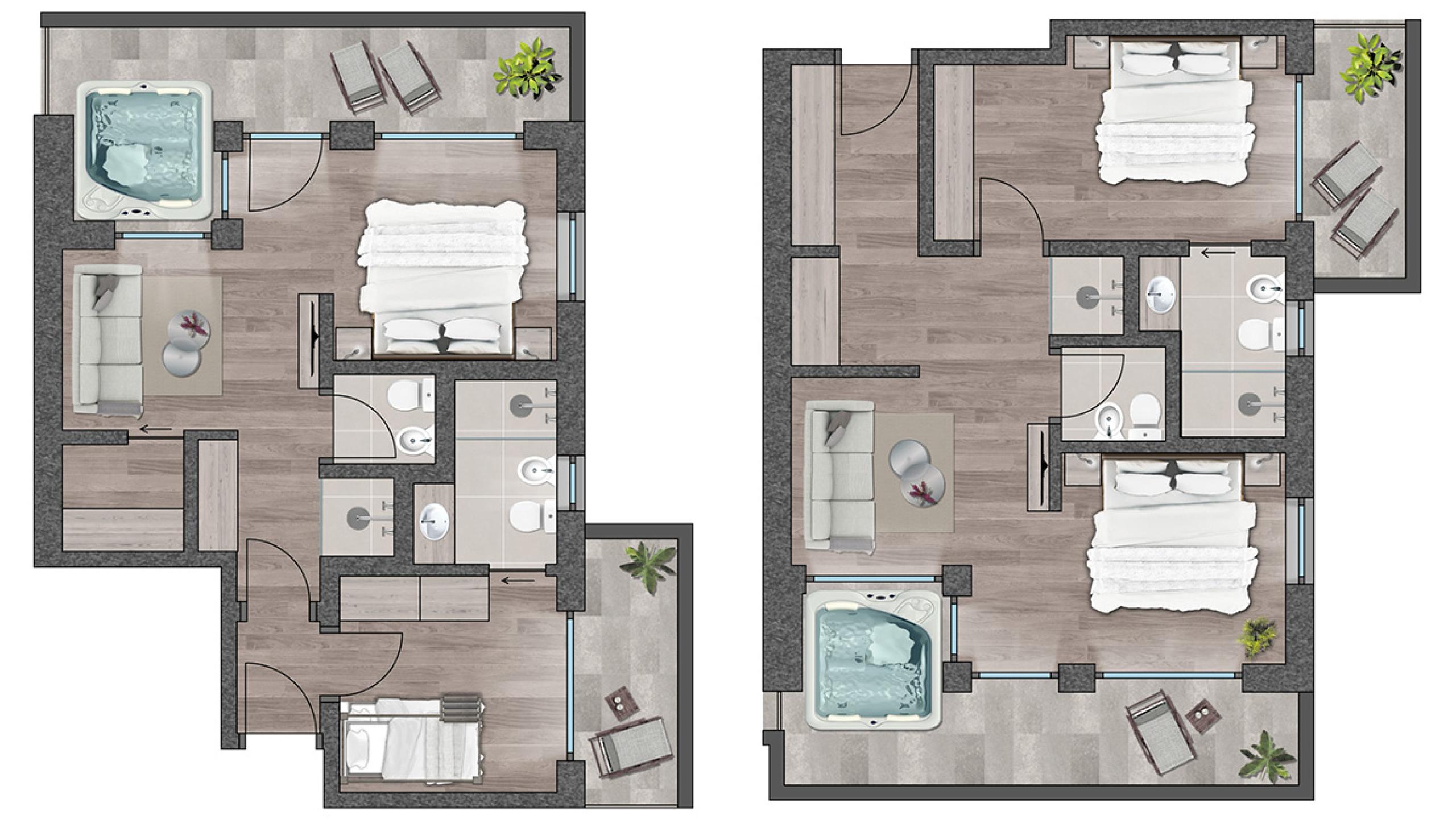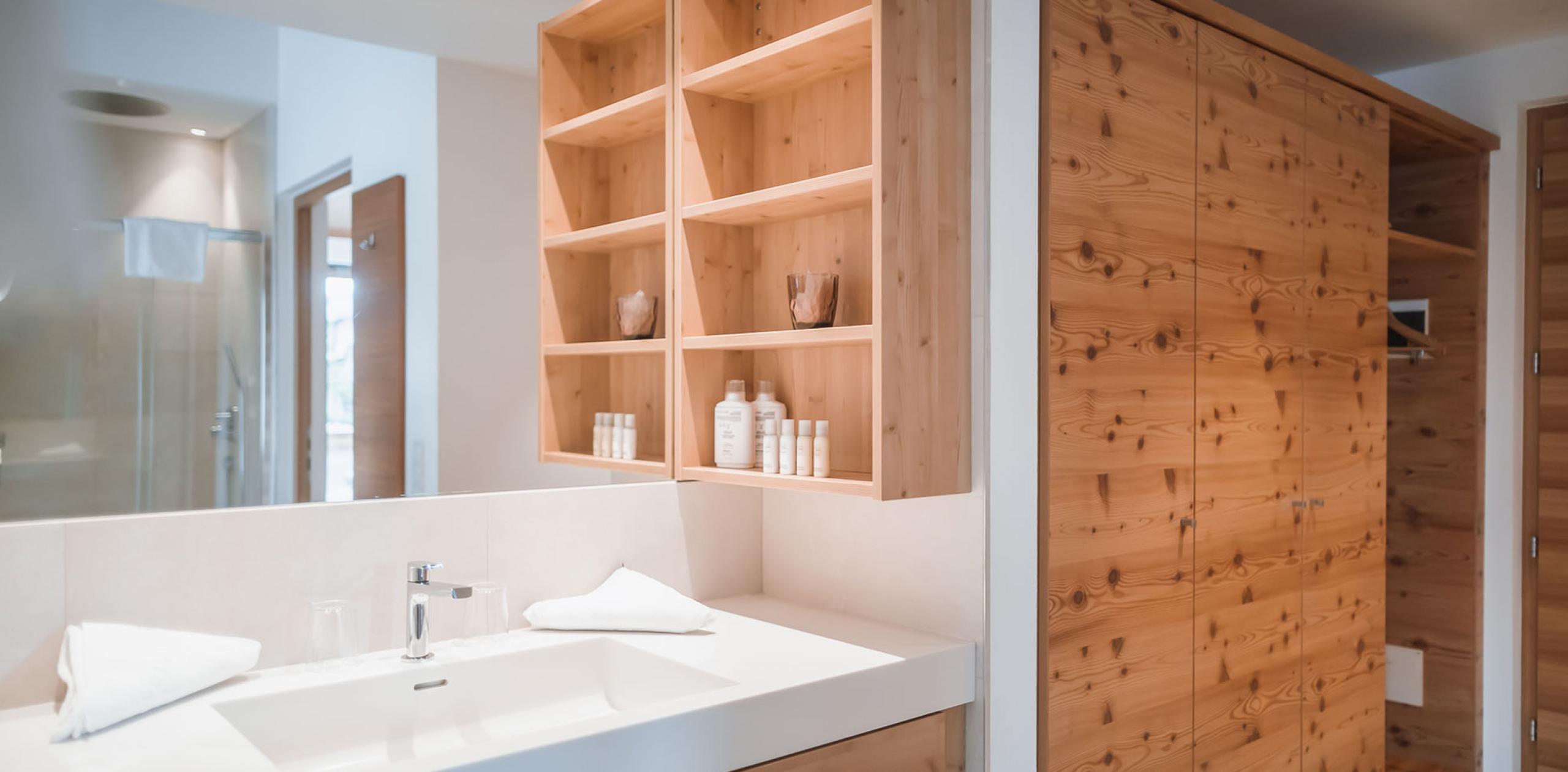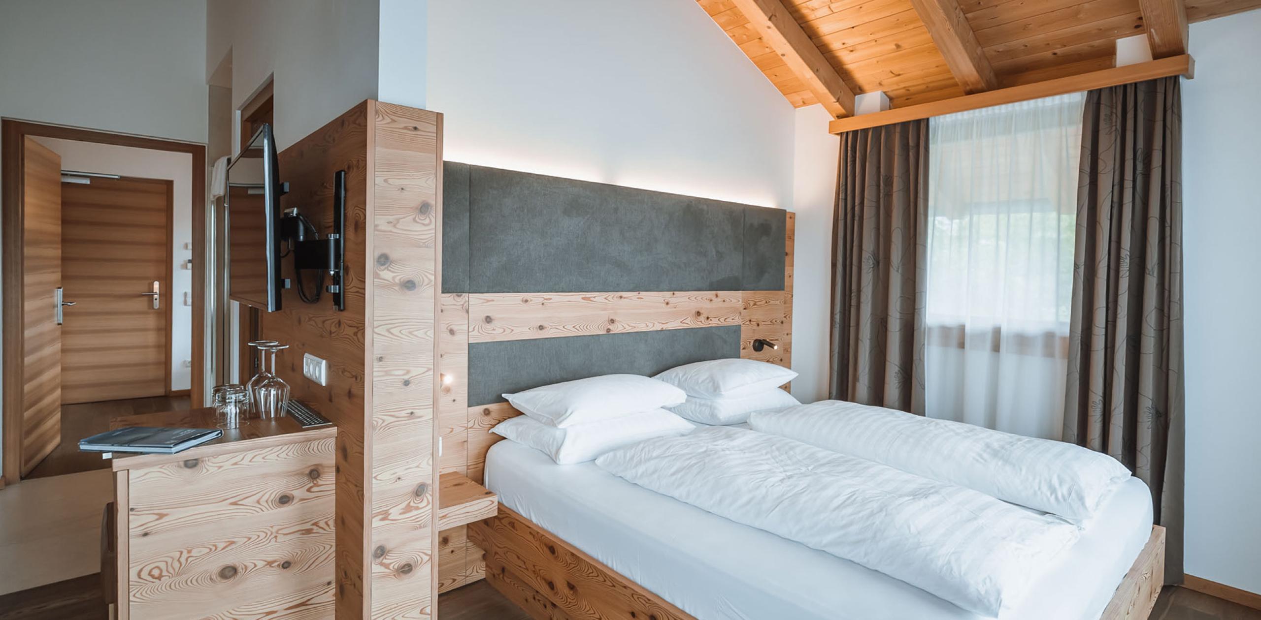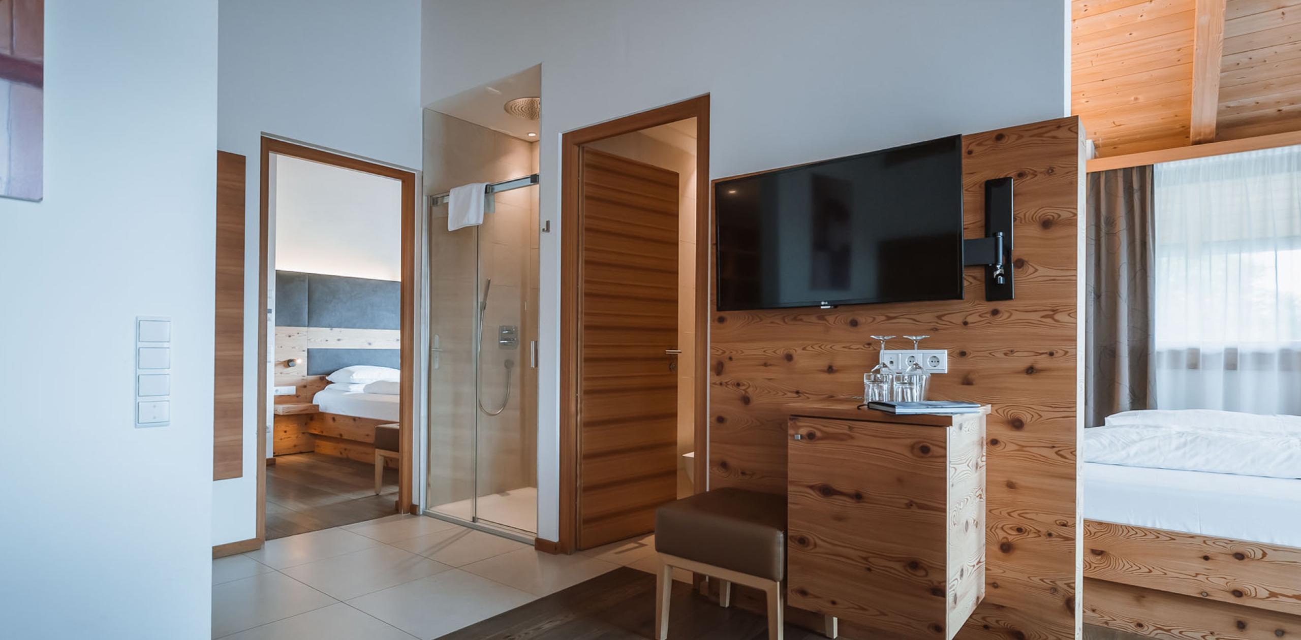 La confortevole Wellness Suite si trova nella struttura preesistente e dispone di due camere da letto separate, due bagni e un ampio soggiorno. È dotata di pavimento in parquet, aria condizionata e di una terrazza con vasca idromassaggio – orientata verso il Plan de Corones oppure verso il paese, a seconda della posizione della suite.