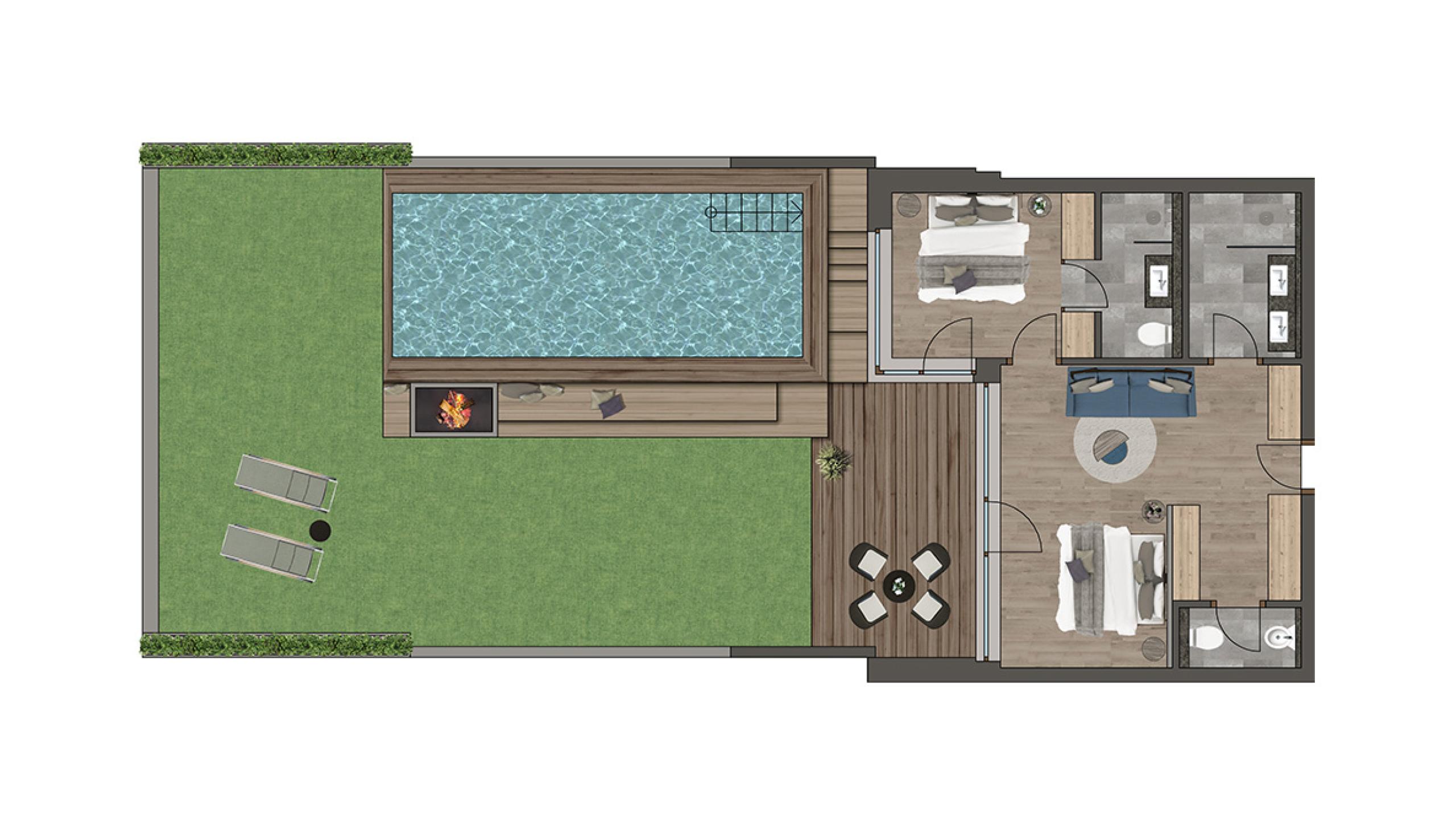 Suite lussuosa con infinity pool privata (7 x 3,5m, riscaldata tutto l’anno a 32 °C), camino, ampio giardino e loggia panoramica con vista che va dalle valli fino alle vette alpine. La suite dispone di due camere separate e due bagni. Parcheggio sotterraneo gratuito.